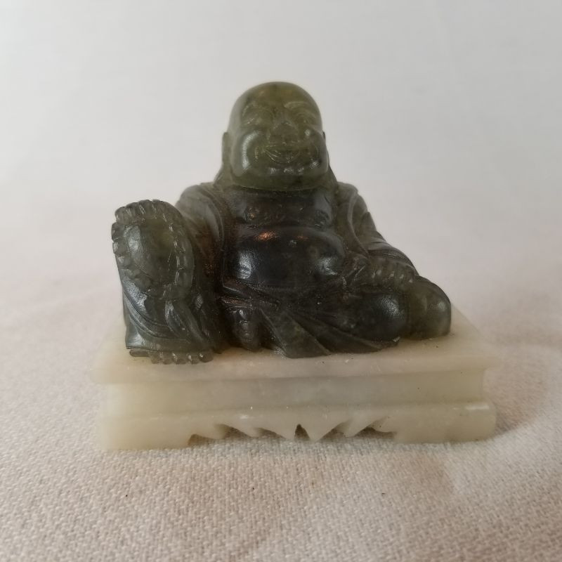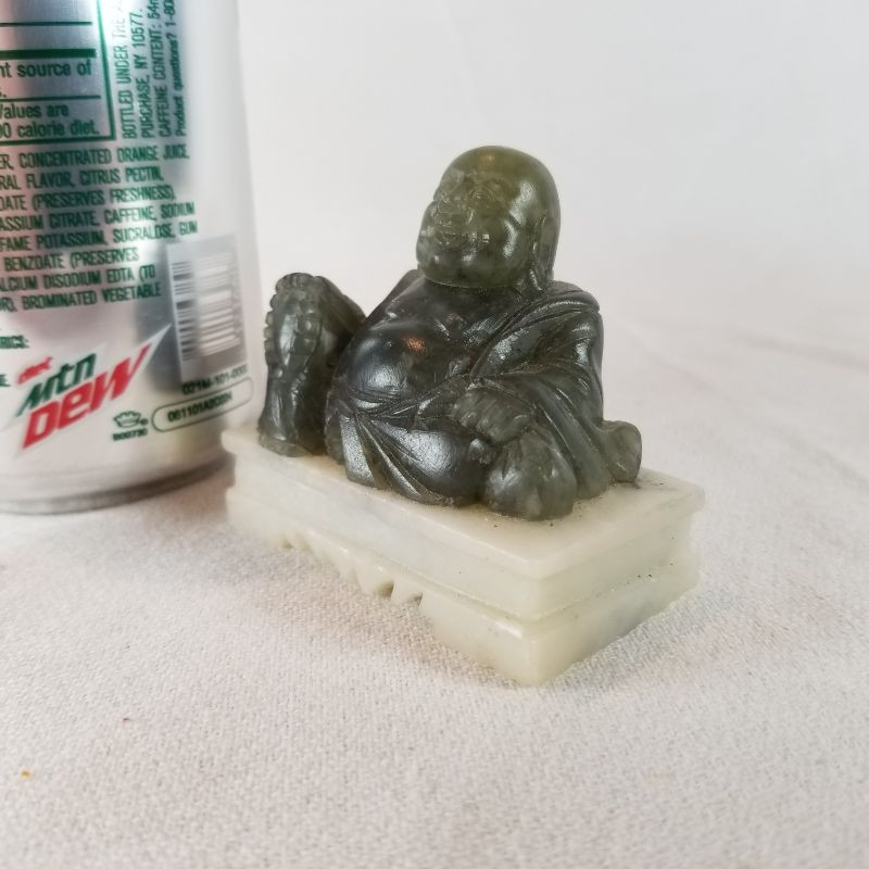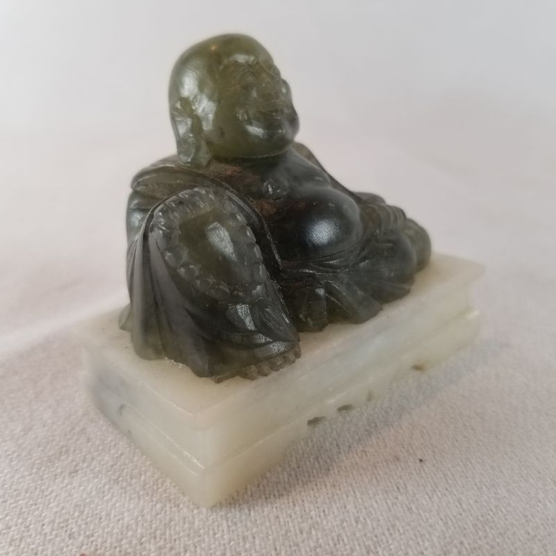 This unique miniature Buddha is carved from Jade and sits on a carved marble base. Very nice. 2-1/2-inches tall X 2-3/4-inches long. In great condition. Quite unusual.