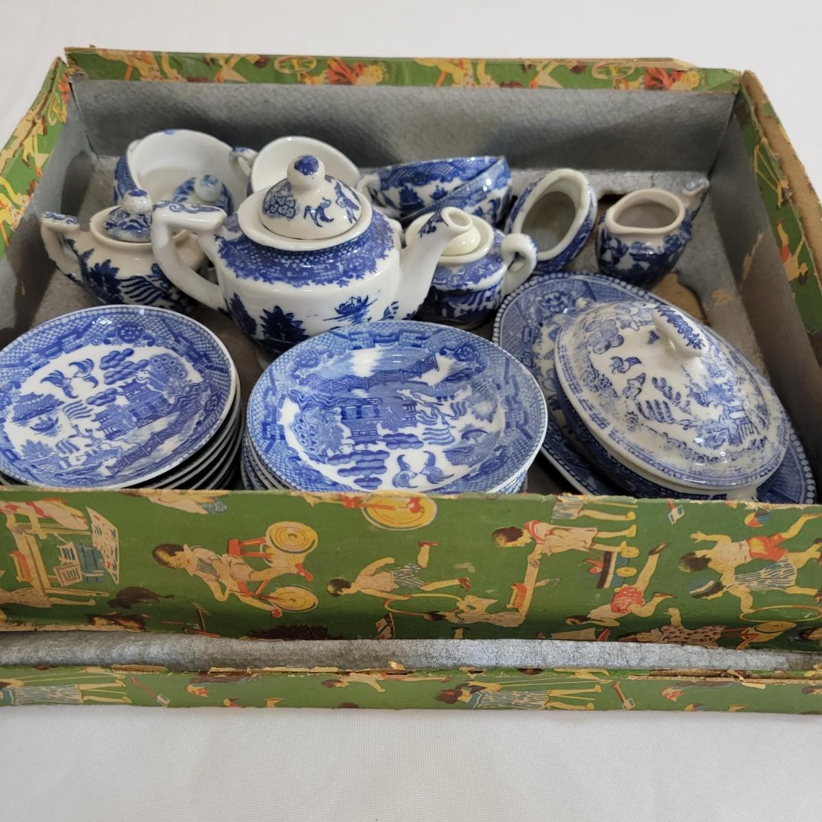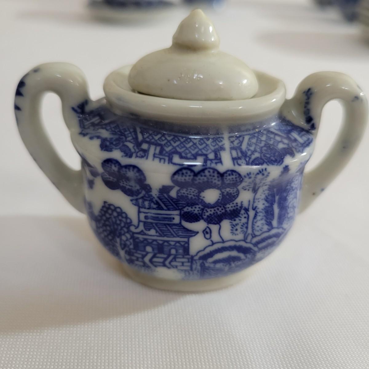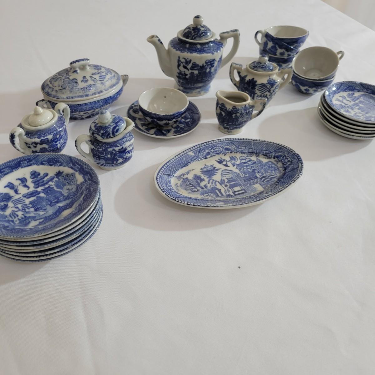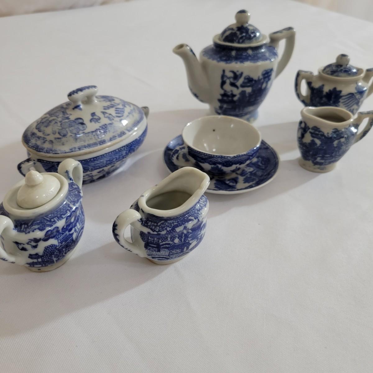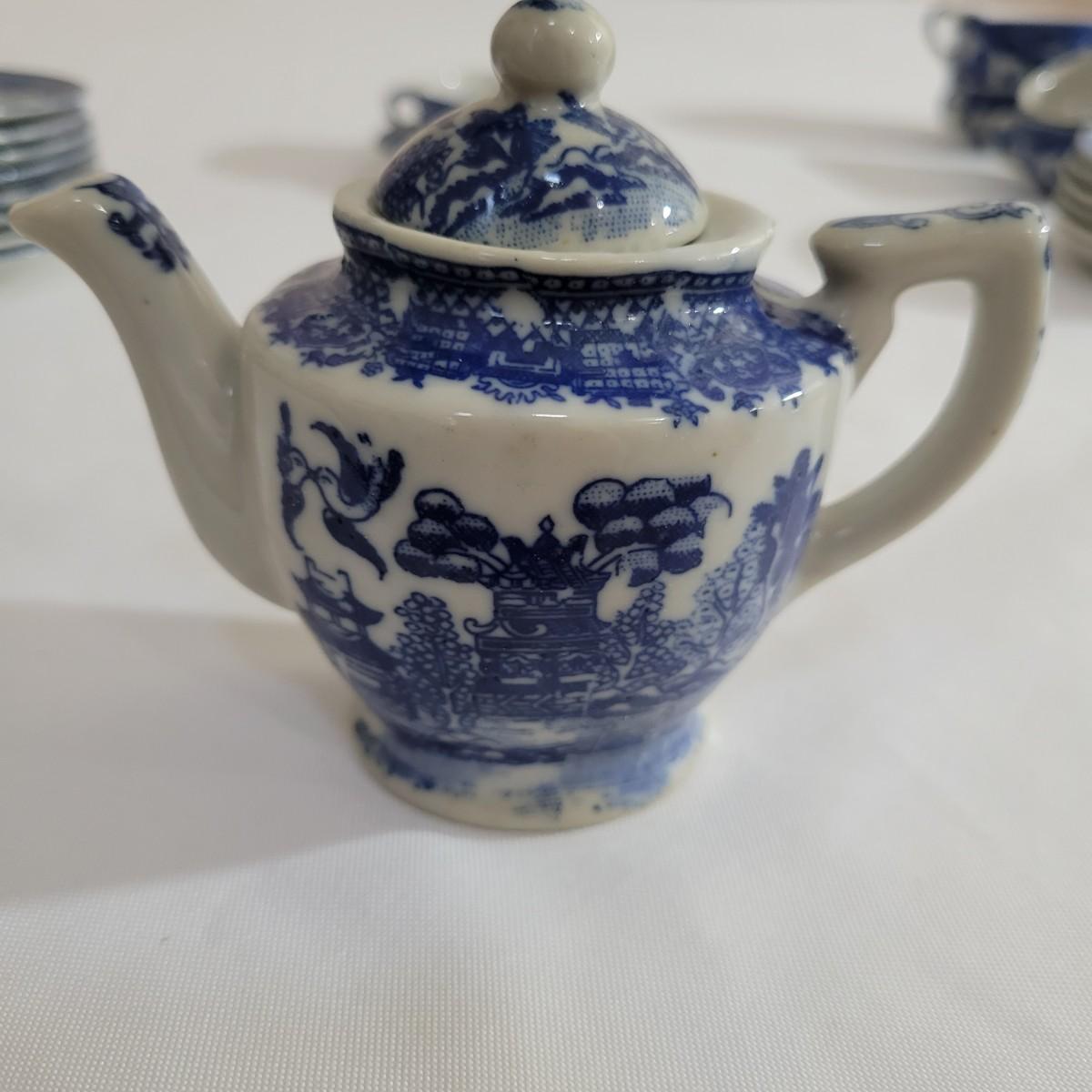A collection of miniature tea set pieces made in Japan that are in good condition. One plate does have a chip and one piece is faded. Lot includes six teacups, eight plates, seven cup plates, a tea pot, two urns, two pitchers, a large platter and a large lidded bowl. Tea pot measures approximately 4.5" x 2.5" x 4". Pictured box is included. Shipping available
