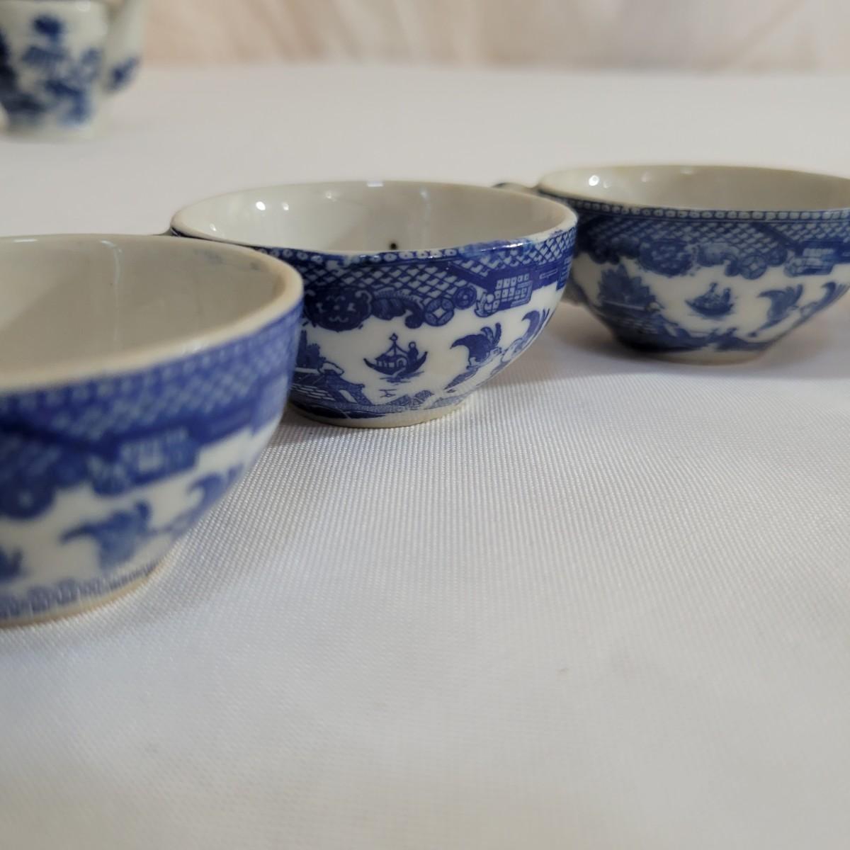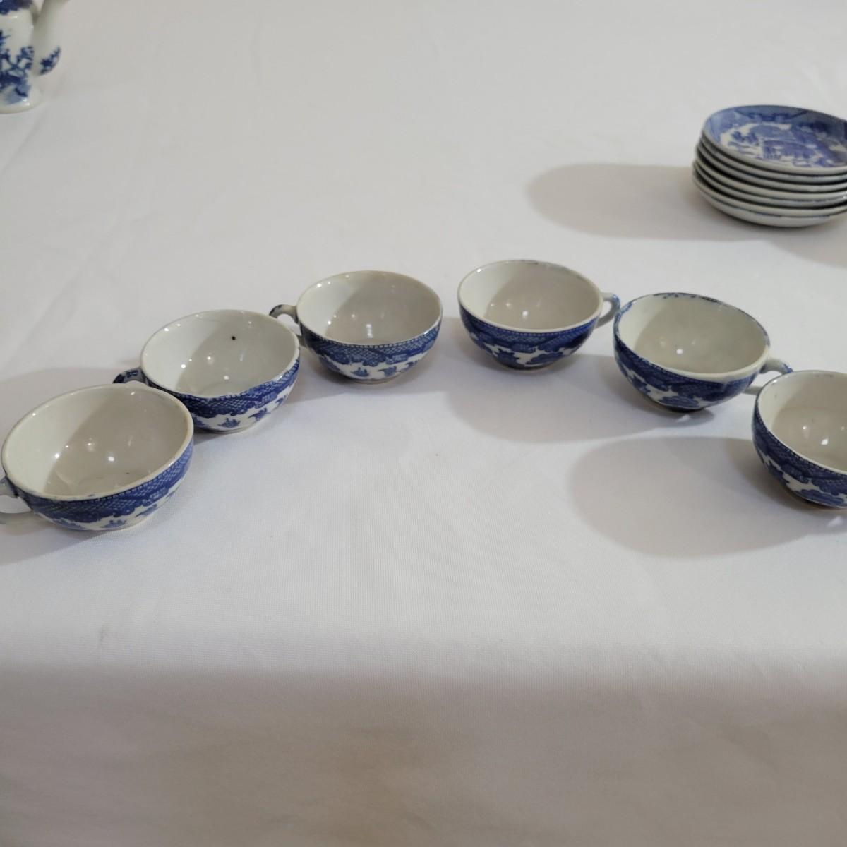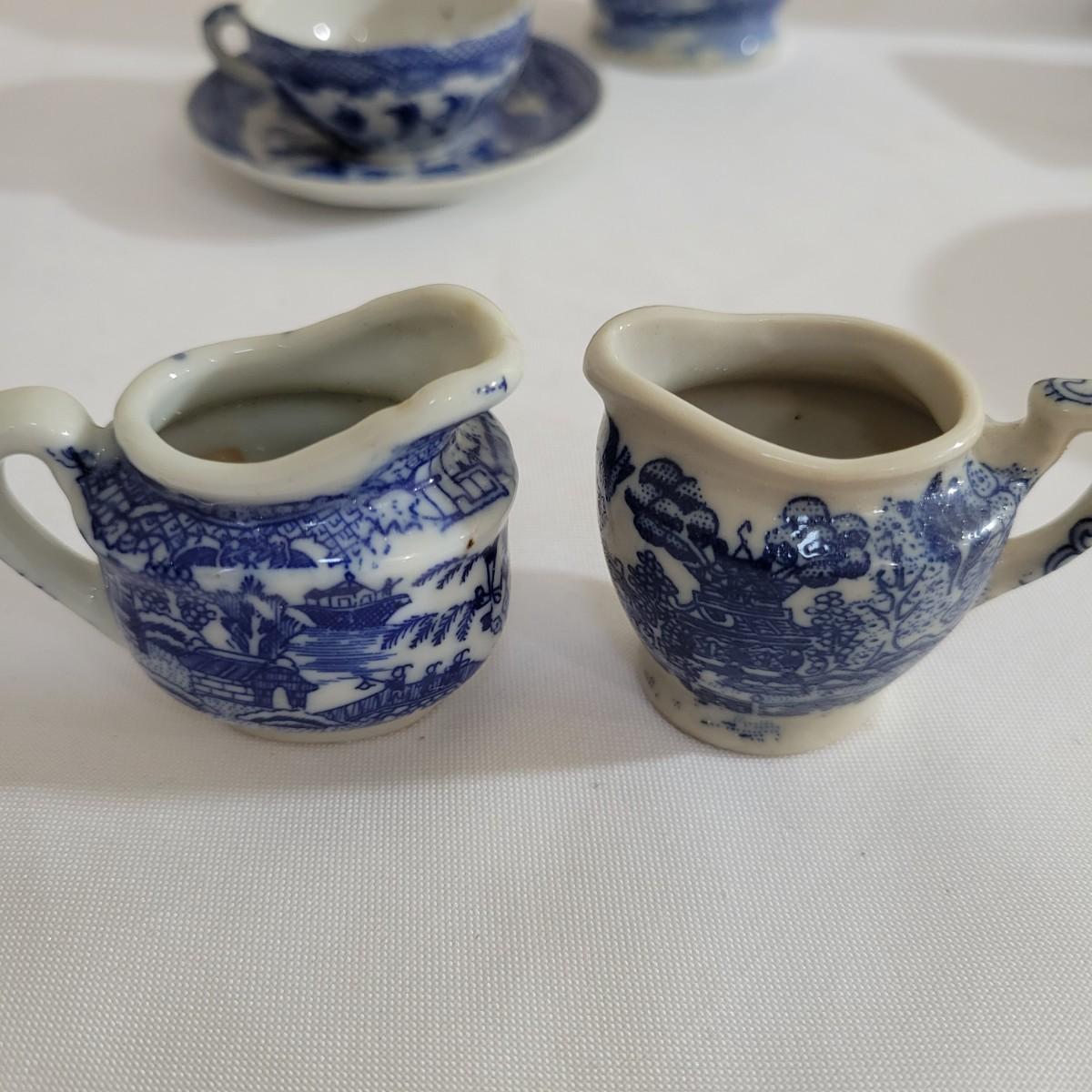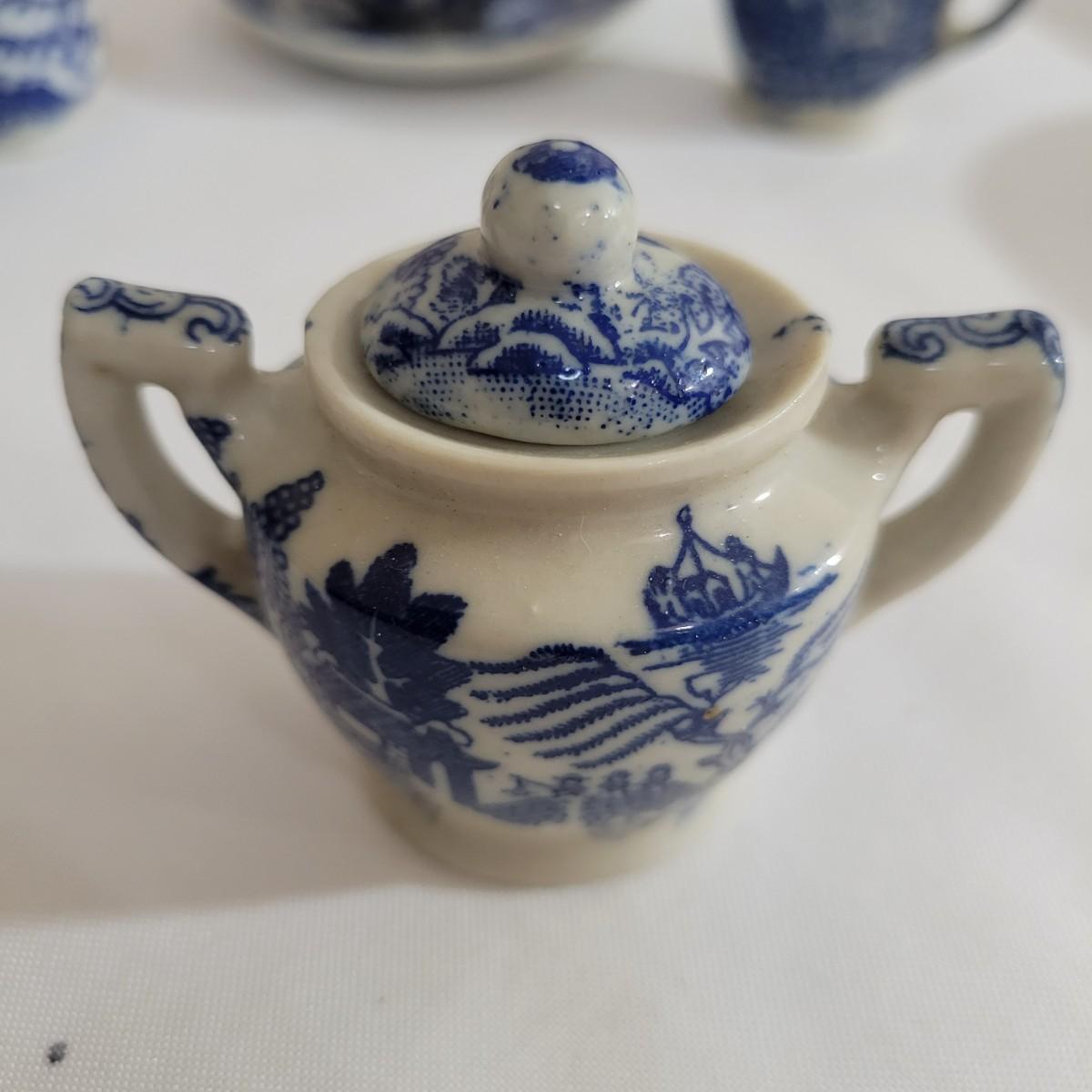A collection of miniature tea set pieces made in Japan that are in good condition. One plate does have a chip and one piece is faded. Lot includes six teacups, eight plates, seven cup plates, a tea pot, two urns, two pitchers, a large platter and a large lidded bowl. Tea pot measures approximately 4.5" x 2.5" x 4". Pictured box is included. Shipping available