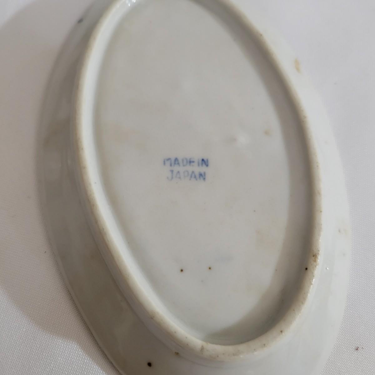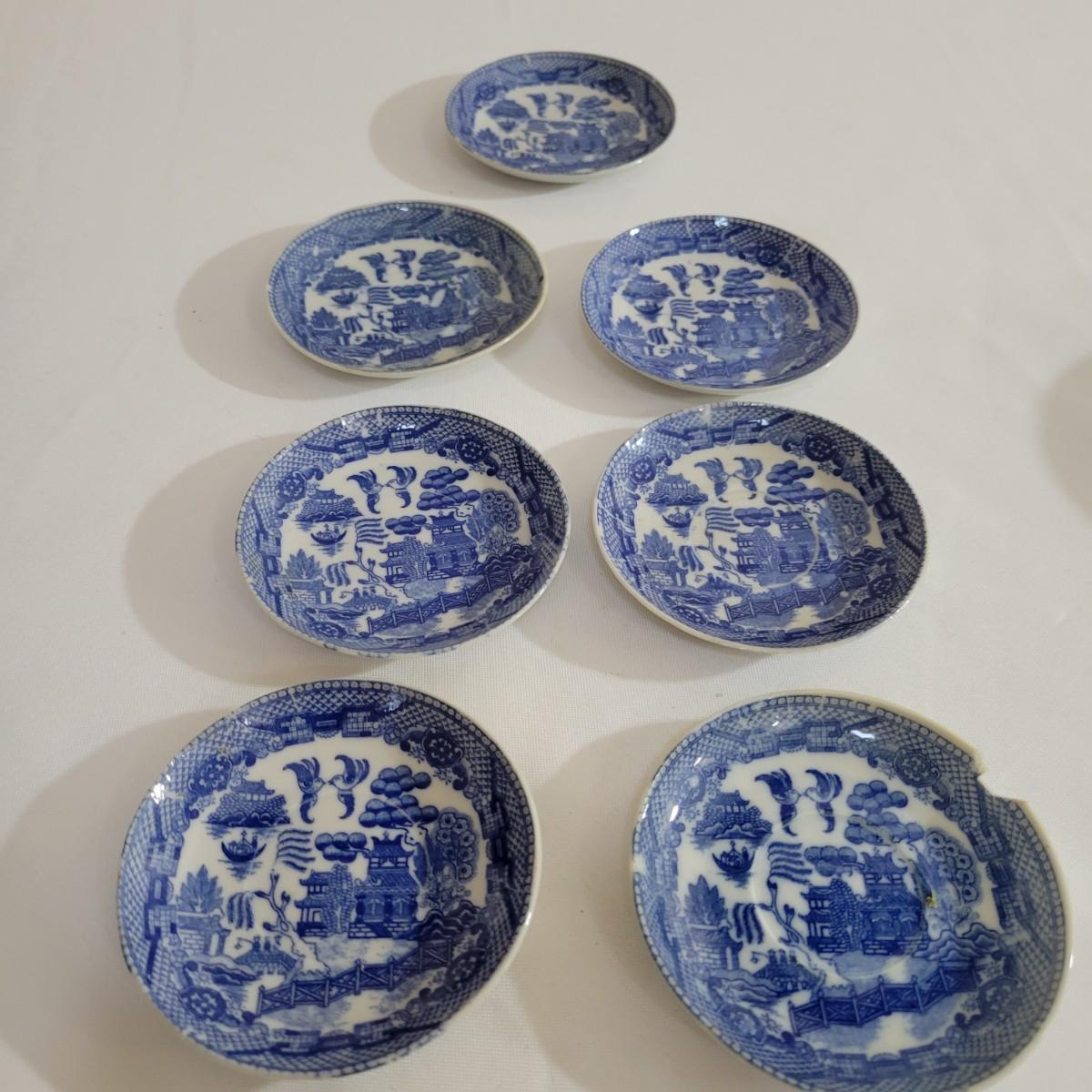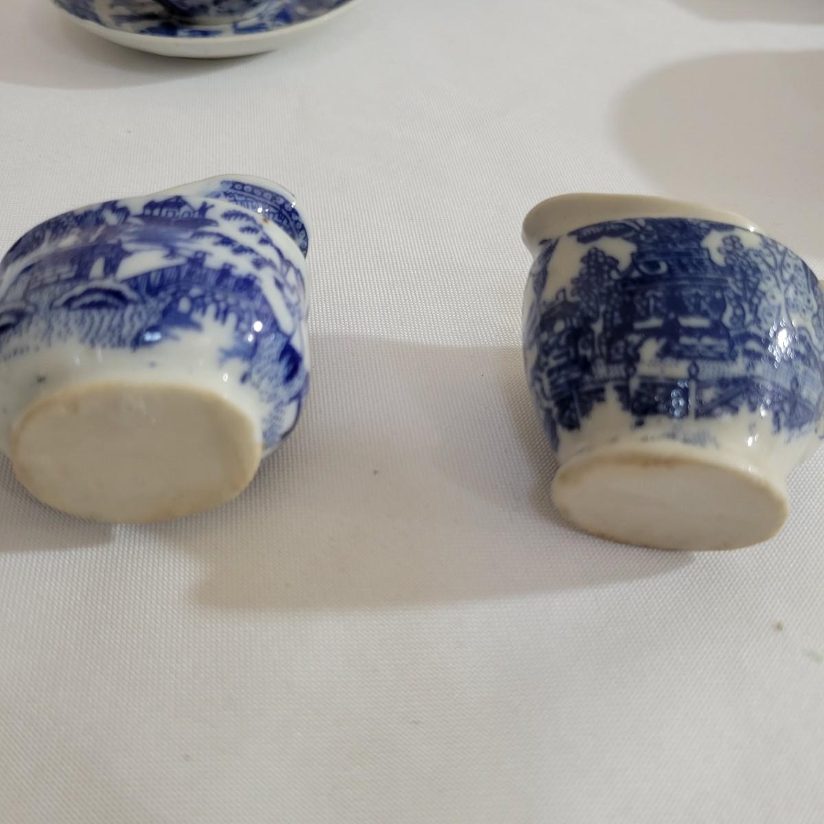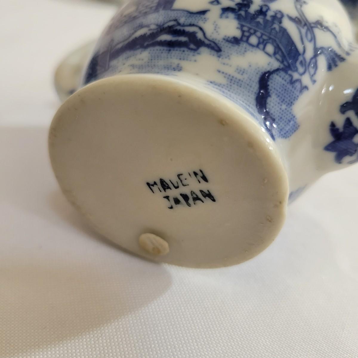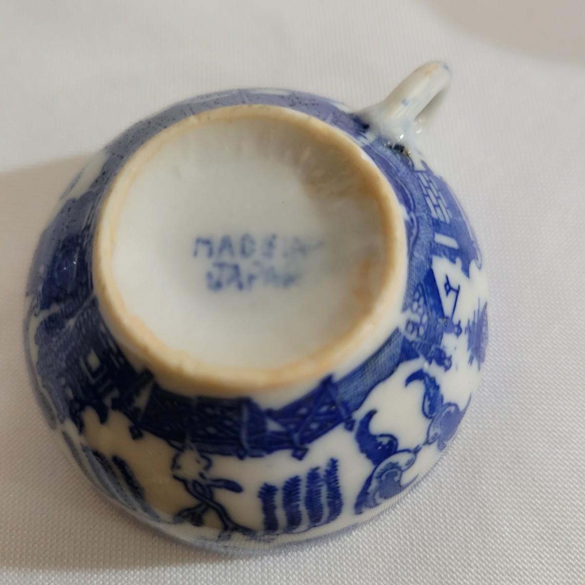 A collection of miniature tea set pieces made in Japan that are in good condition. One plate does have a chip and one piece is faded. Lot includes six teacups, eight plates, seven cup plates, a tea pot, two urns, two pitchers, a large platter and a large lidded bowl. Tea pot measures approximately 4.5" x 2.5" x 4". Pictured box is included. Shipping available