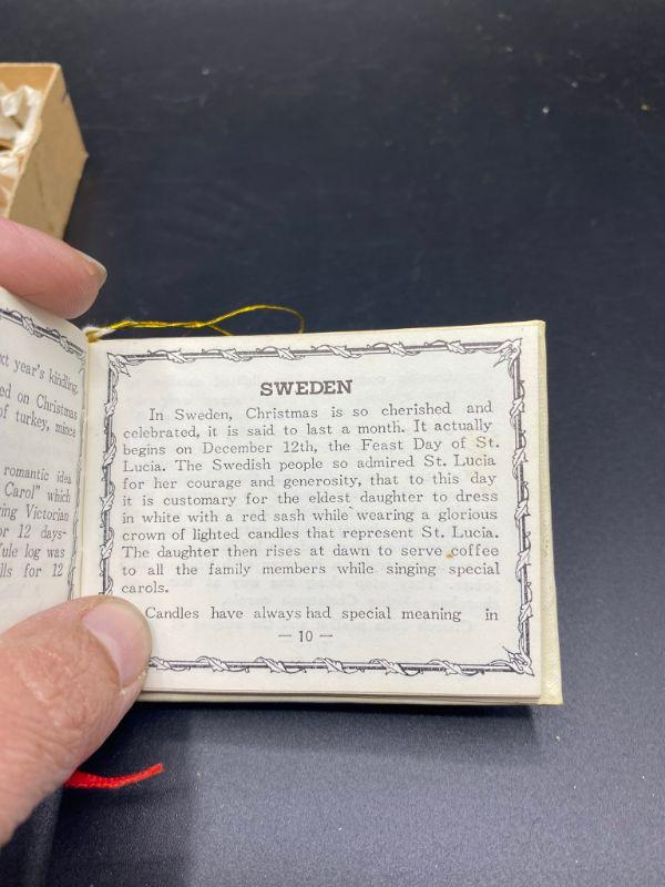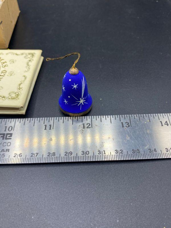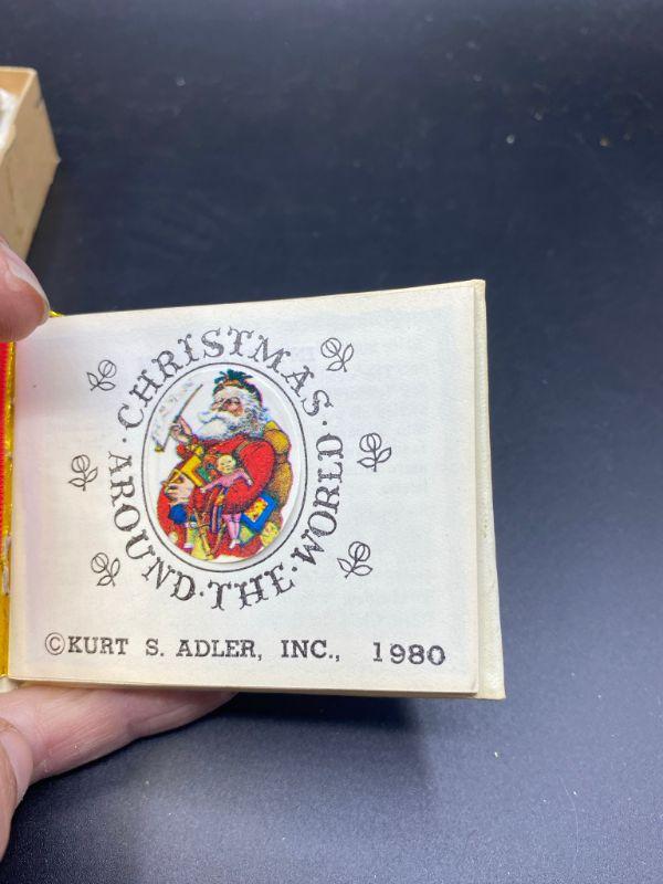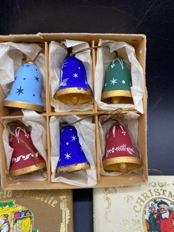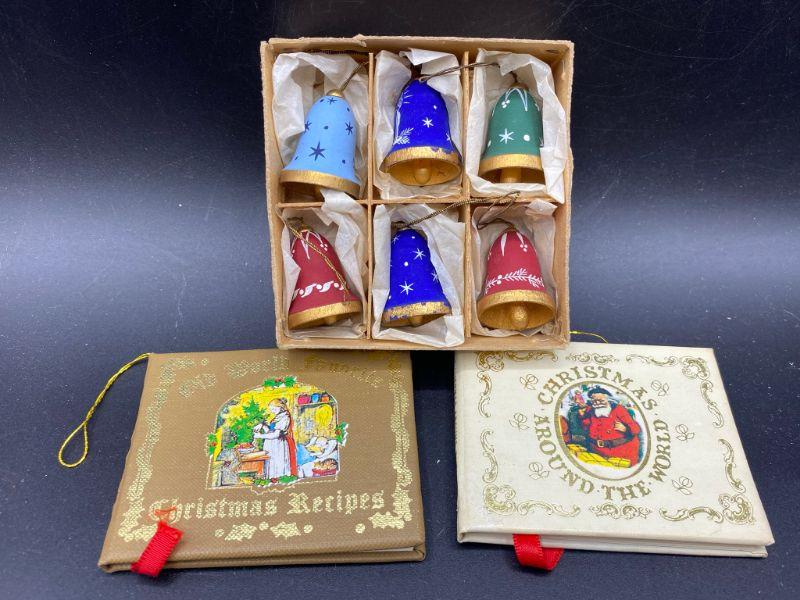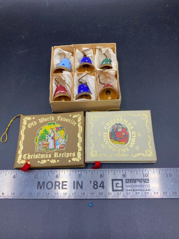 Miniature Kurt Alder Christmas books and mini wood bell ornaments. Books are actual books with stuff to read. Bells are colorful painted wood in original box.