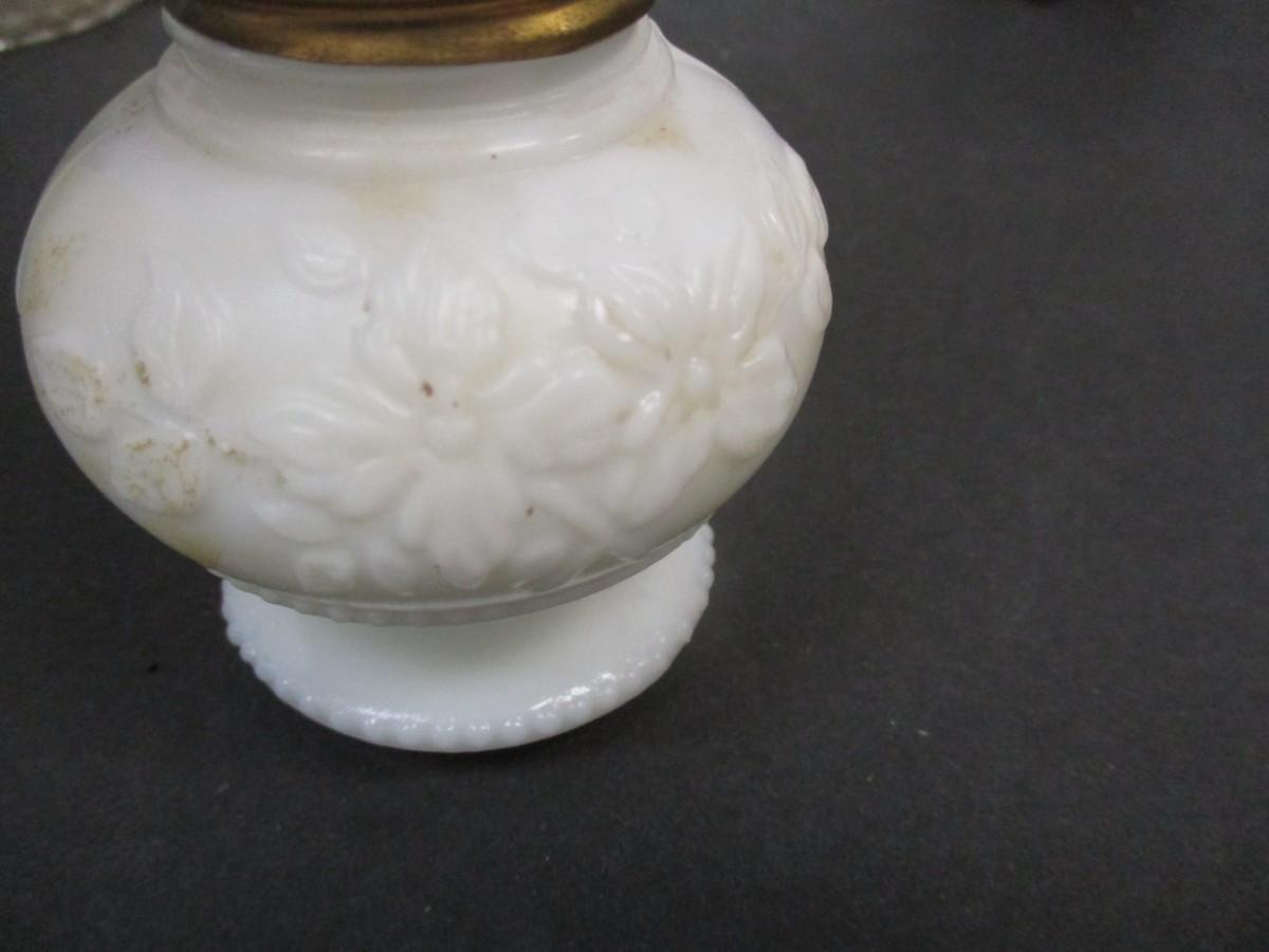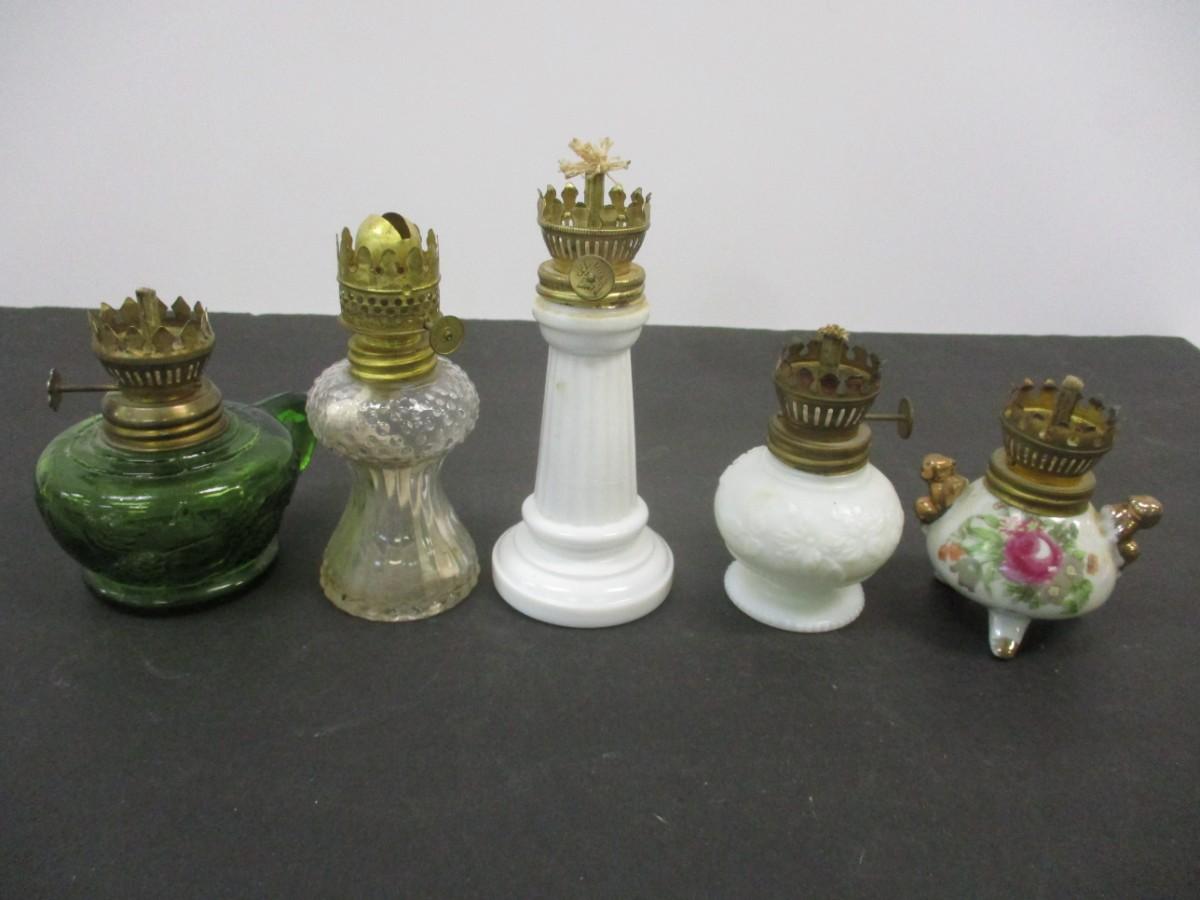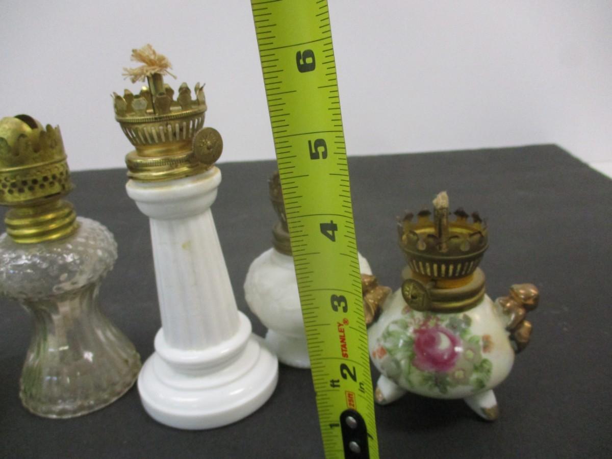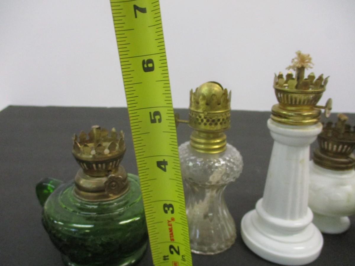 Miniature Lamps - Hong Kong Green Glass Lamp - LE Smith Clear Hobnail Lamp - Milk Glass Lamp With Embossed Design - Porcelain Pink Red Roses Hand Painted Gilding Lamp Japan #3