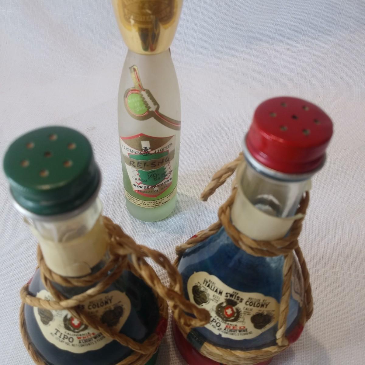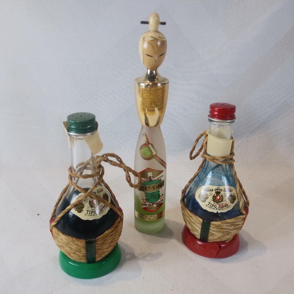 This auction lot is for a gathering of Miniature Liquor Souvenir Bottles. This is a fun group of three small liquor bottles to set out on your bar. The two Italian Mini Wine bottles can also be used as salt and pepper shakers (the red plastic base of one is cracked but doesn't effect how it sits). The other bottle is a tall slender Oriental Woman. They are vintage and very different.