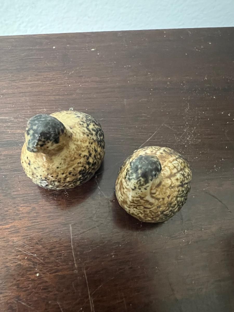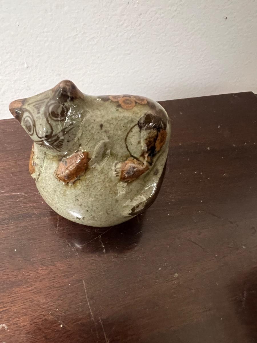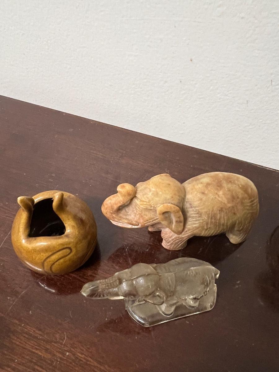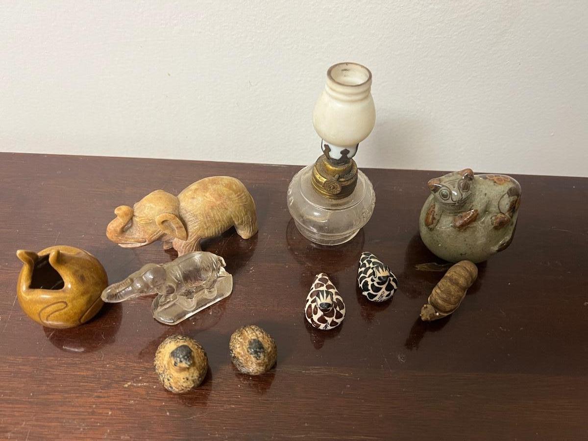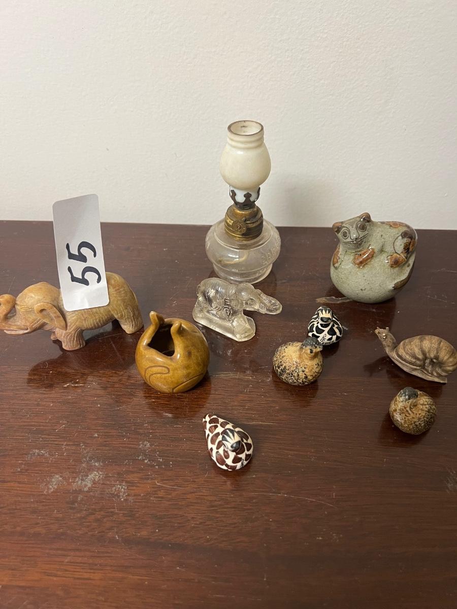 Misc miniatures, oil lamp, 2 pottery cats, quail, snail, elephants AS PICTURED