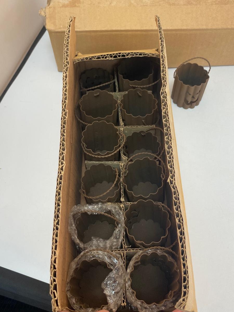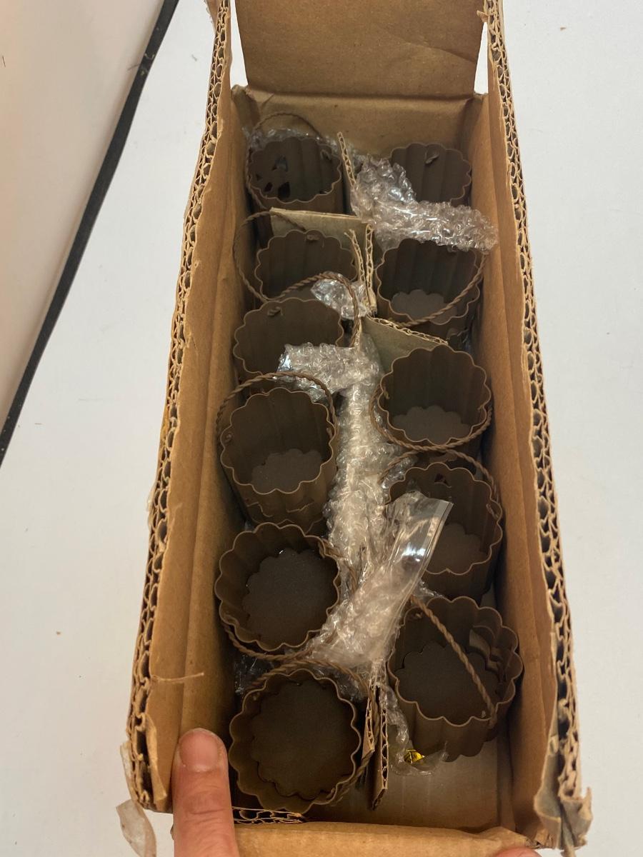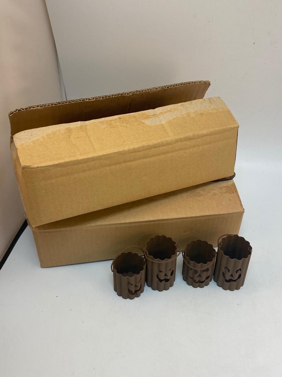 Miniature Metal Jack-o-Lantern Candle Holder Luminaries. Kind of narrow, not sure if they would hold a votive or tealight candle. Different face patterns. Great for crafting. Each box holds 12 but one is missing (total 23).