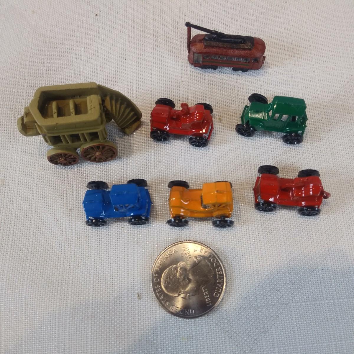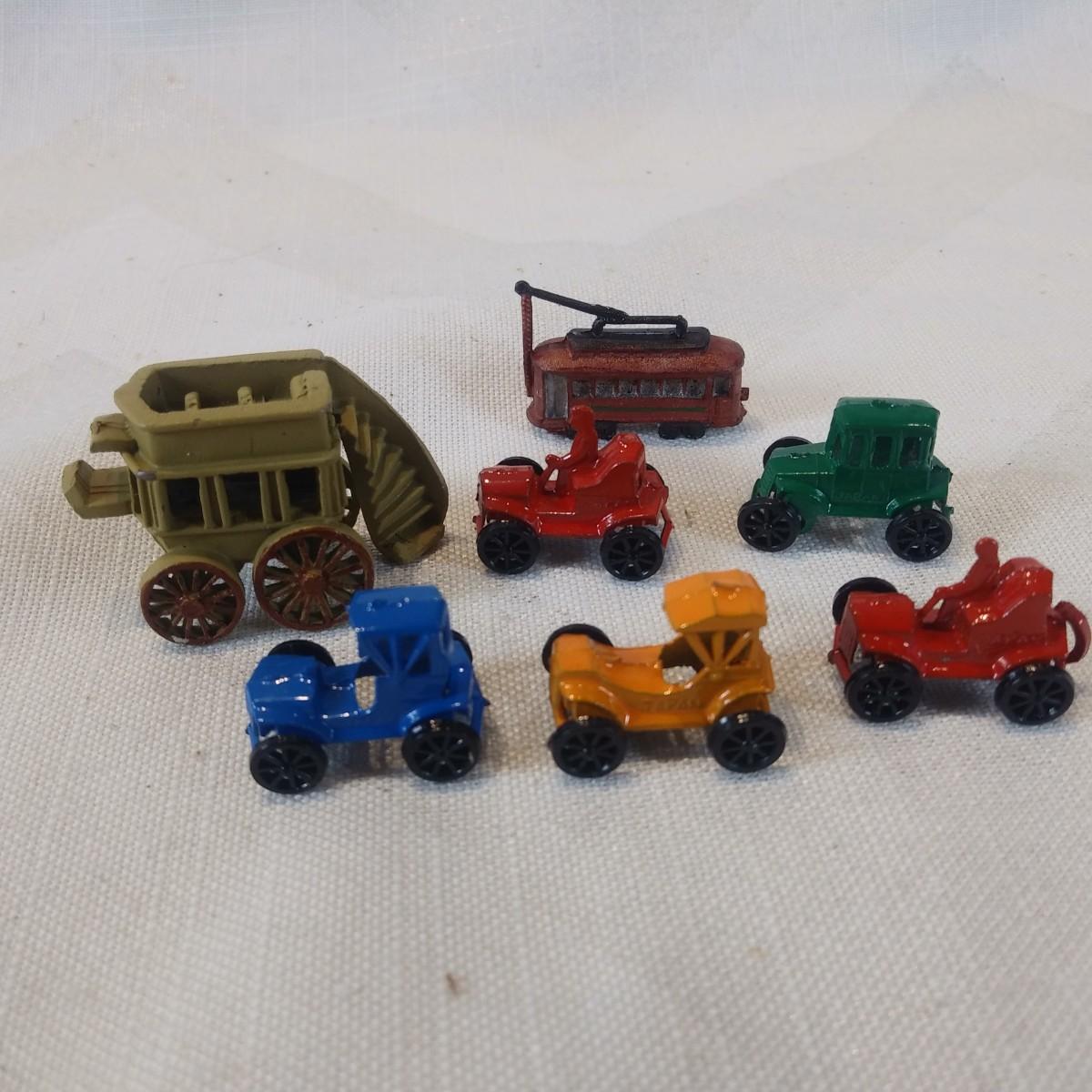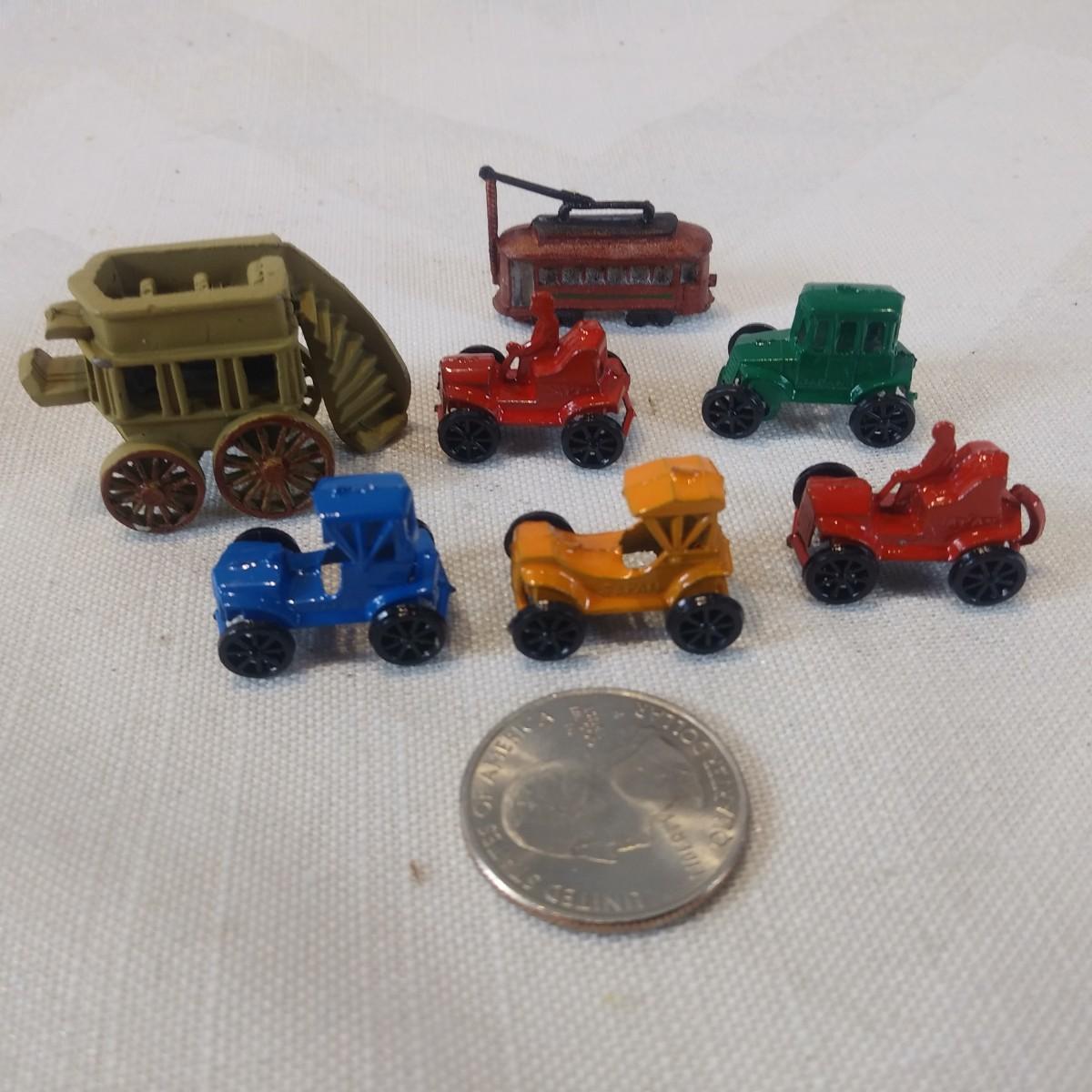 This auction lot is for a group of Miniature Metal Vehicles. These are tiny metal miniatures which include 5 cars, a stagecoach and a trolley car. Nicely made.