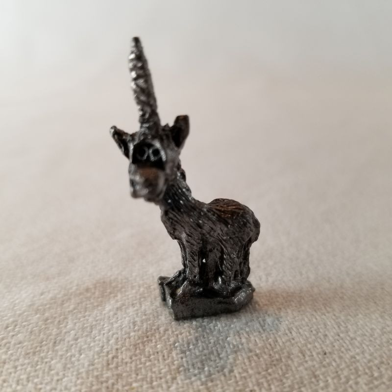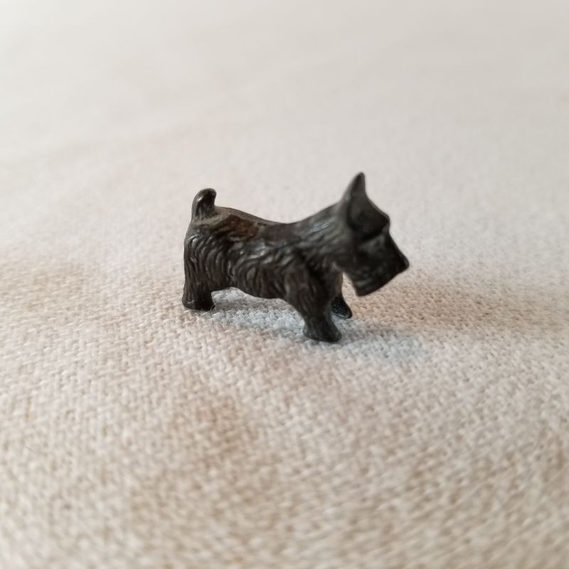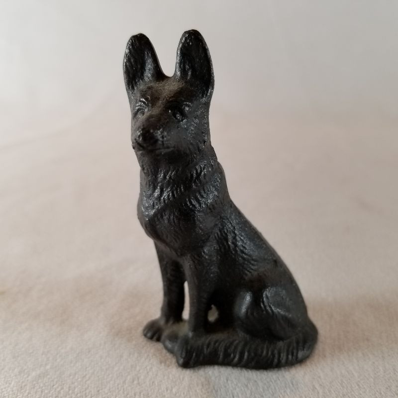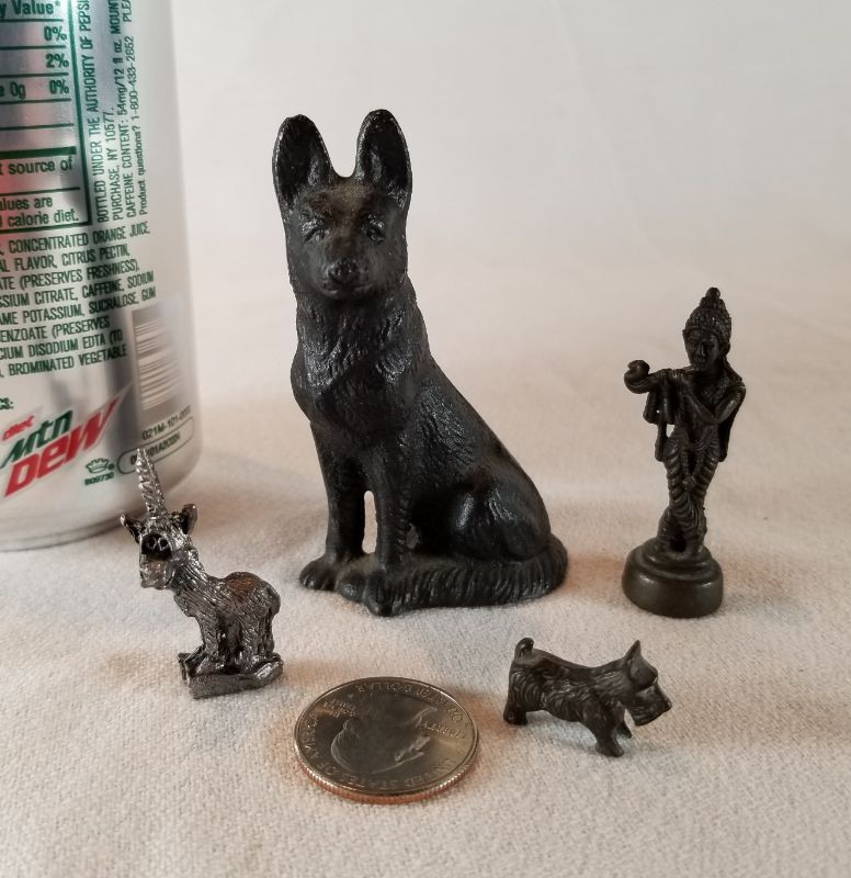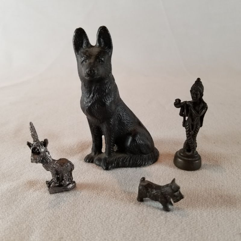 A grouping of 4 iron and metal firures. The largest is a solid iron German Shepard Dog - stands 3-inches tall. Asian person playing the flute, also solid iron. The whimsical Unicorn is metal and a little top heavy - you would be too with that horn-a-plenty, the tiny hallow metal Scotty dog is from an old Monopoly Game. All in very good condition.