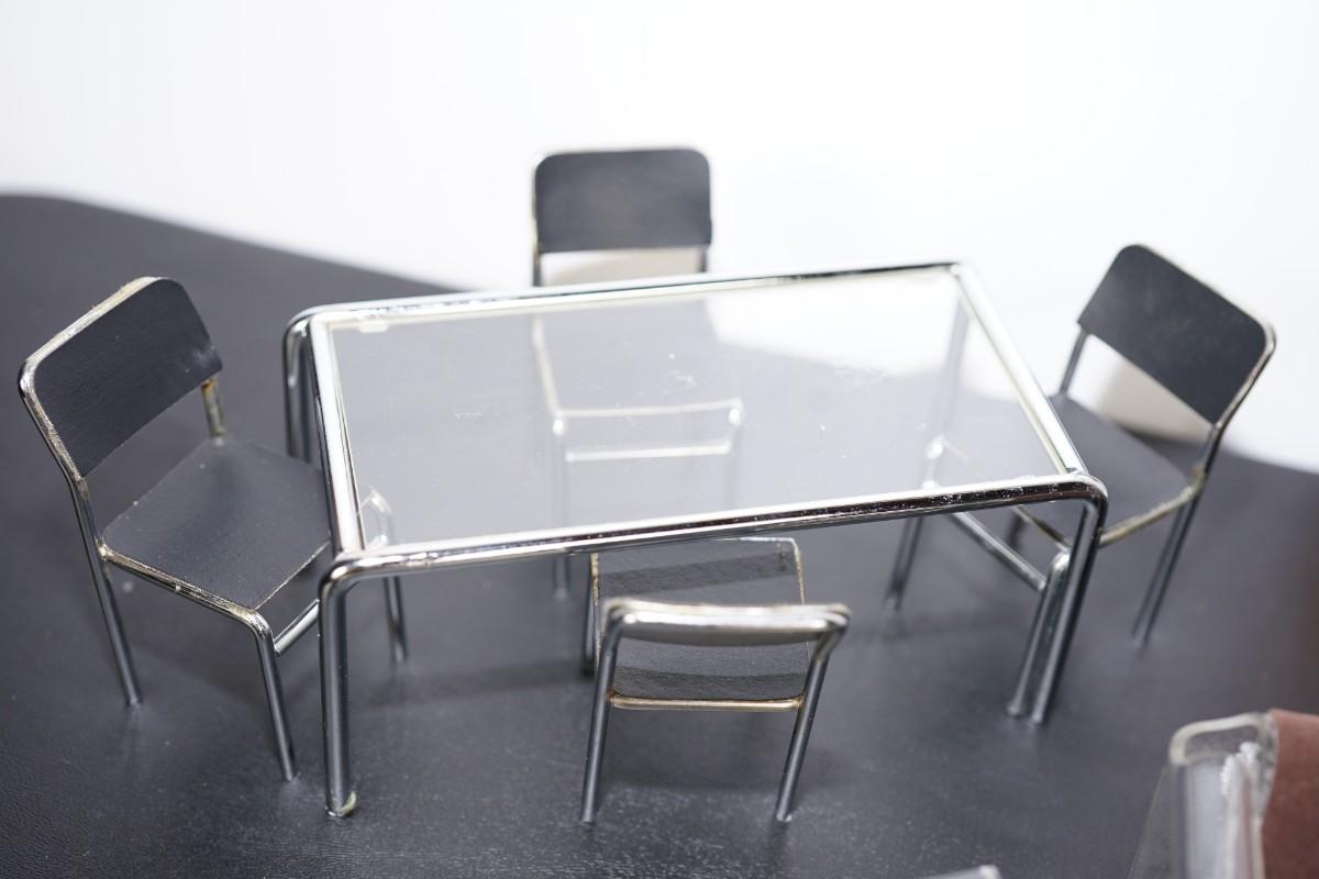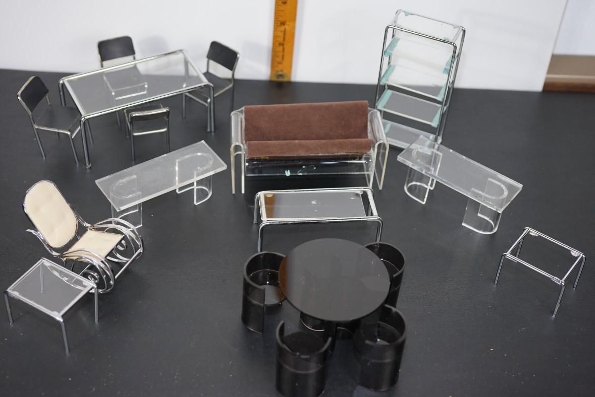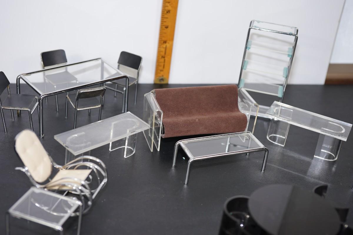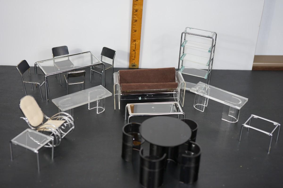 MINIATURE MID CENTURY MODERN LIVING ROOM- LUCITE AND CHROME STYLE DESIGNS.