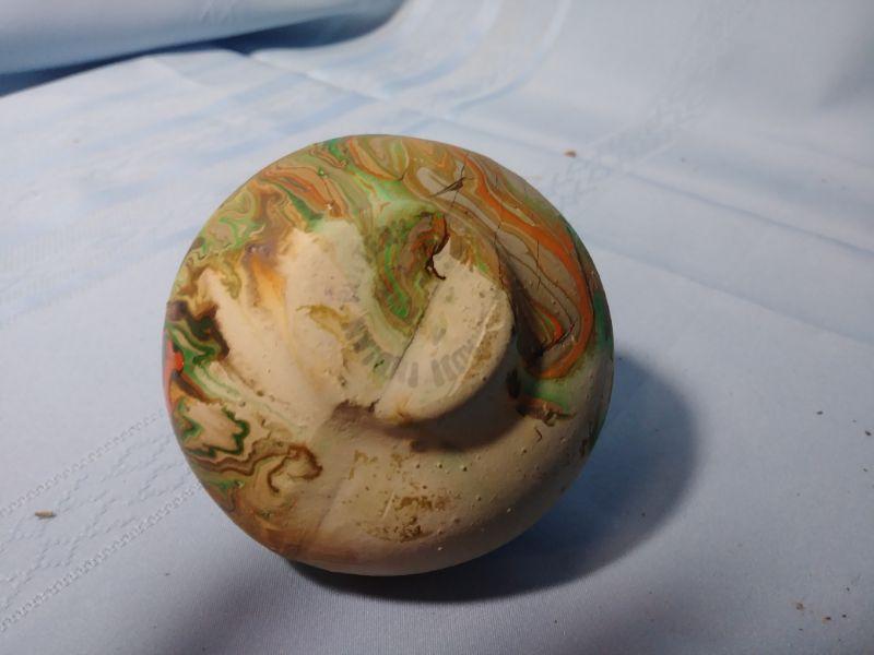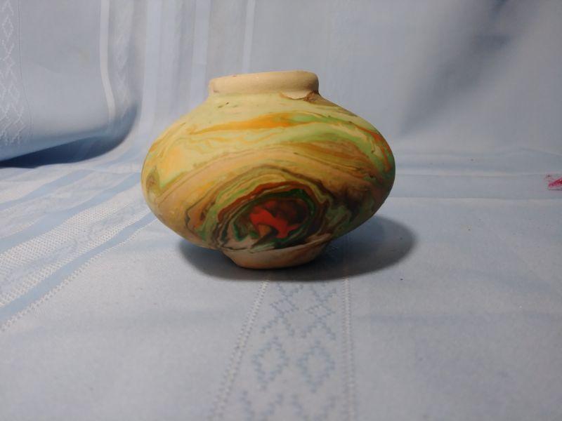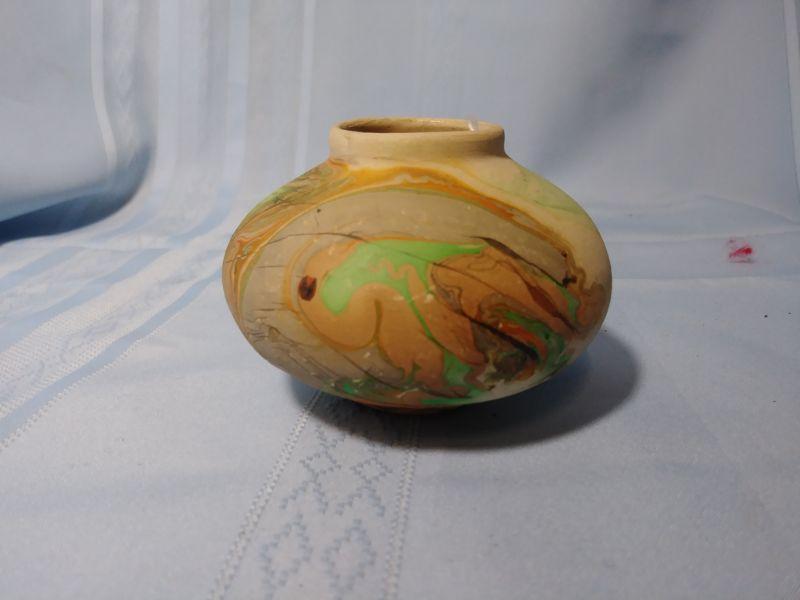 Miniature Namadji Vase with Green and Orange Swirls 3 1/2" W x 3" H