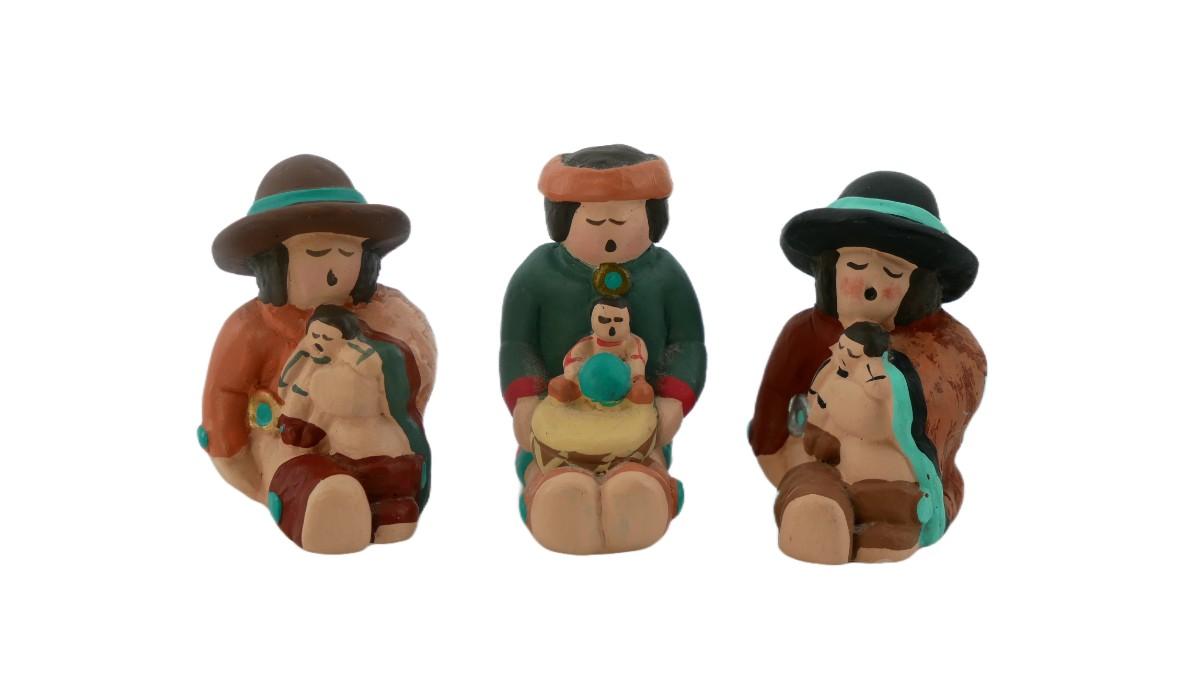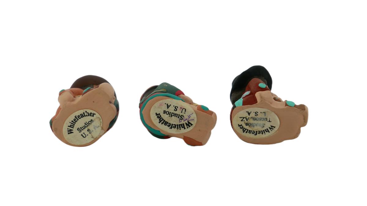 Miniature ceramic Native American figurines with children. Each figurine measures approximately L 1.25" x H 1.5" x W 1". Lot weighs 2.3 oz. One has large chip in hat, normal wear and aging on others. All handcrafted by Whitefeather Studios USA. (C5)