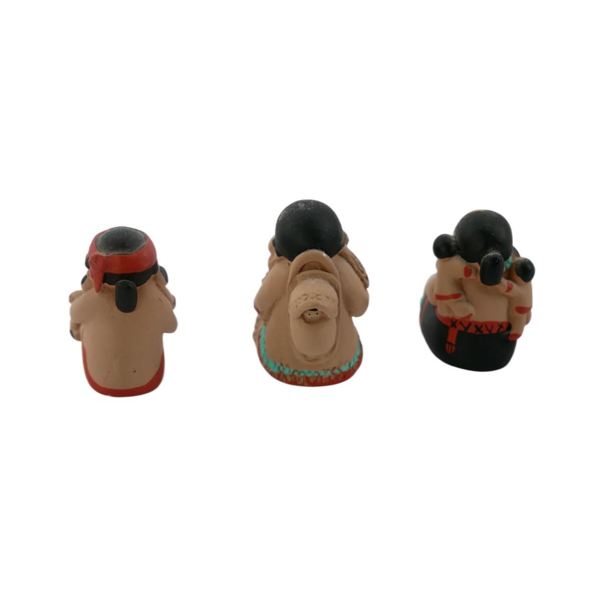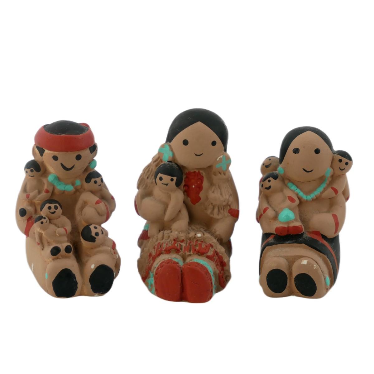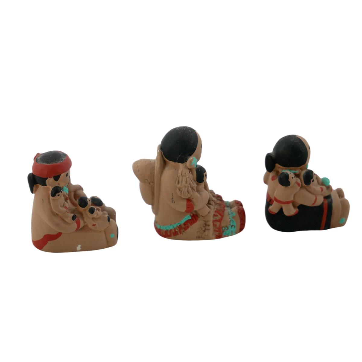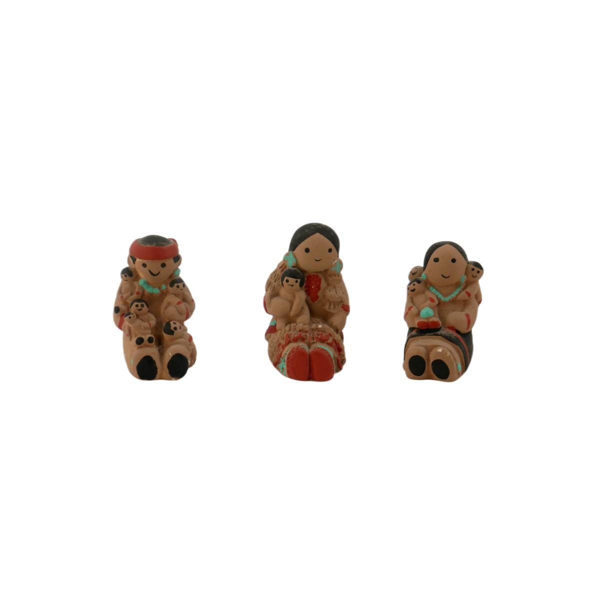 Miniature Native American figurines with babies and children. All handcrafted, hand painted, and signed. Normal wear and aging on all. Overall great condition. Largest figurine measures L 1.5" x H 1.5" x W 0.75". Lot weighs 1 oz. (C3)
