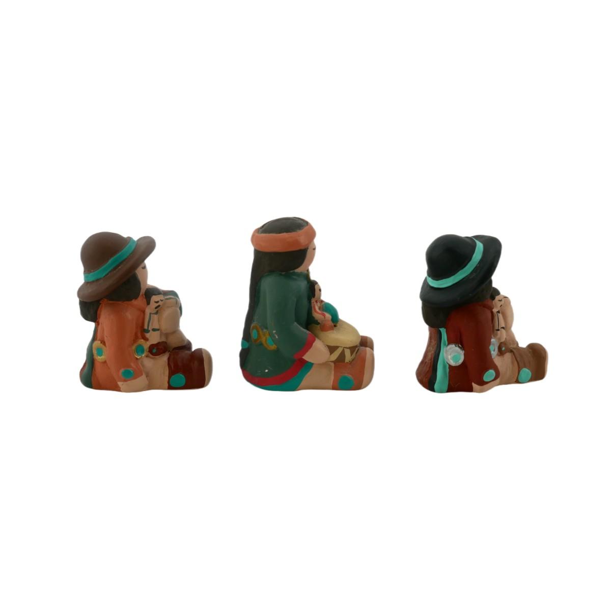 Miniature ceramic Native American figurines with children. Each figurine measures approximately L 1.25" x H 1.5" x W 1". Lot weighs 2.3 oz. One has large chip in hat, normal wear and aging on others. All handcrafted by Whitefeather Studios USA. (C5)