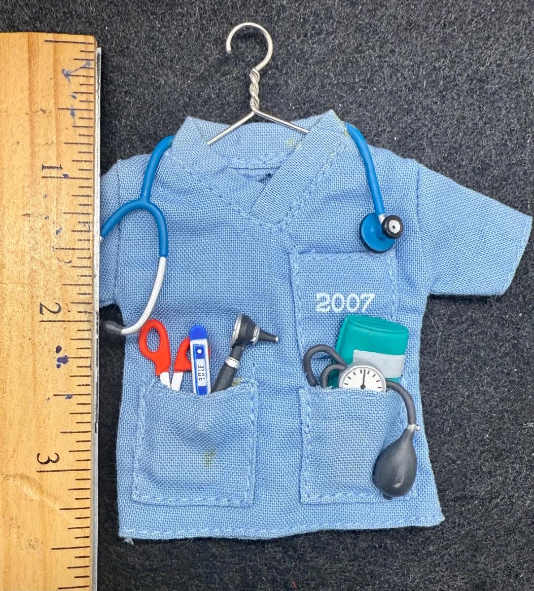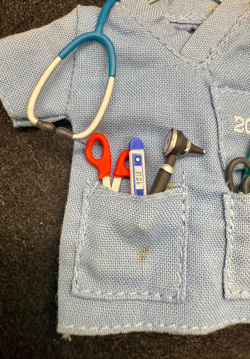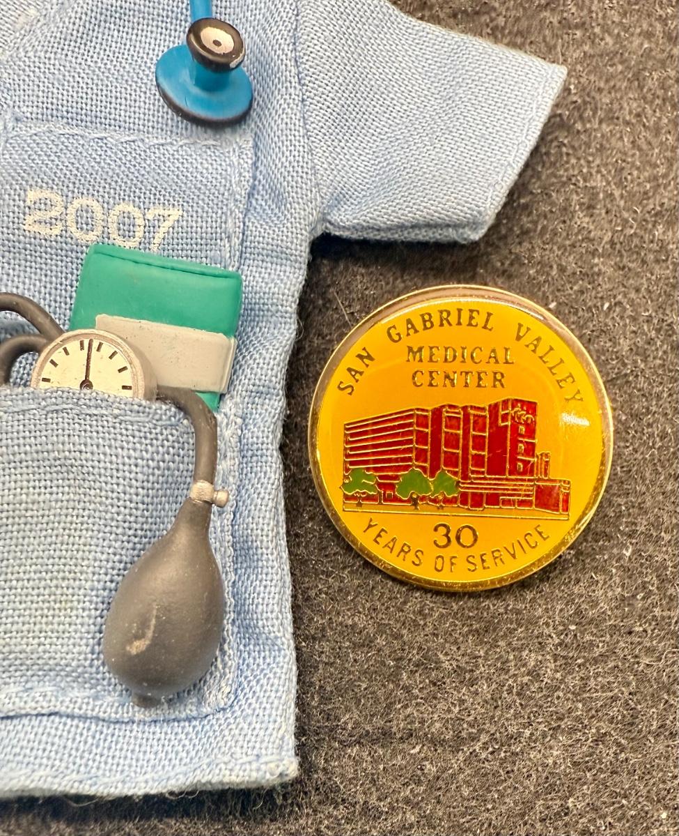 Size of the coat is similar to Barbi clothes. Copat is on a hanger, with a stethoscope, scissors, thermometer, blood pressure cuff and otoscope. 30 service pins are for San Gabriel Valley medical center.