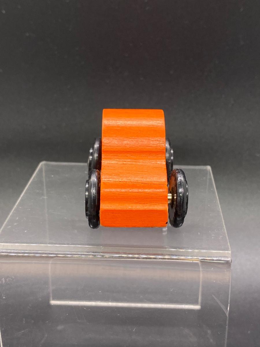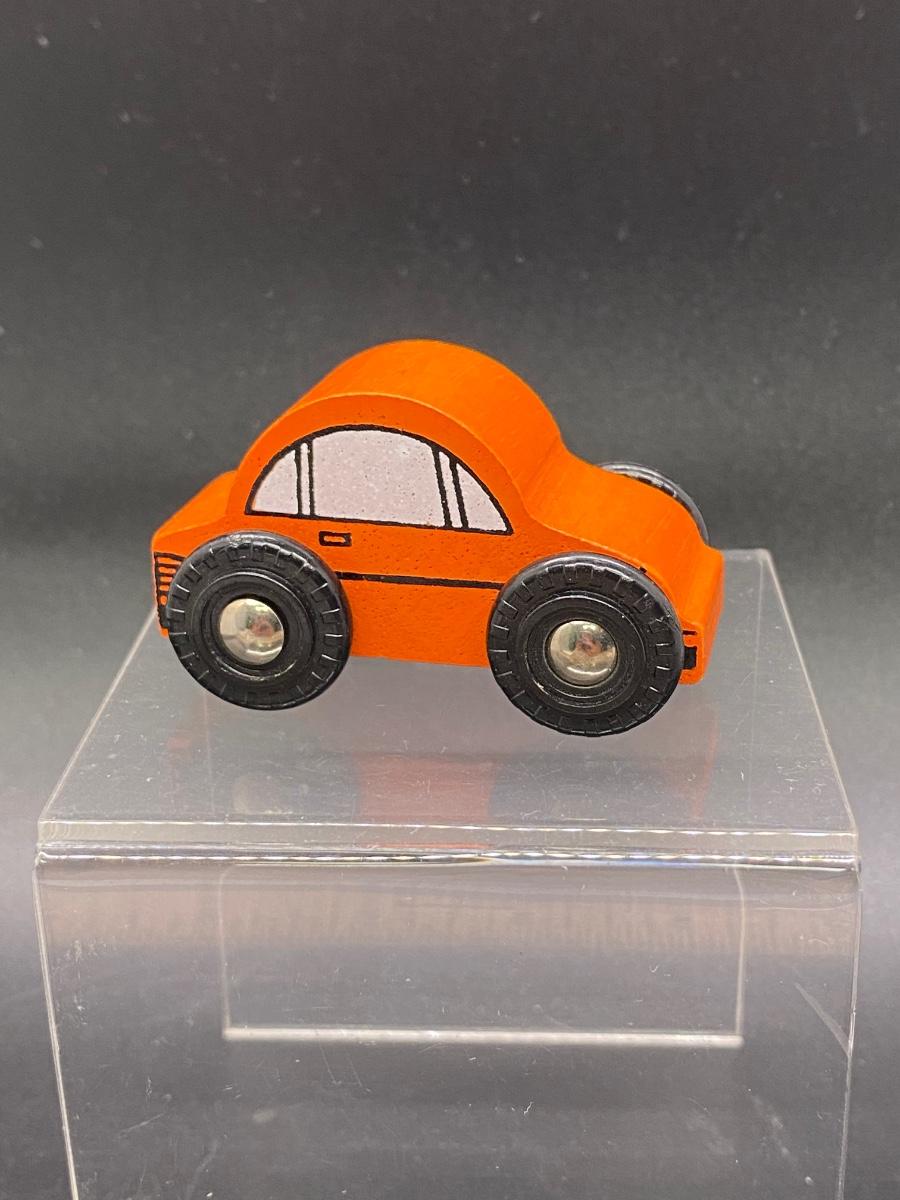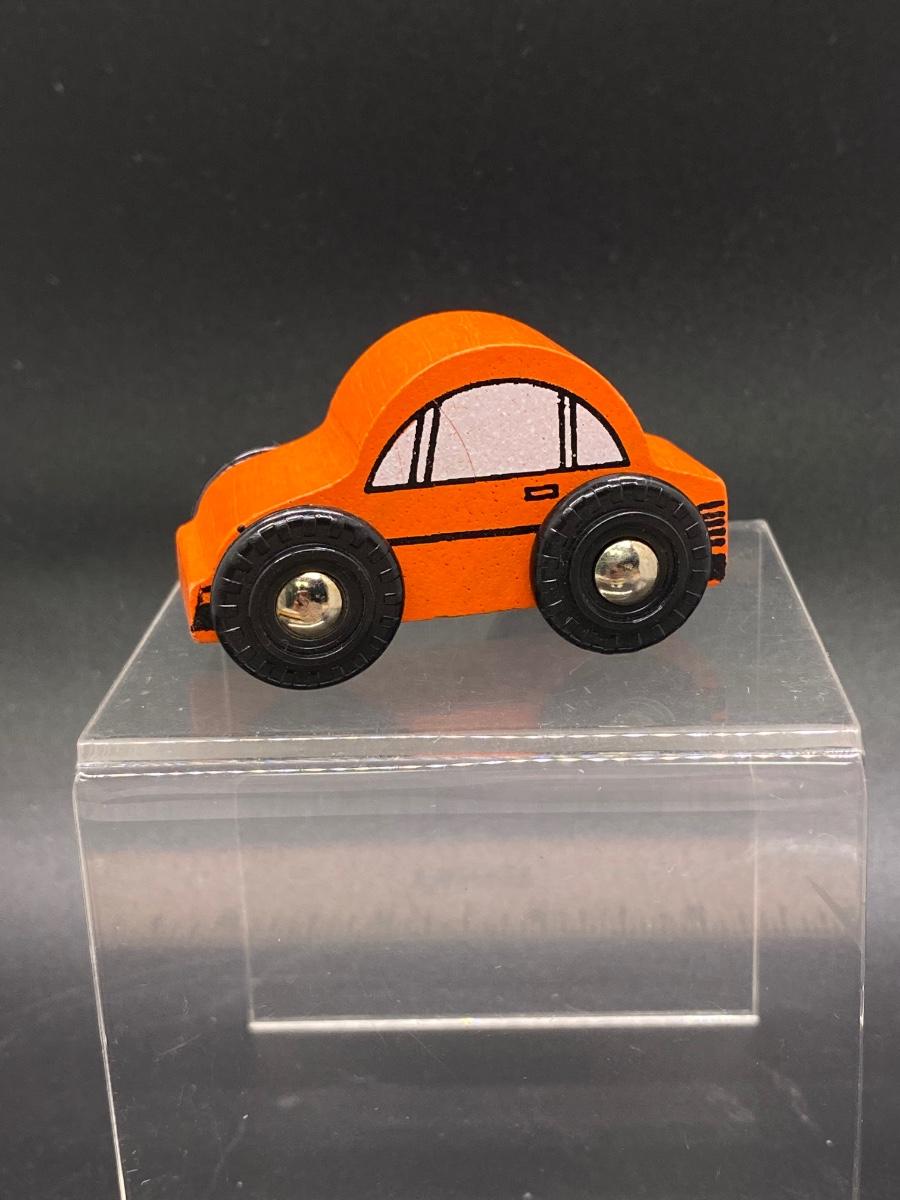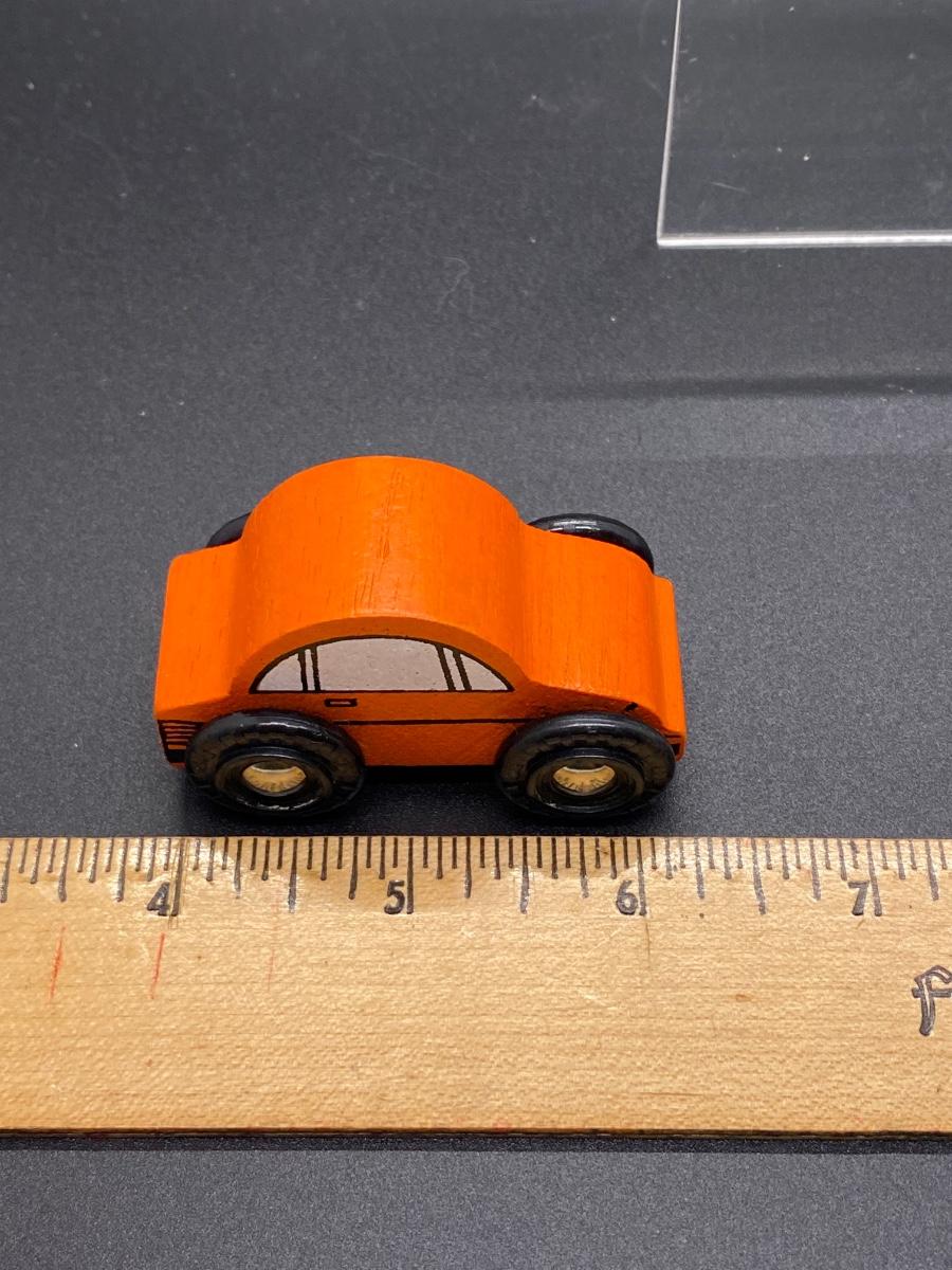 Small orange wood block car with plastic wheels. Car rolls when pushed. About 2" size.