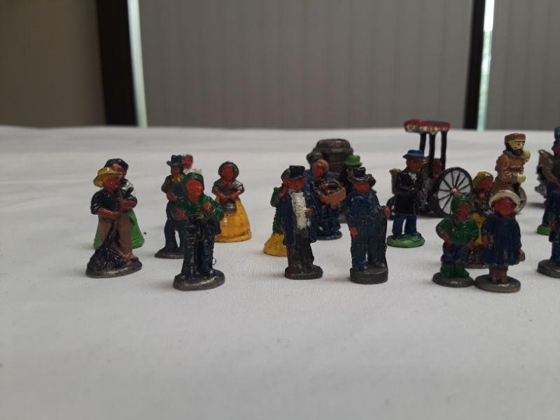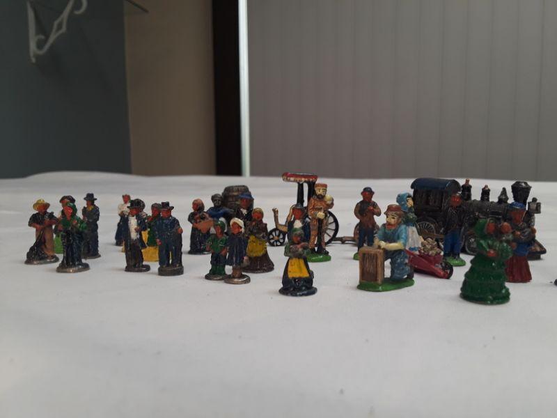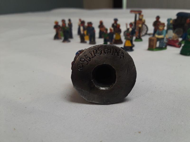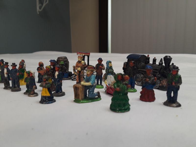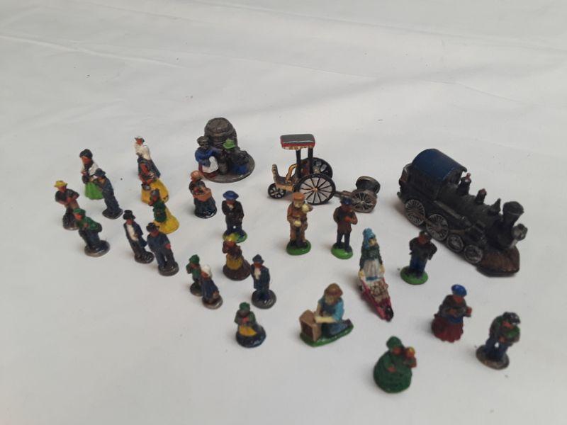 Nice collection of miniature pewter people. 20+ pieces. Included is a buggy and a train engine. Bottom are stamped "95 IRS China"