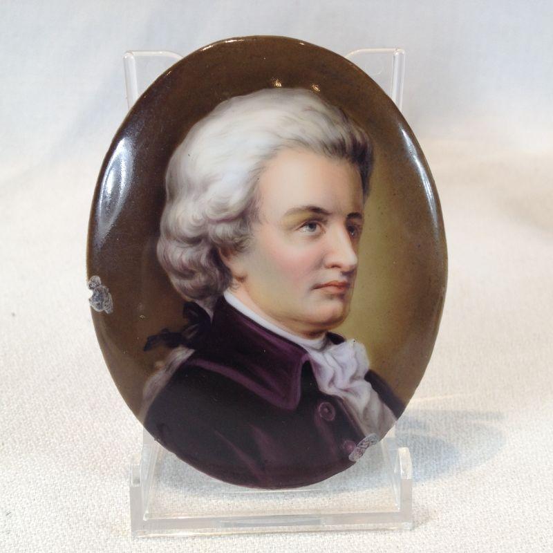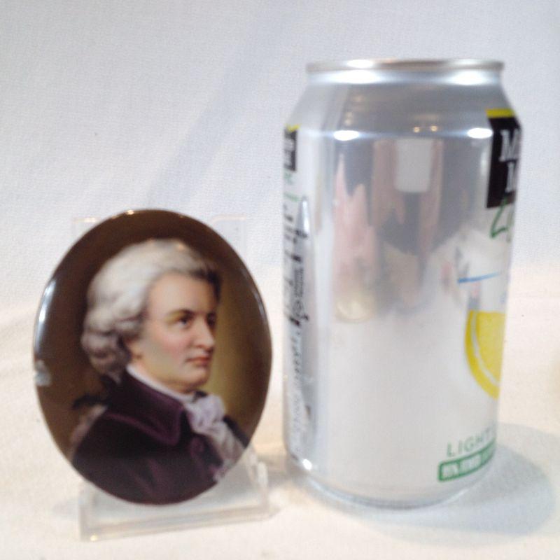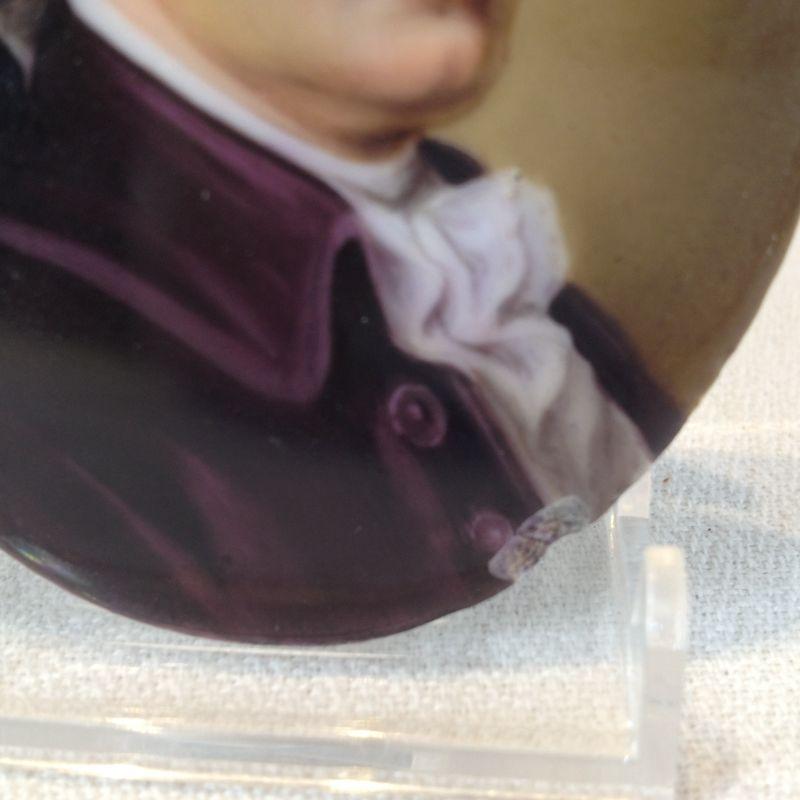 This lot is for a Miniature Painting of a Gentlemen on porcelain. It has two good-sized chips on two sides of the edges - see pictures. The art is amazing. It measures 3 1/2-inches tall. It was found in the bottom drawer of the gentleman's dresser under some layers of shelving-type paper at the Ft. Lauderdale estate -probably a souvenir of one of their many European trips.