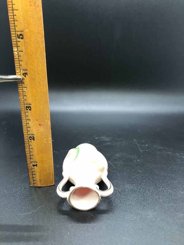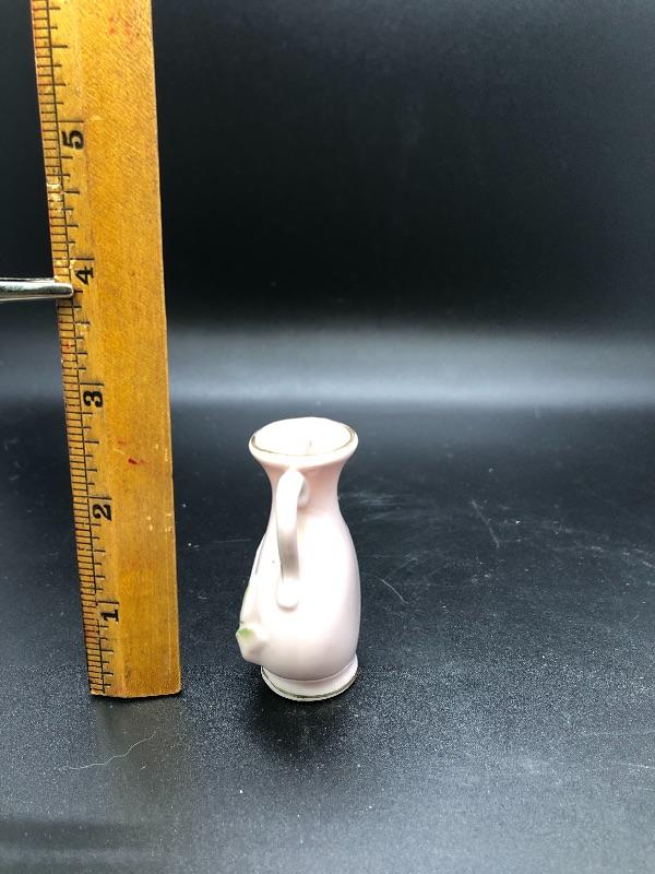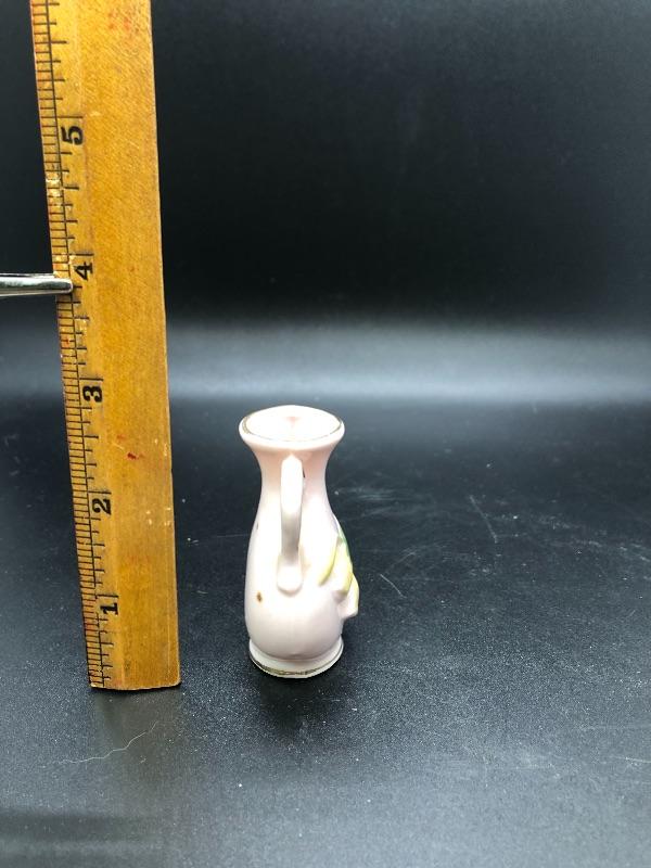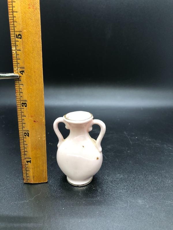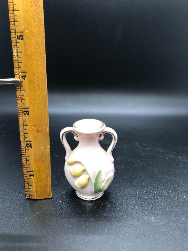 Miniature pale pink vase. Double handle urn has yellow flowers on it. Only about 2.5" tall. Displays nice.