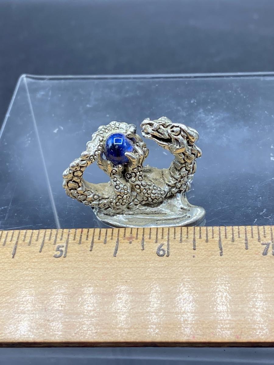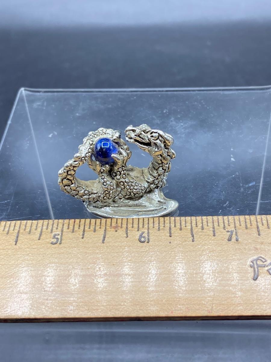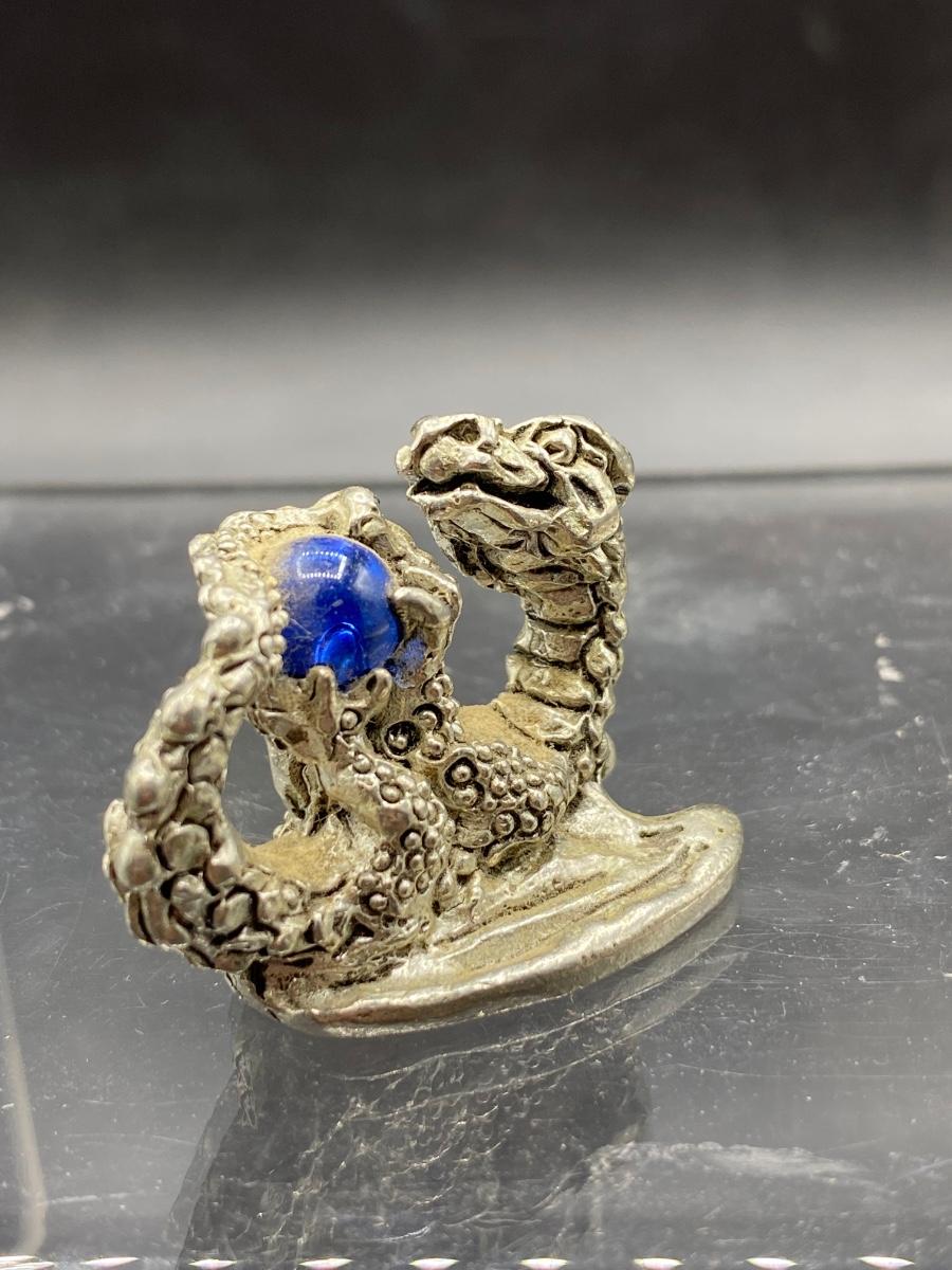 Miniature Pewter Dragon Figurine Holding Blue Orb Marble Crystal Ball