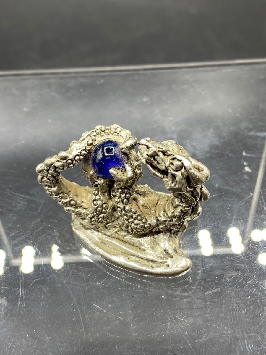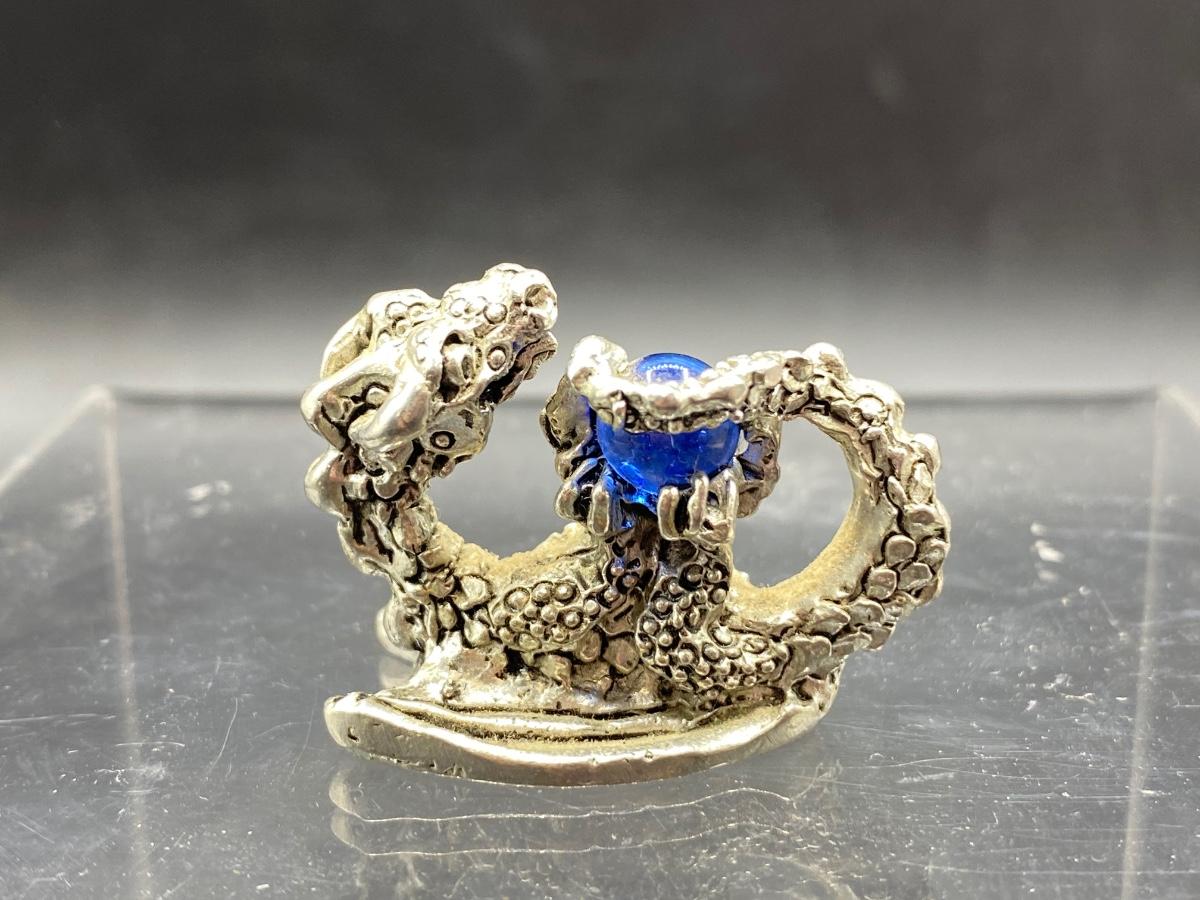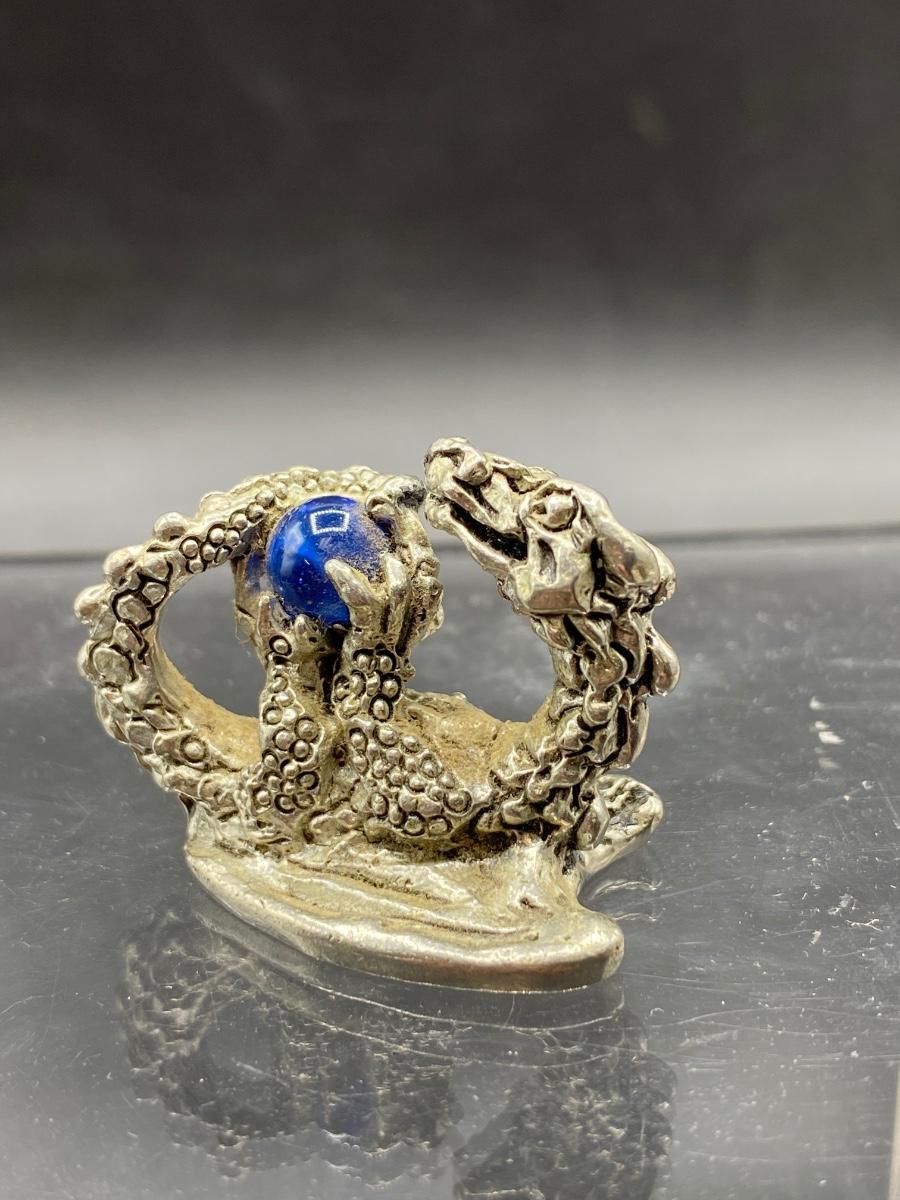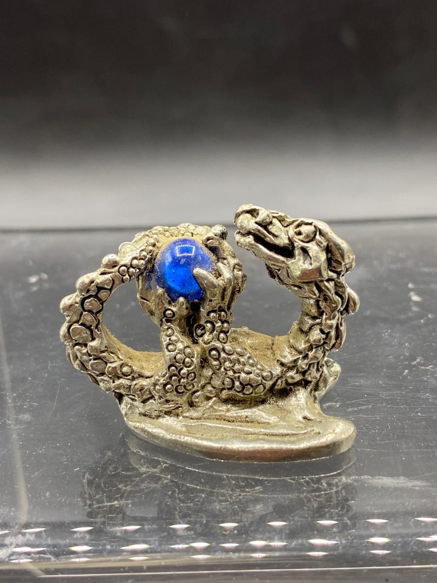 Miniature Pewter Dragon Figurine Holding Blue Orb Marble Crystal Ball