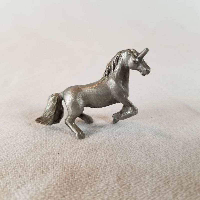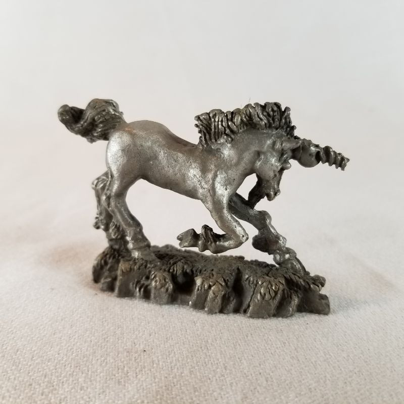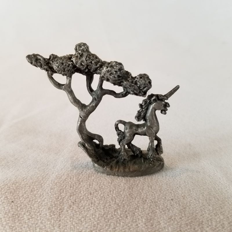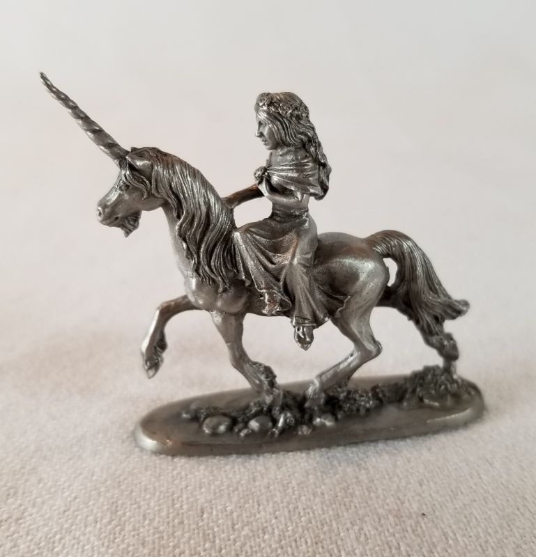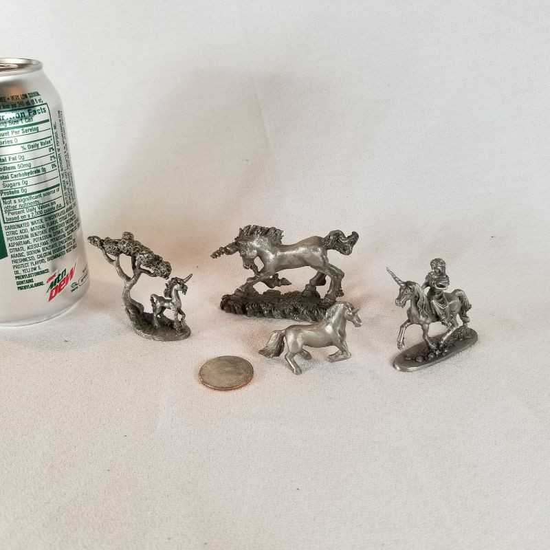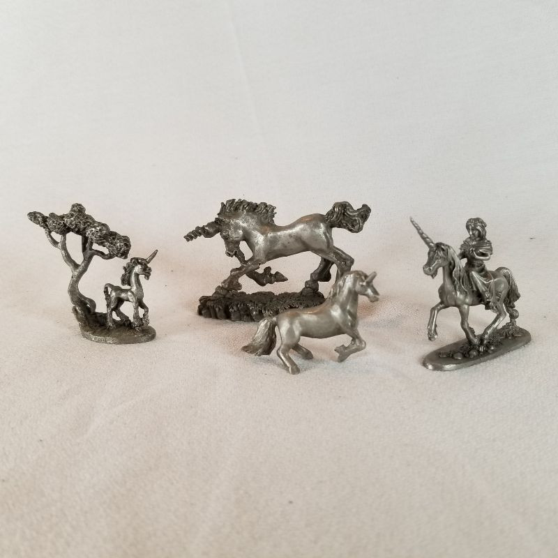 Set of 4 miniature unicorns: Unicorn with tree, Posed head down Unicorn, rearing up Unicorn and Unicorn with maiden. All in original shape and in good condition. From a collection started in the "80's.