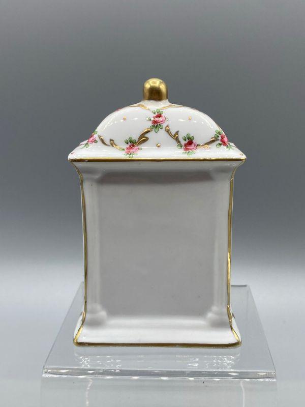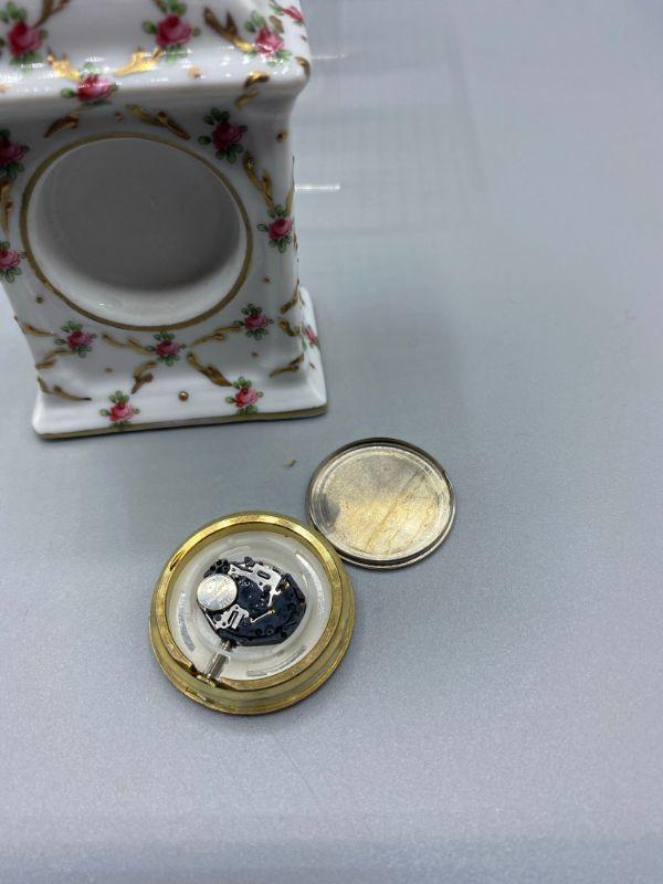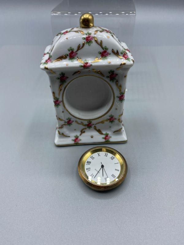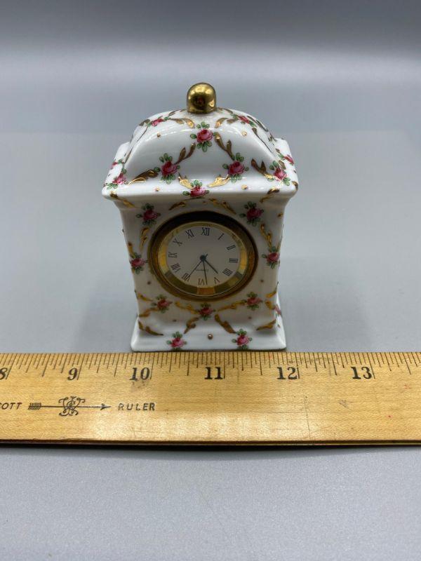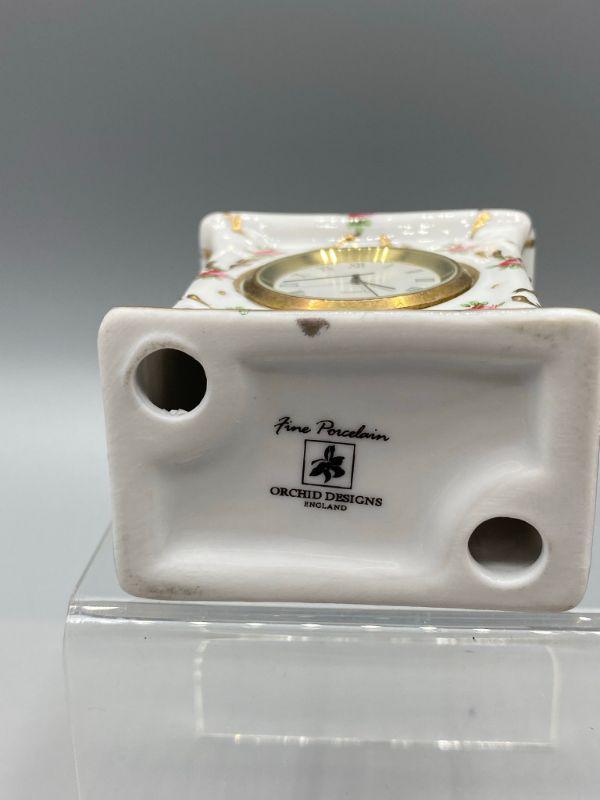 Miniature porcelain shelf clock by Orchid Designs. The clock face is the size of a watch face, takes a watch battery. Currently it is running. Porcelain clock body has a floral pattern to it. Stand just under 4". Good condition.