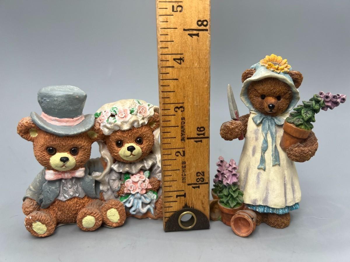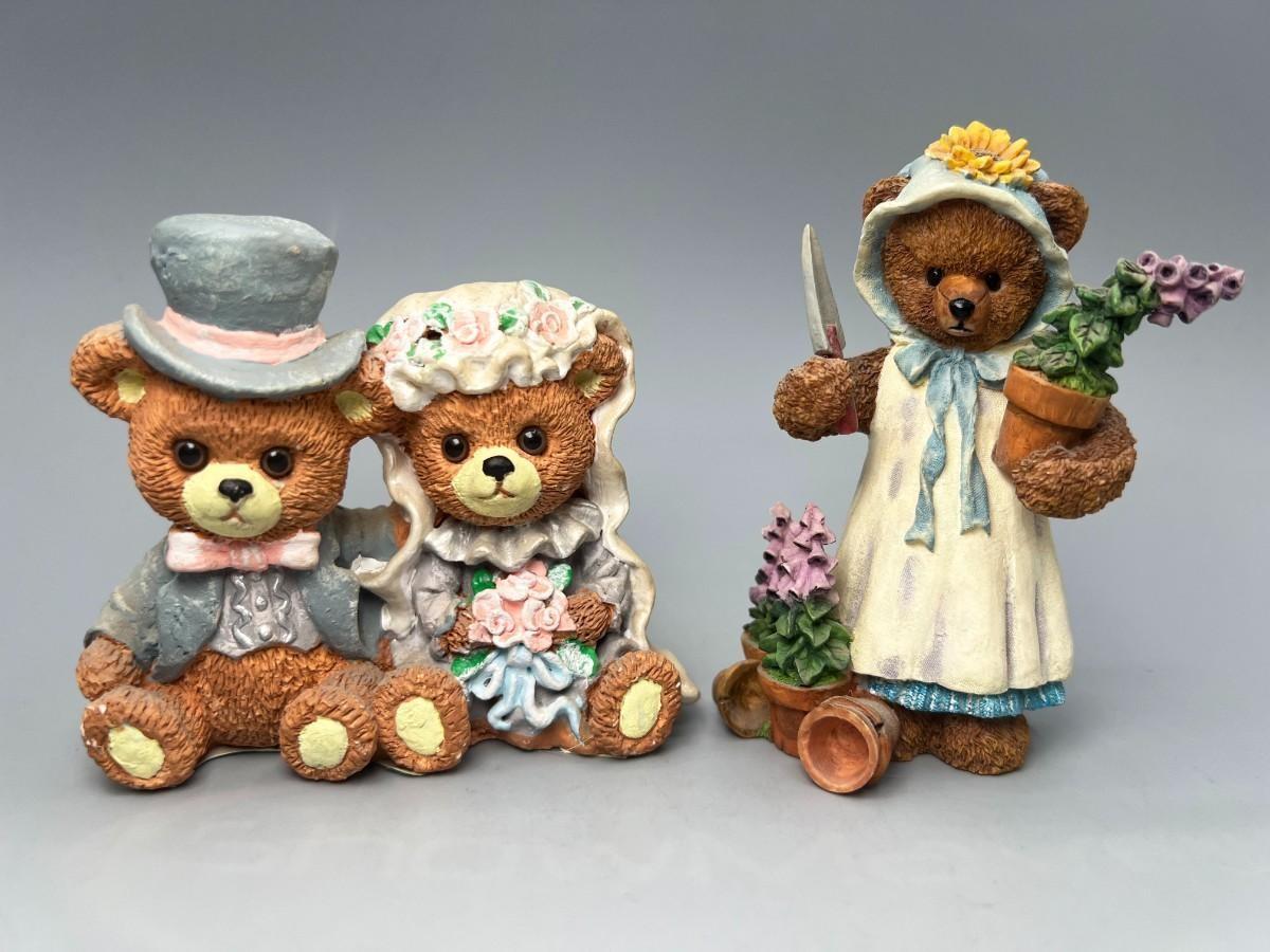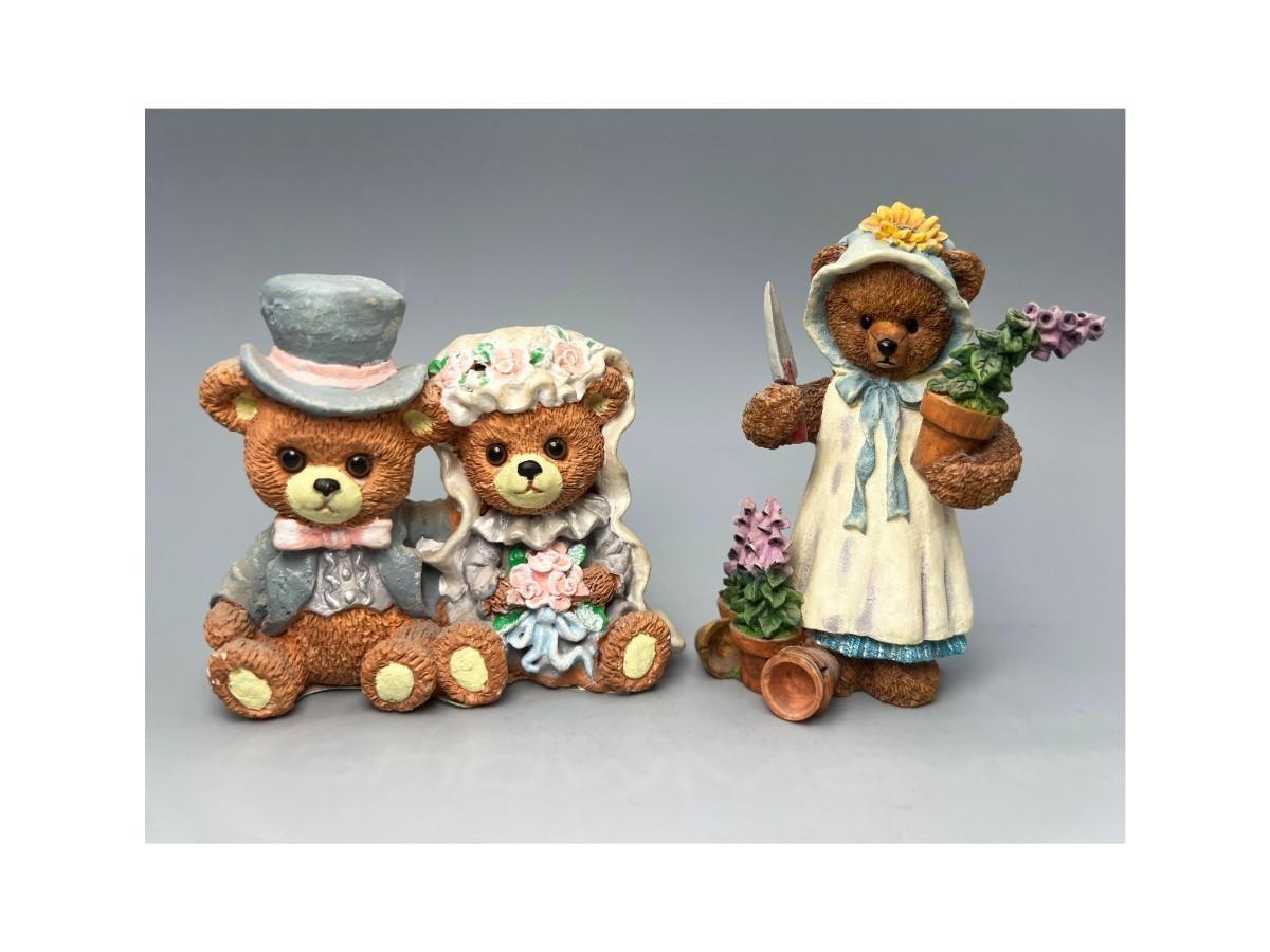 Pair of small teddy bear figurines. A bride & groom teddy bear couple and a flower planting bear. Under 4" size, good condition.