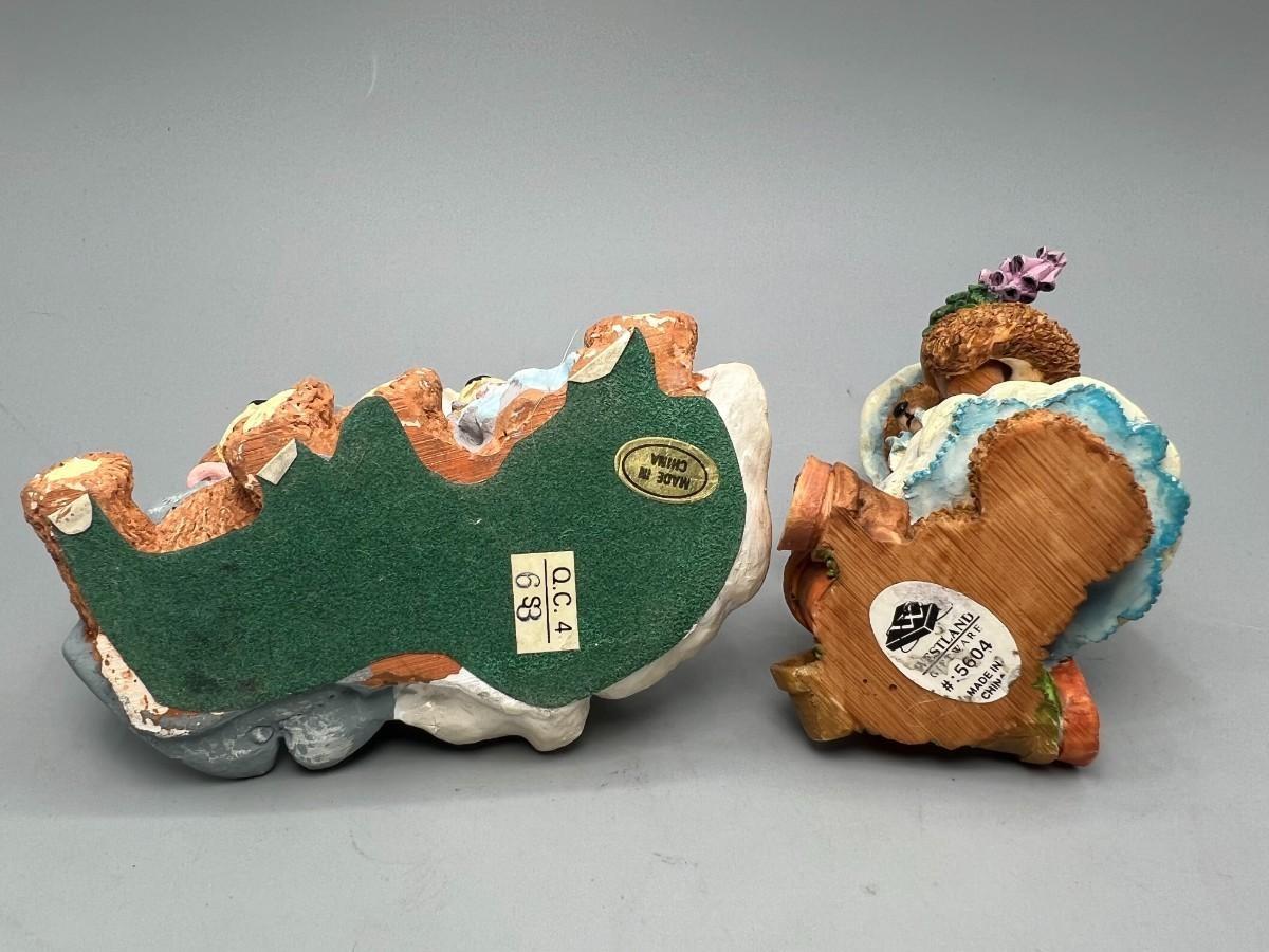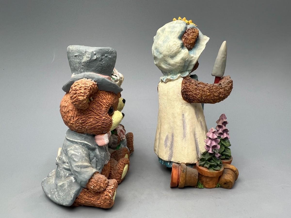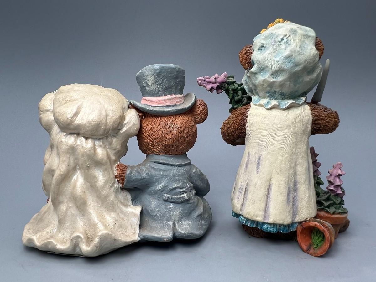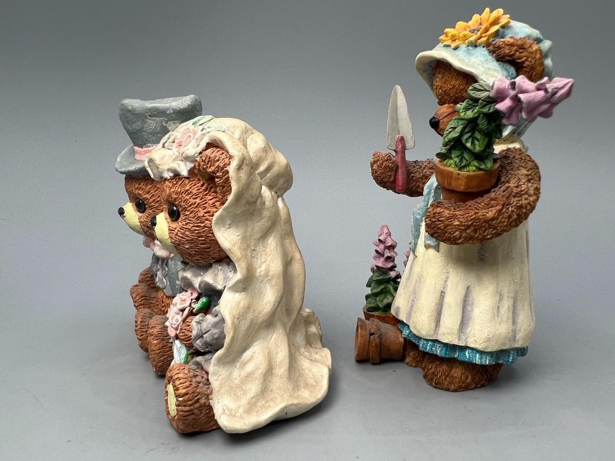 Pair of small teddy bear figurines. A bride & groom teddy bear couple and a flower planting bear. Under 4" size, good condition.