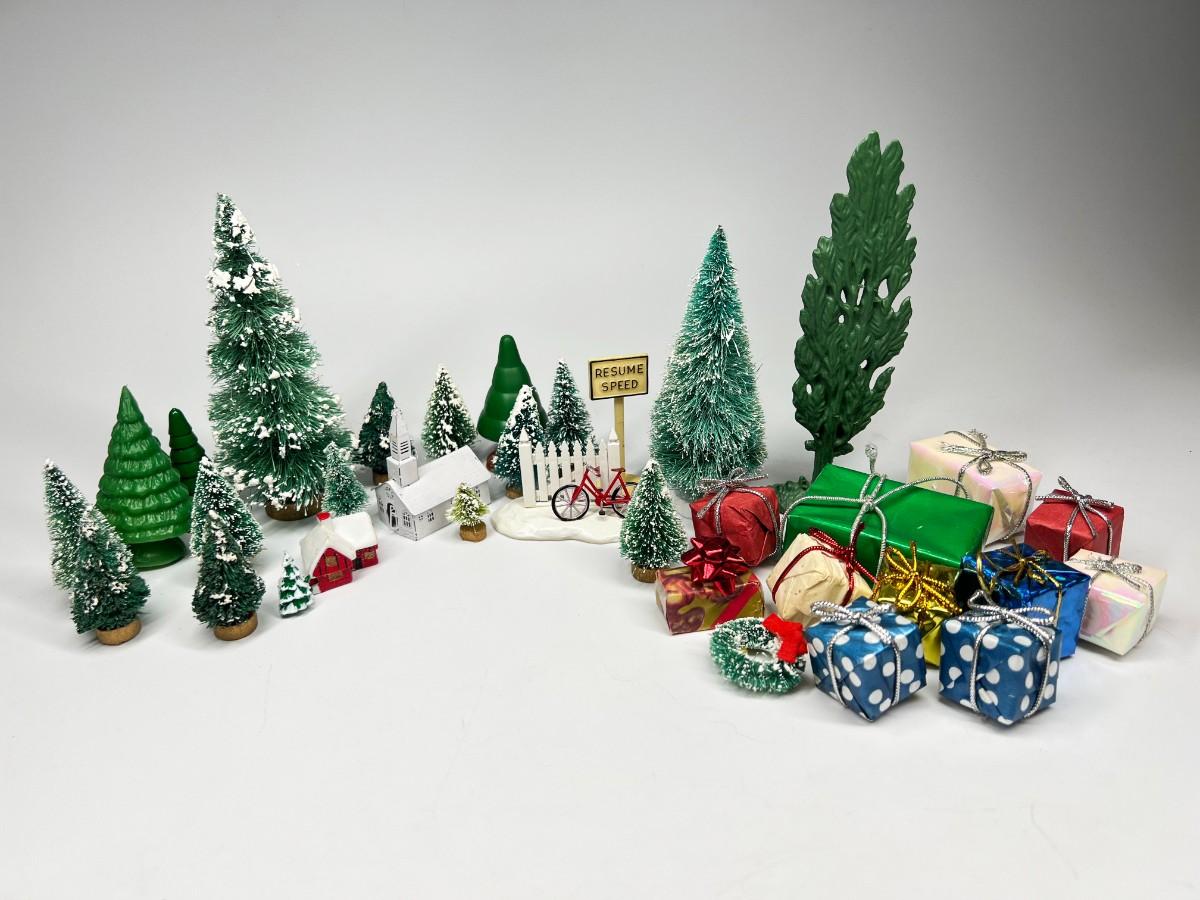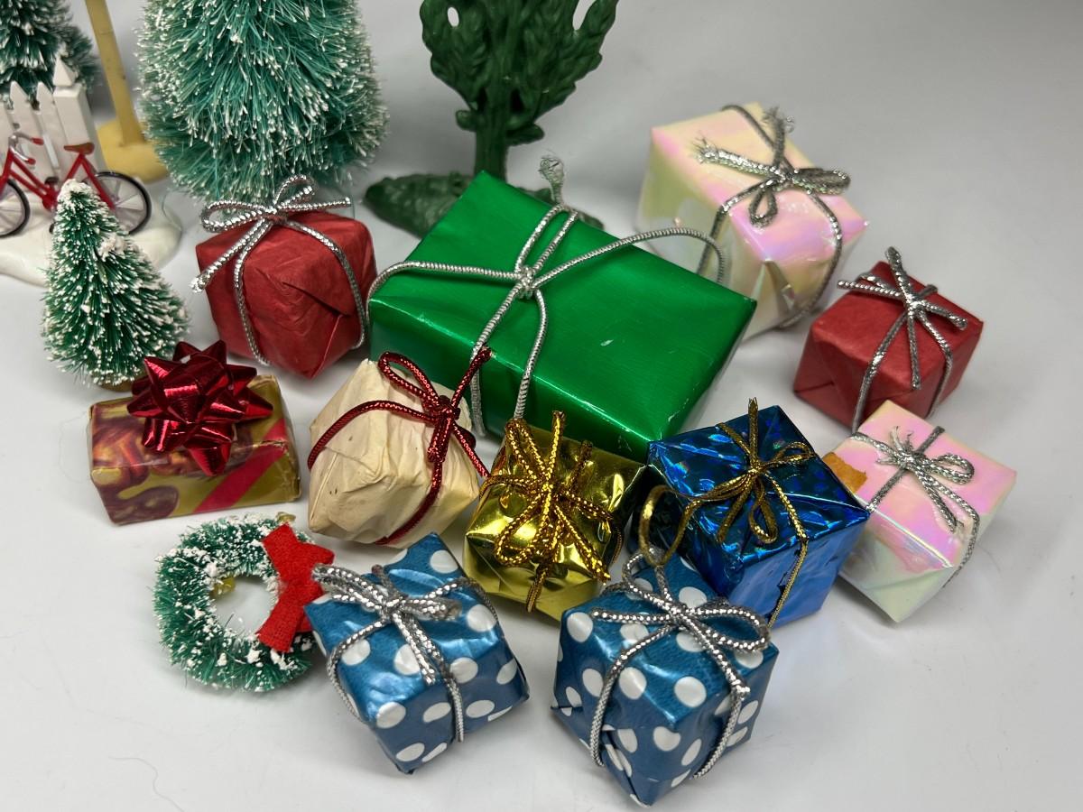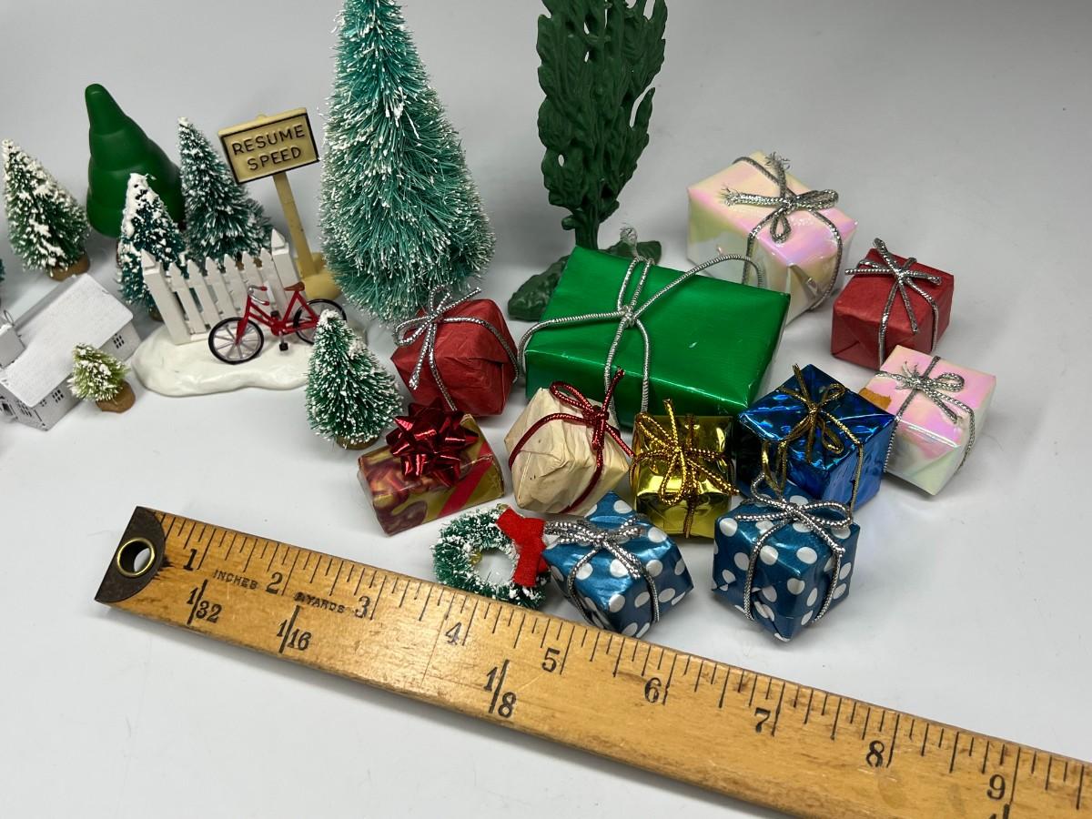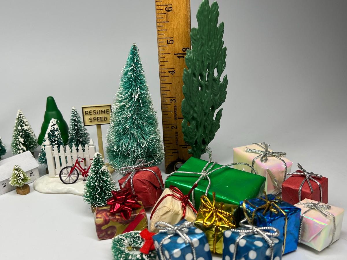 Miniature Snowy Pine Trees Christmas Holiday Buildings & Paper Christmas Presents