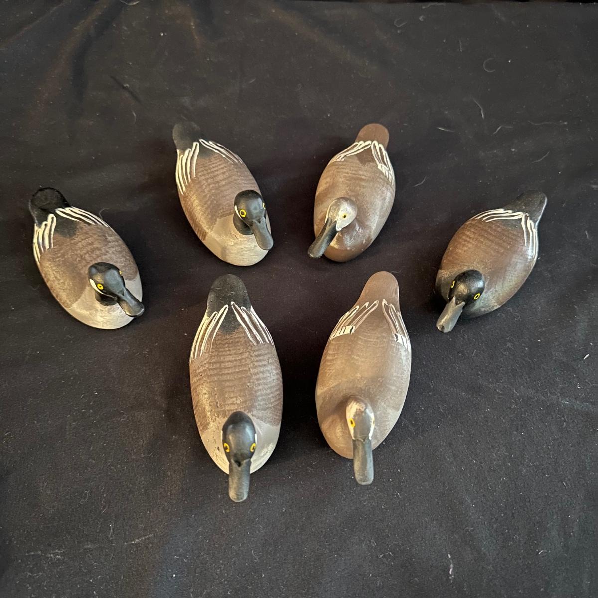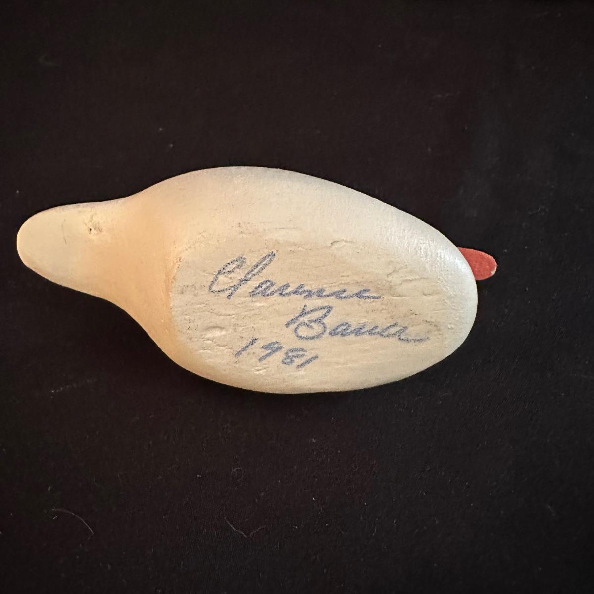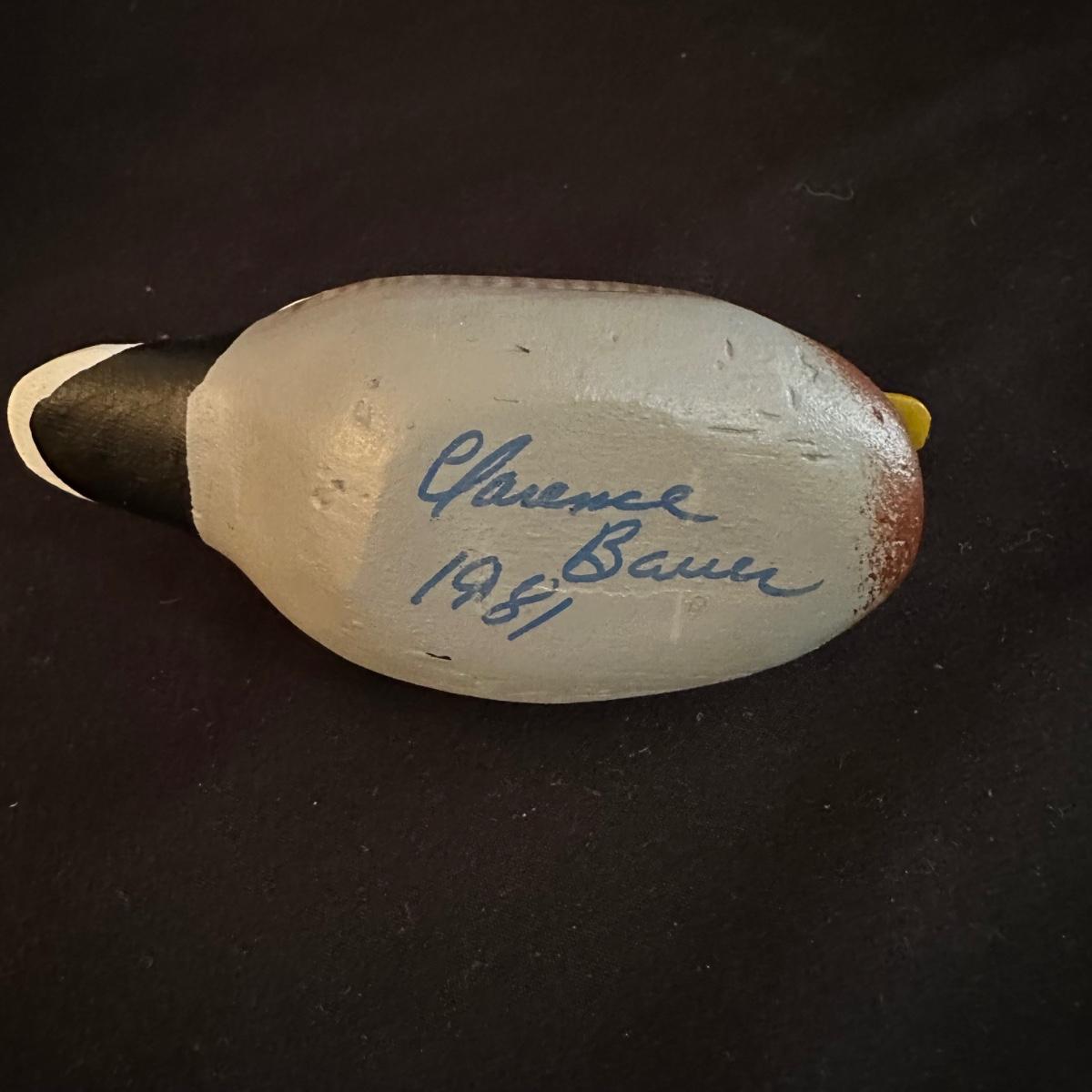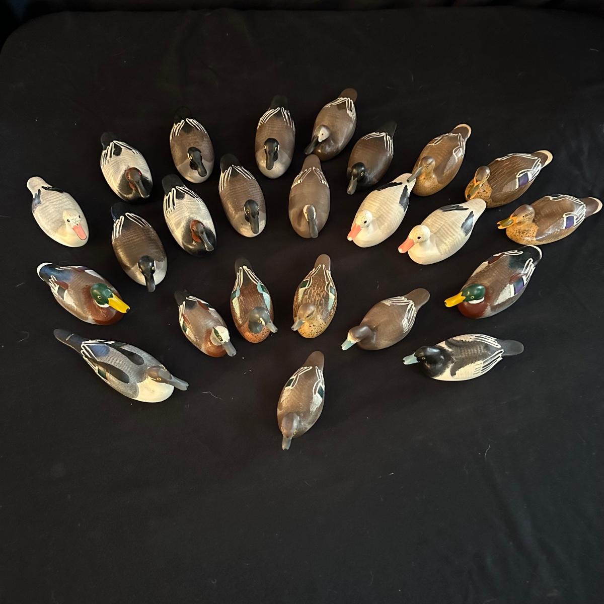 Twenty-four wooden decoys carved and painted by Clarence Bauer. Please see photo for additional history. Almost all are signed. They measure approximately 5” x 2” x 3”H. Shipping available.