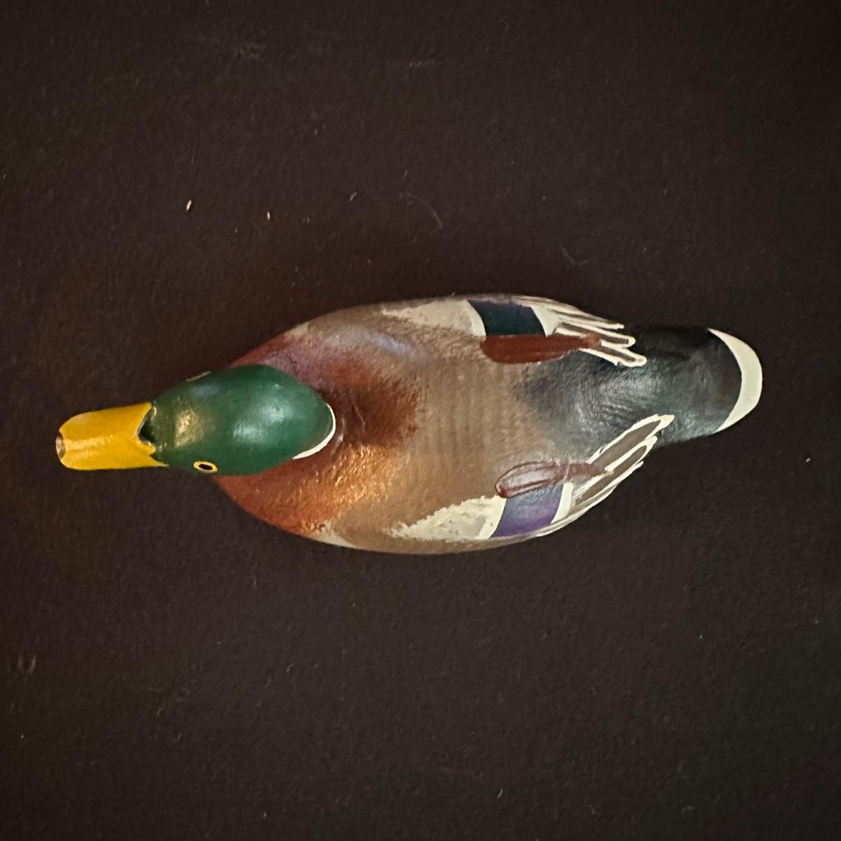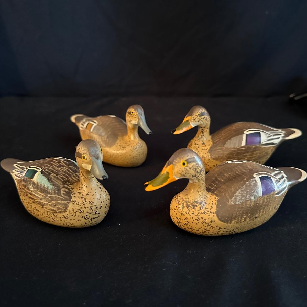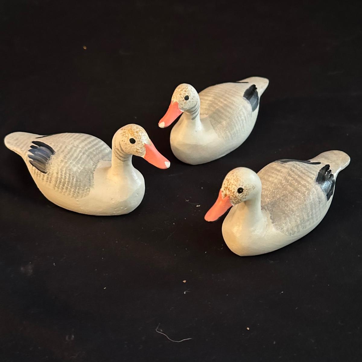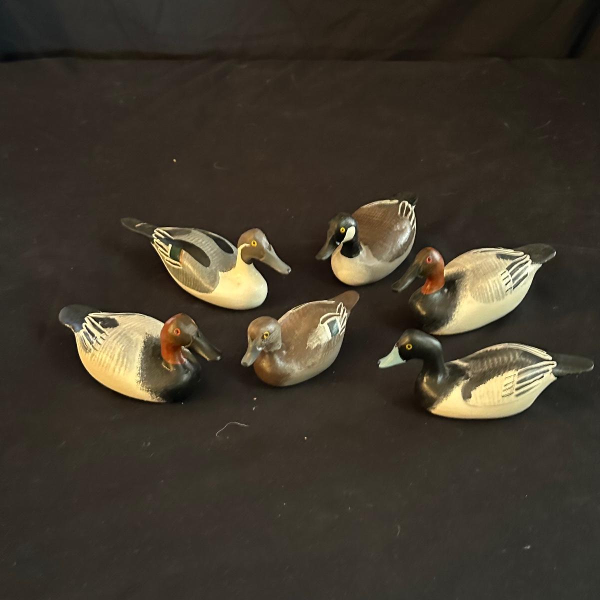 Twenty-four wooden decoys carved and painted by Clarence Bauer. Please see photo for additional history. Almost all are signed. They measure approximately 5” x 2” x 3”H. Shipping available.