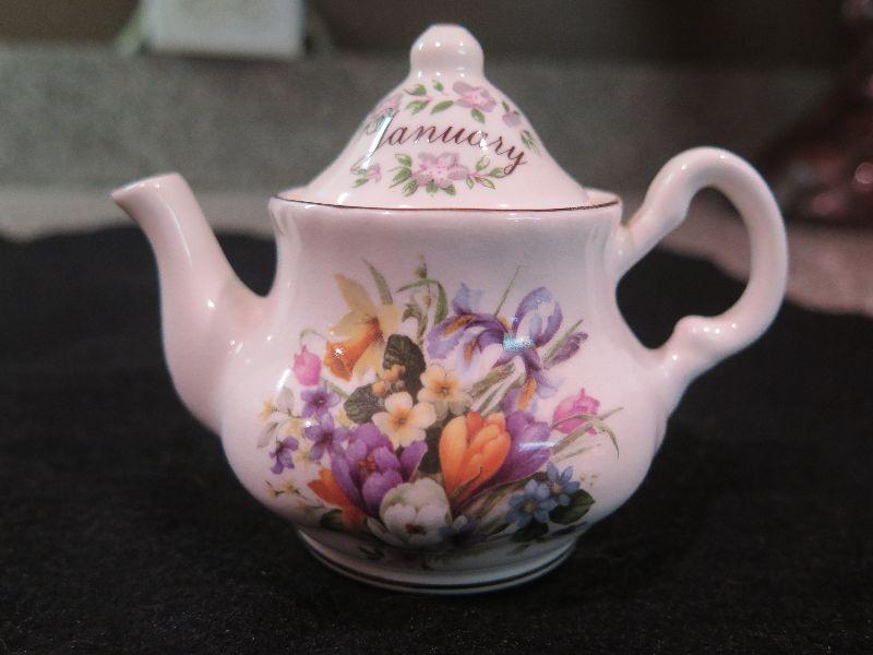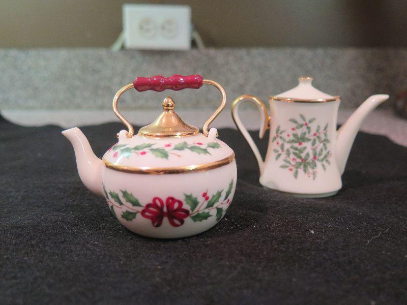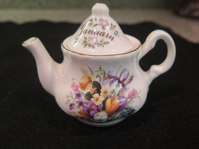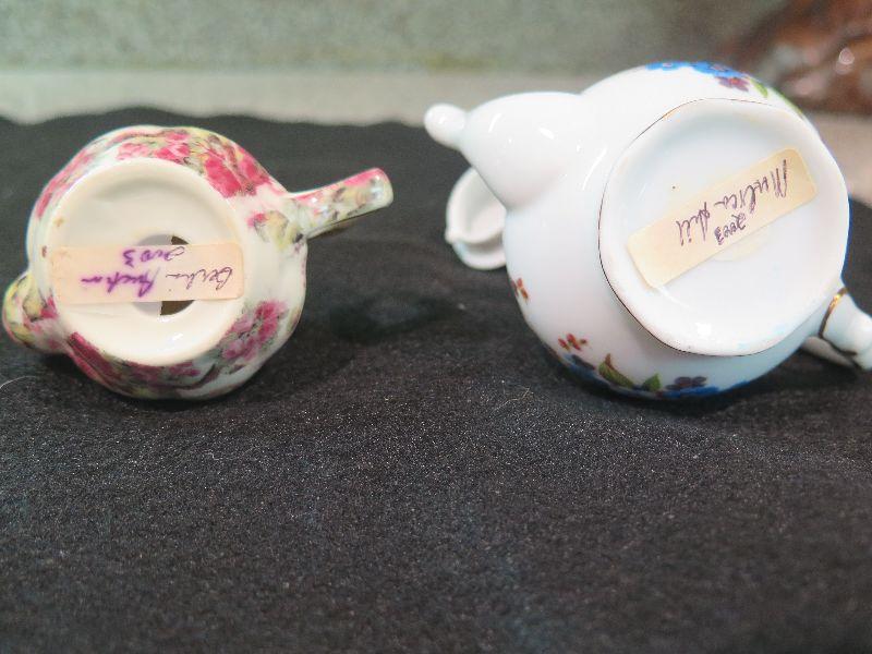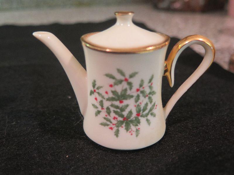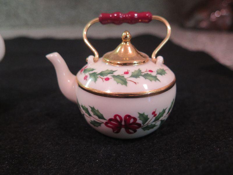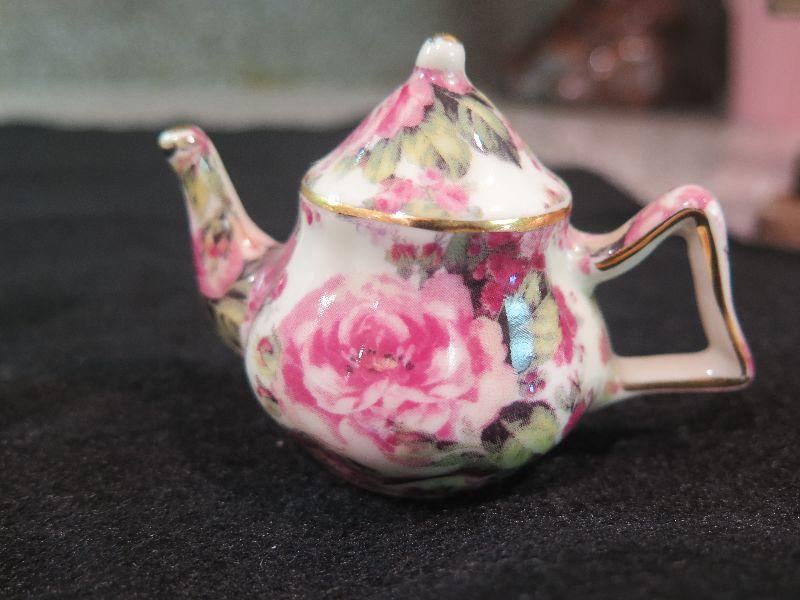 Royal Patrician, Lenox and two unmarked, but very collectable teapots. Tallest is Royal Patrician 3.5 inches. Please read Terms and Conditions before placing a bid. Pick up is Friday, October 25th between 4 and 7, and Saturday, October 26th between 9 and 1. Props included in photos are not included in listing. All measurements are approximate. Comes from home with cats.