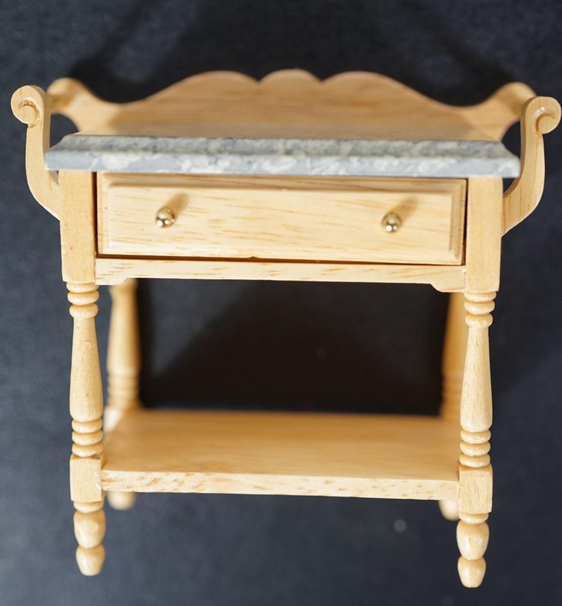 washstand with drawer that opens and tiny brass hardware. faux green plastic marble style top