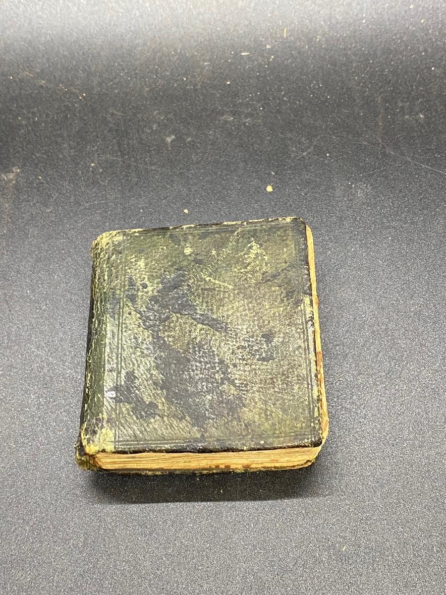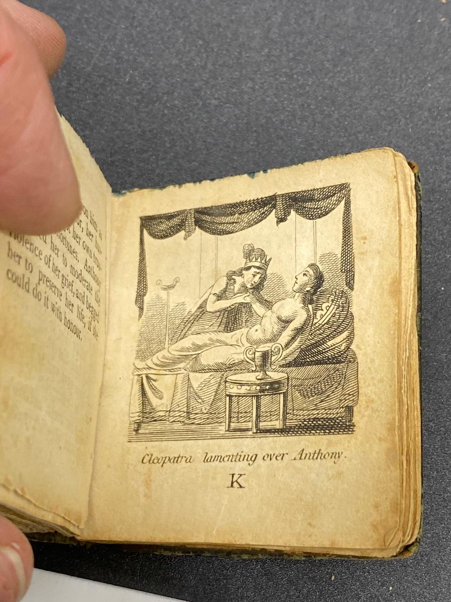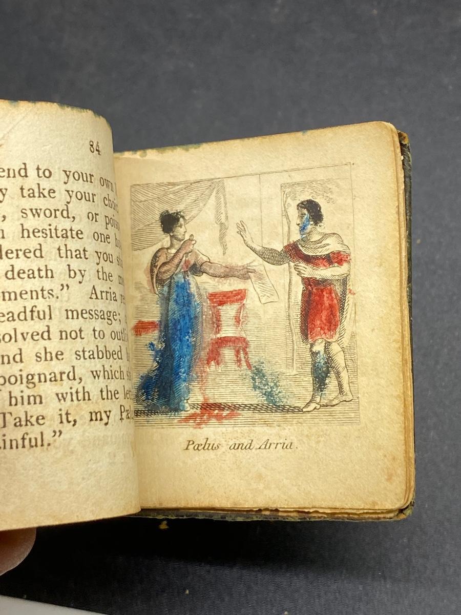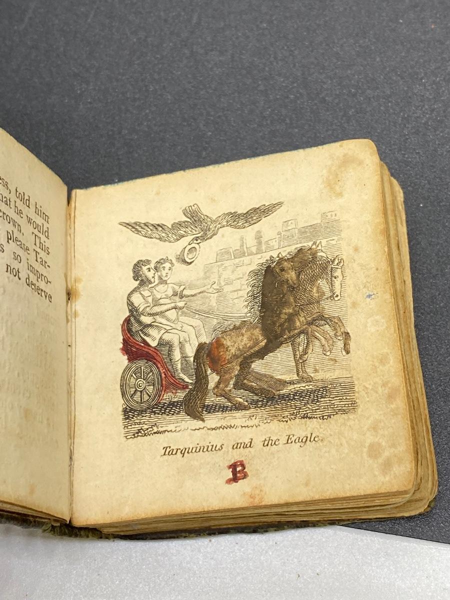 Miniature antique leather bound book, The History of Rome. In worn condition. Looks like someone tried to color some of the illustrations. Under 3" size.