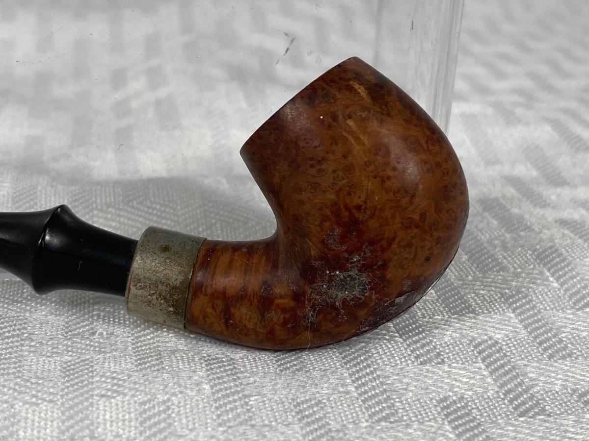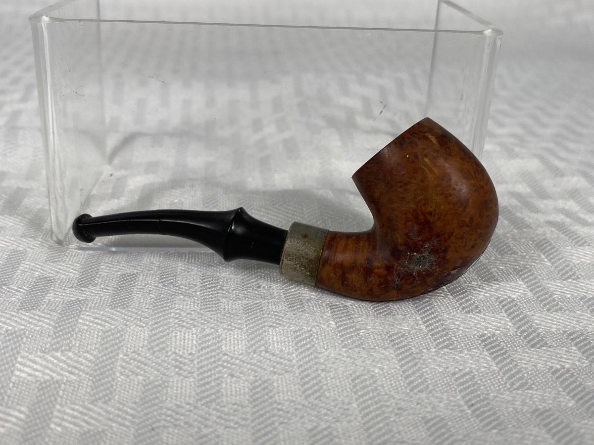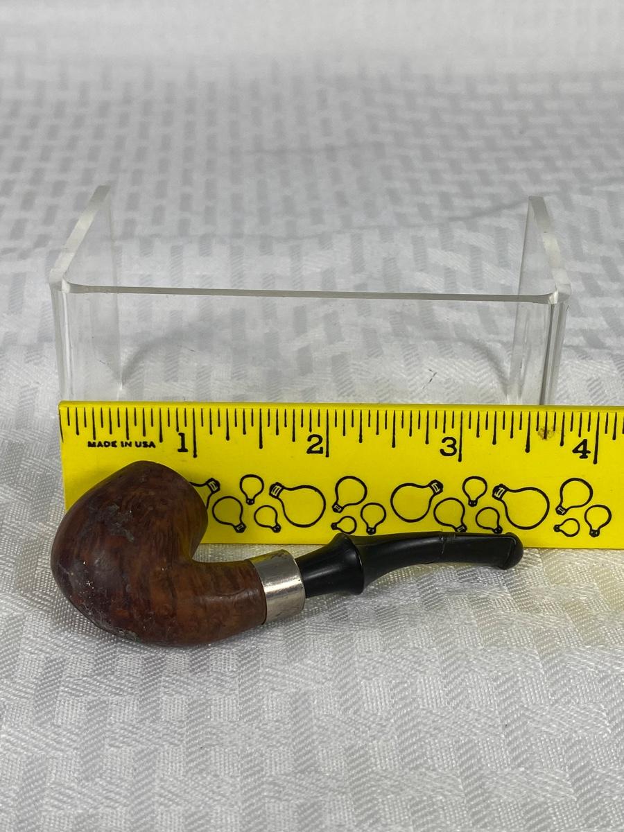 Miniature Tiny Tobacco Pipe. Has tack on the wood bowl, was possibly stuck to something like a display or doll. In otherwise good condition. About 3.5'.