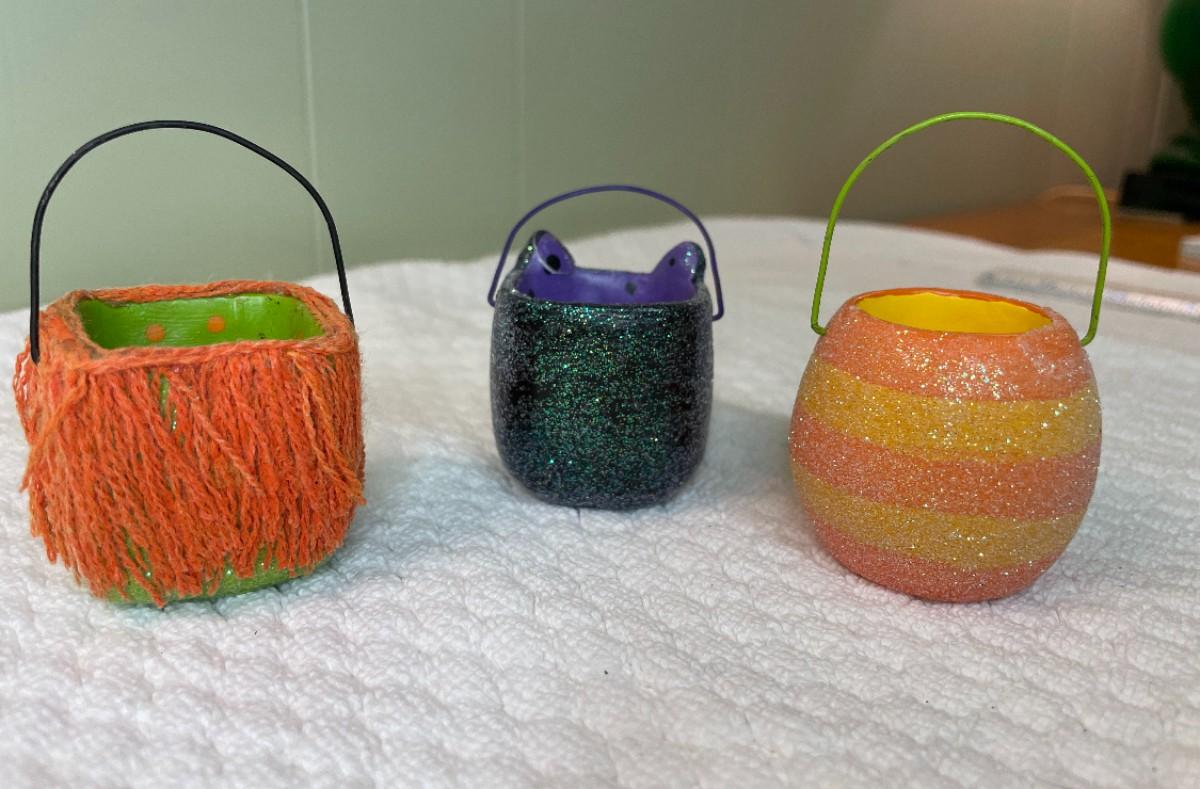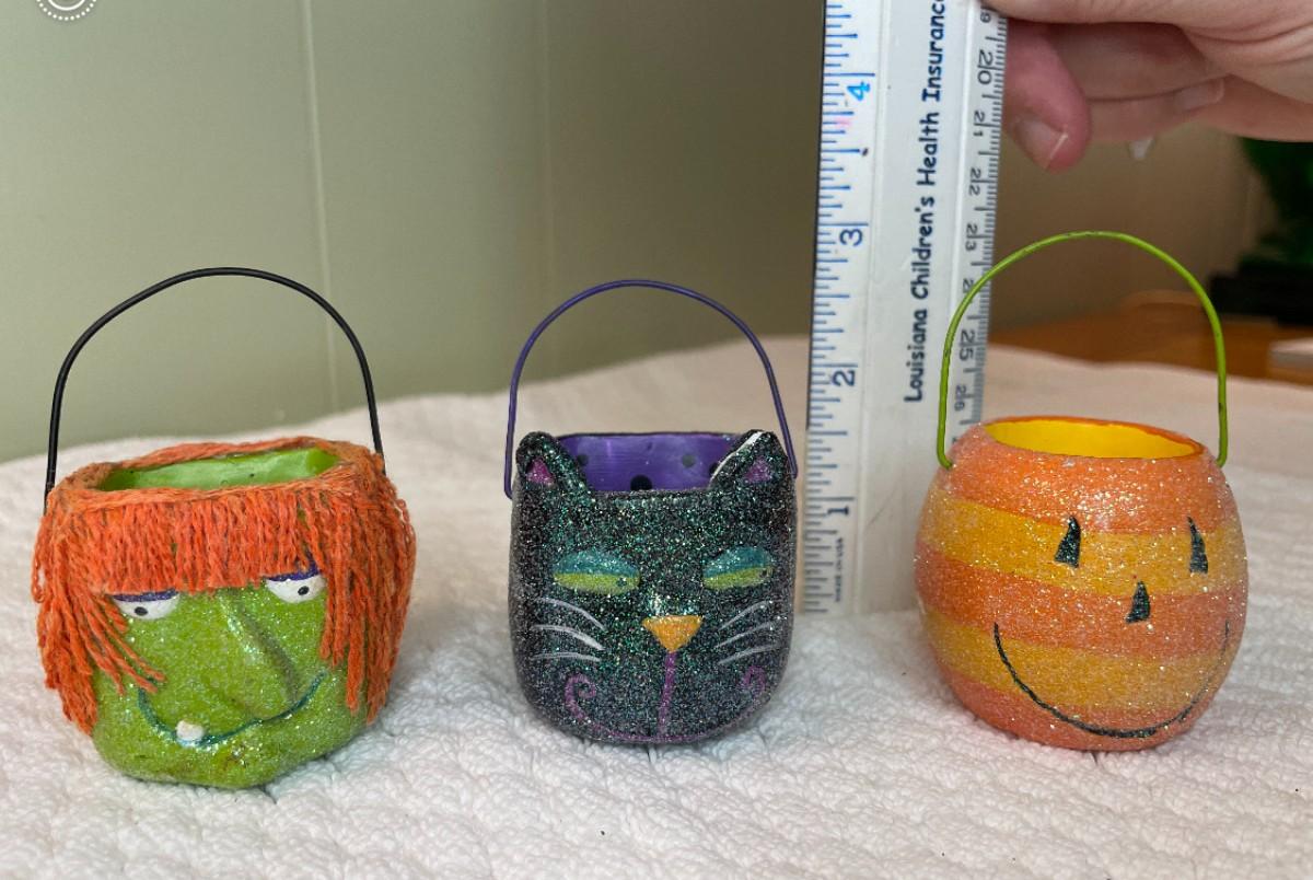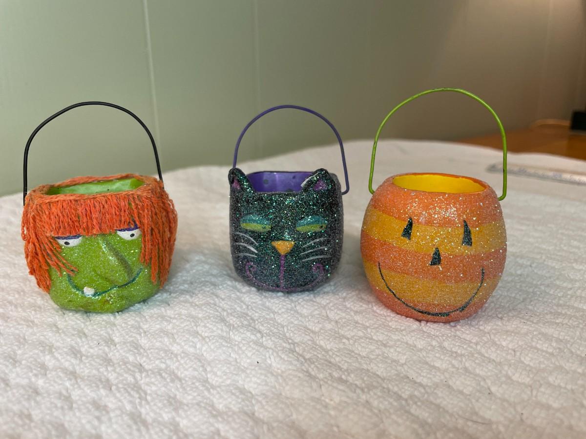 Darling miniature treat bucket ornaments, 2" high or 3" high including handle. Witch, pumpkin and cat. Cat has a small repair on ear. Composite materials.
