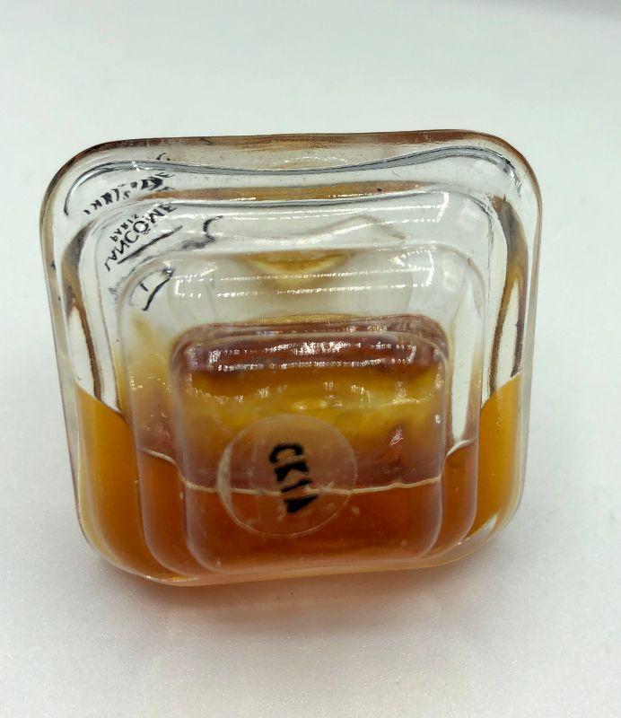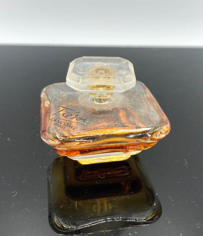 Mini "Tresor" perfume bottle by Lancome Paris. About half full. Bottle stands about 1".