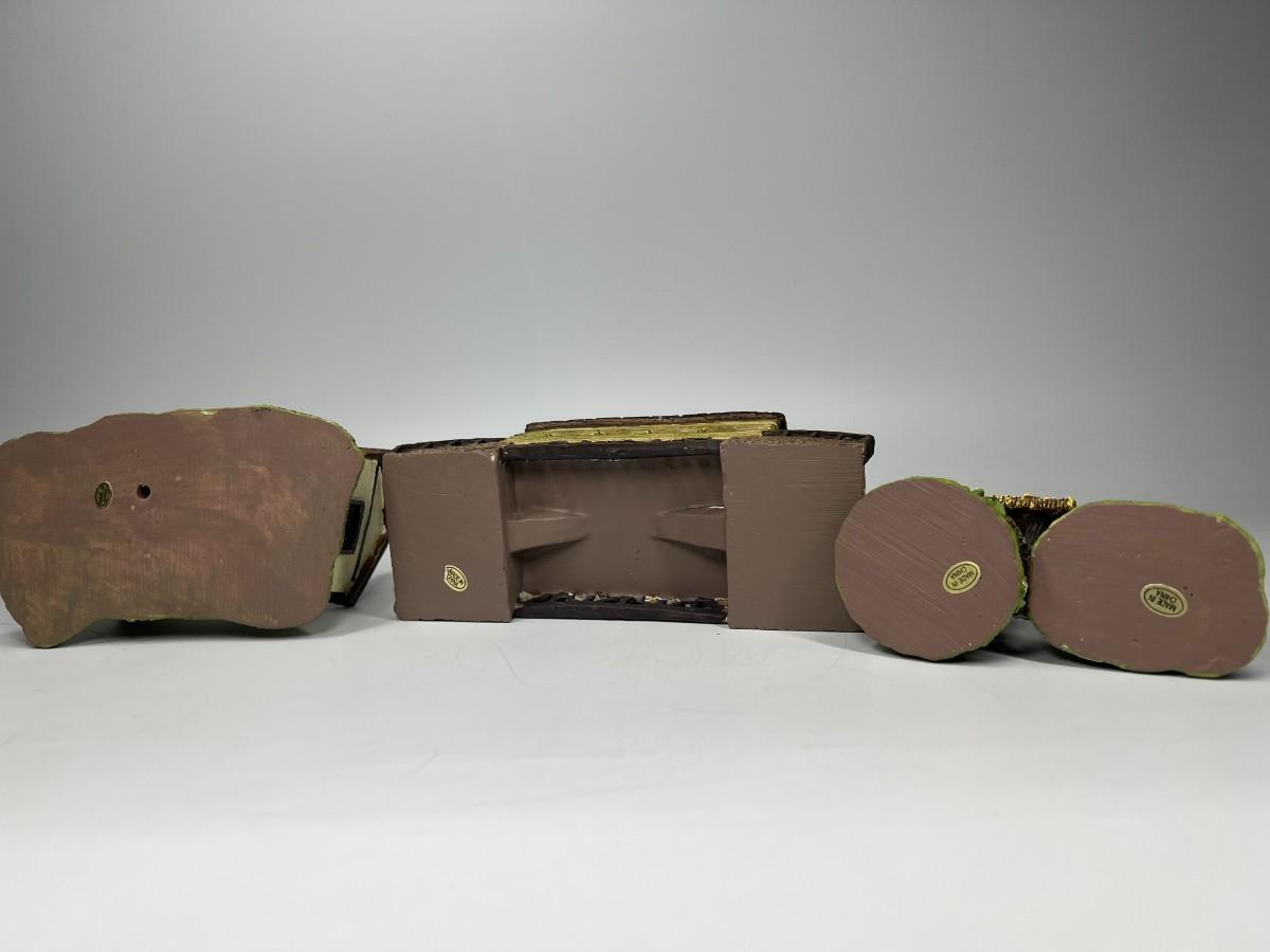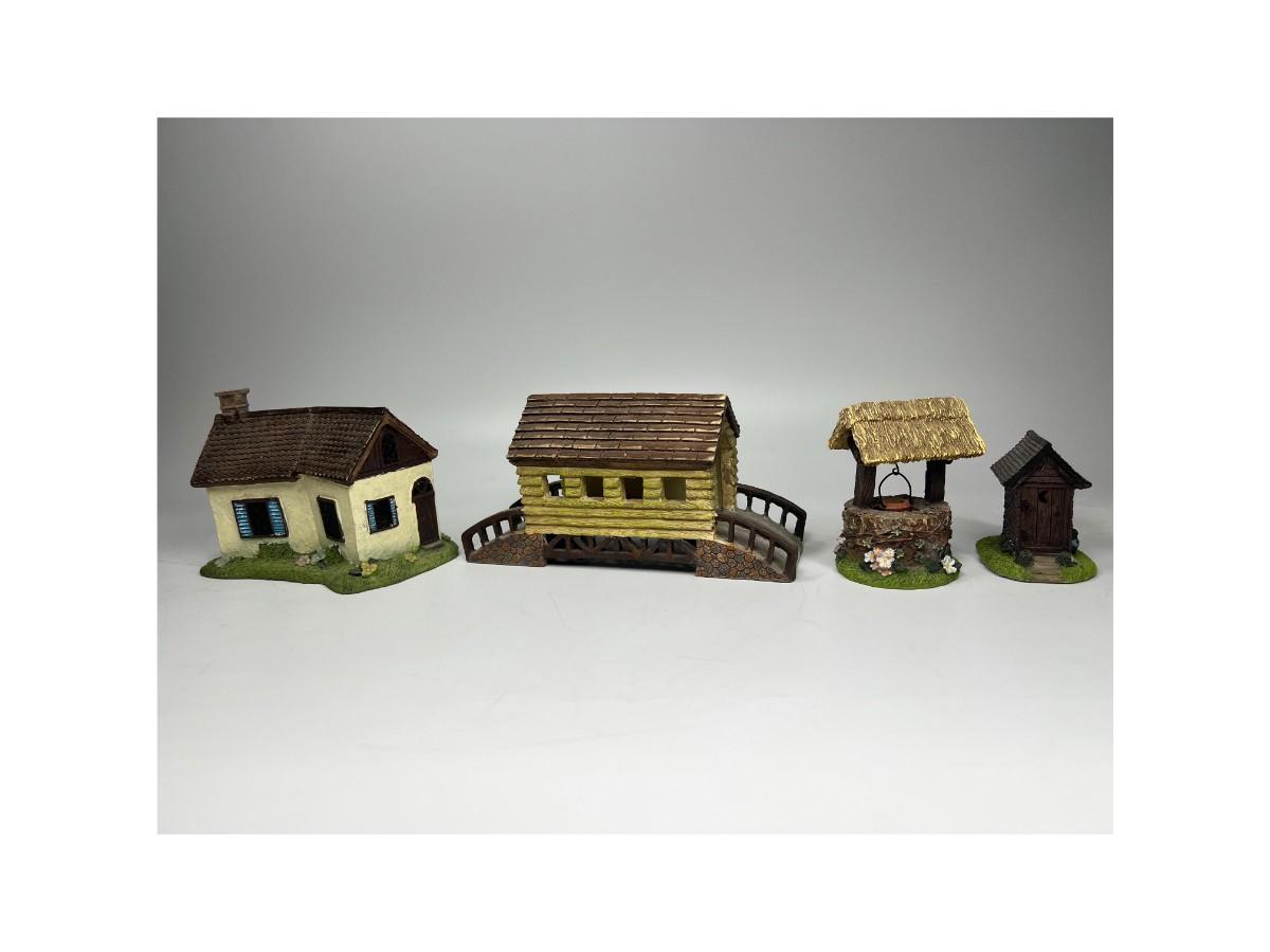 Set of 4 miniature village figurines. Small cottage, a covered bridge, a wishing well and an outhouse. Good conditions. Add to existing village, put in the garden or display in the home. Under 5" size.