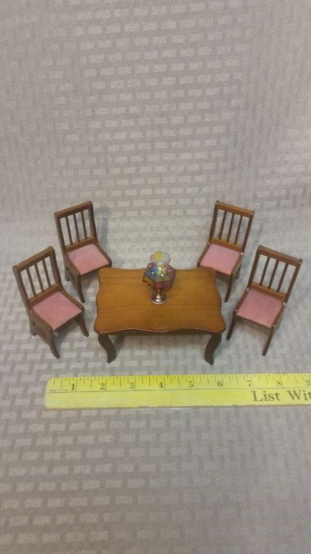 All wood miniature Dining Table with four chairs. Table is 4 1/2" × 3 1/2" × 2 1/4"