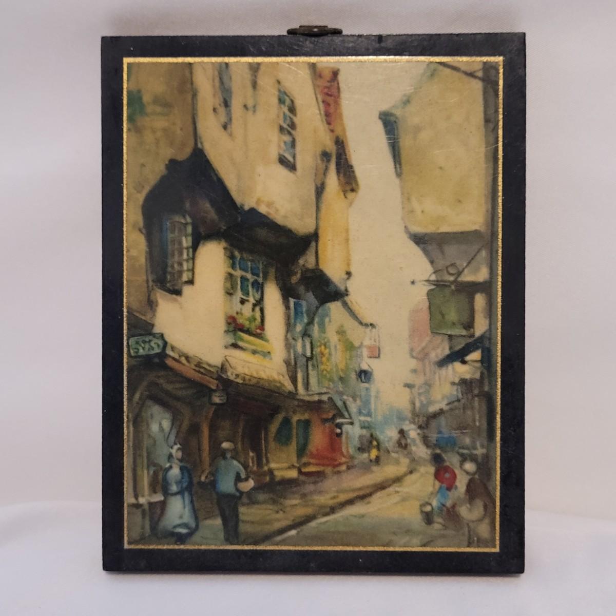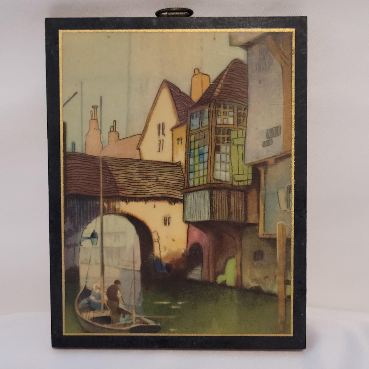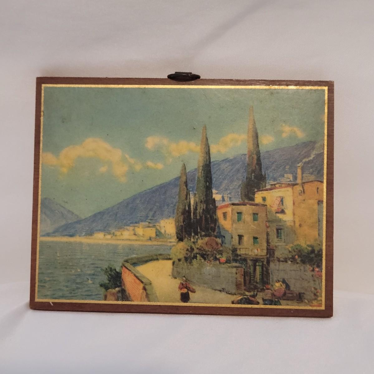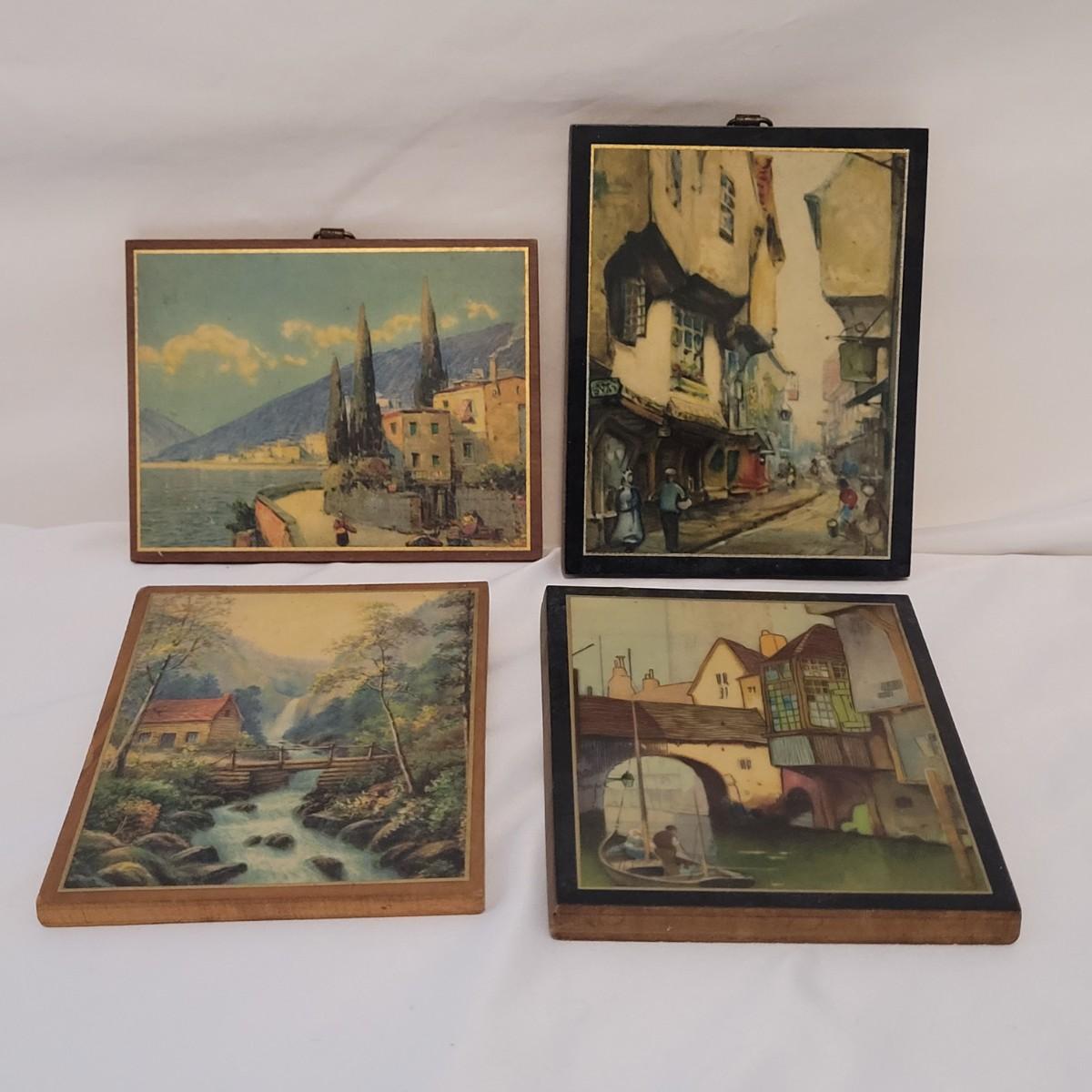Four miniature wooden plaques featuring images of French villages and countryside. All four plaques appear to be made from layers of pressed wood and feature a metal mounting ring for hanging. One image shows a creekside cabin in a mountainous region. Another shows a lakeside villa with mountains in the background. Another shows a boat on a canal in a village. And the final plaque shows a street in the middle of a crowded village. Plaques are 4" x 4.5".
