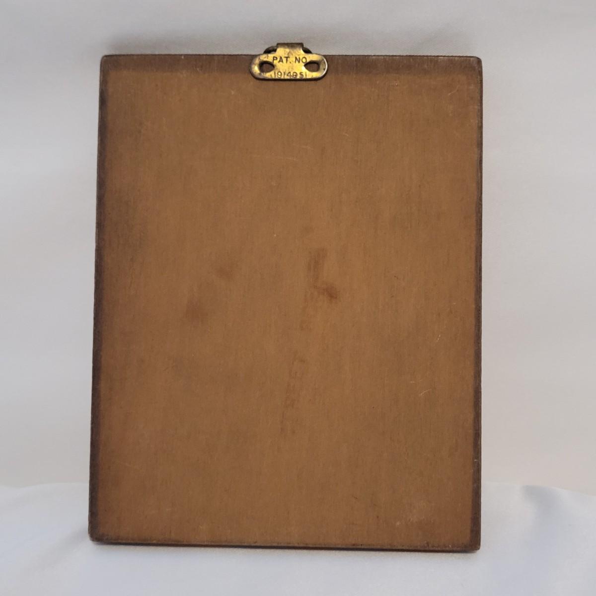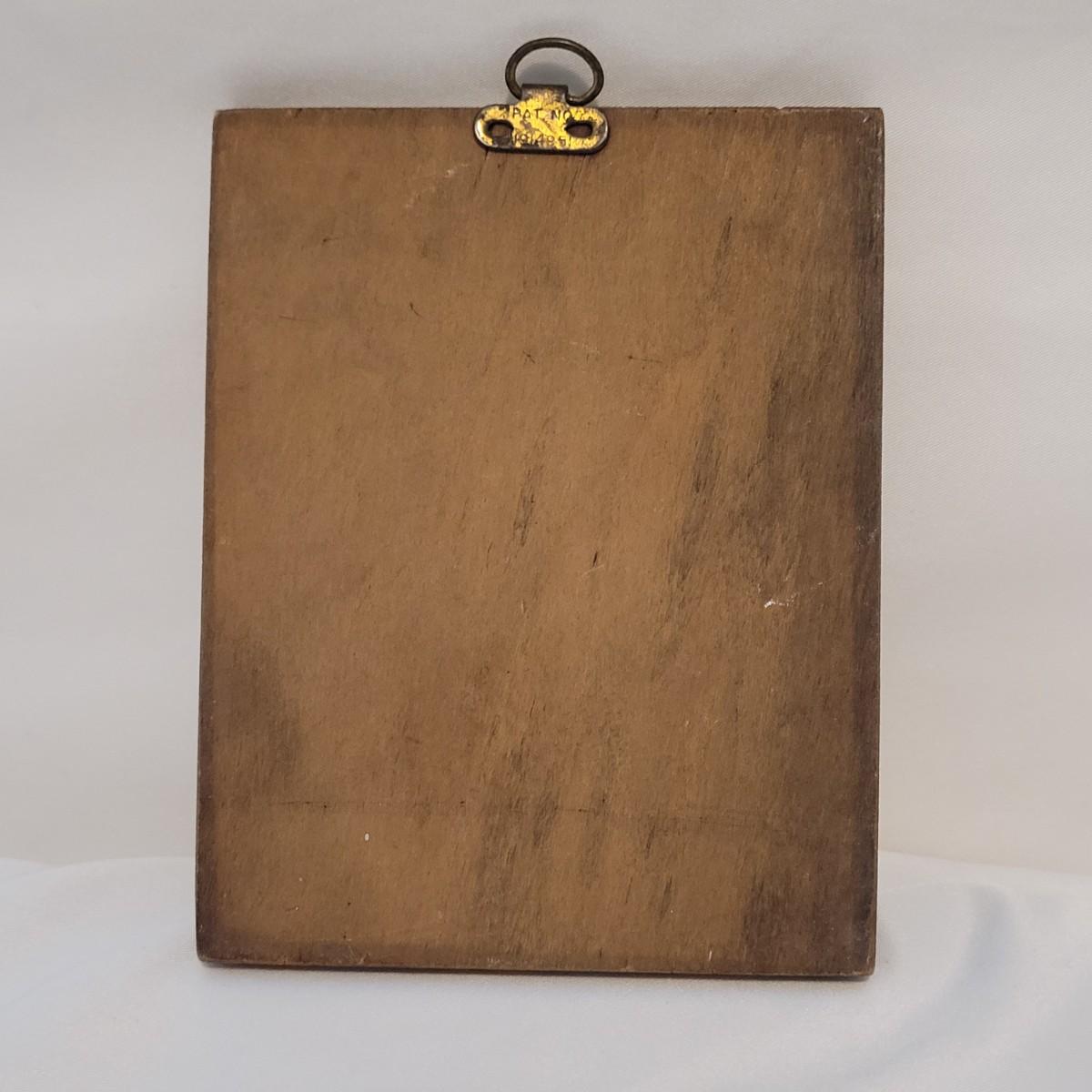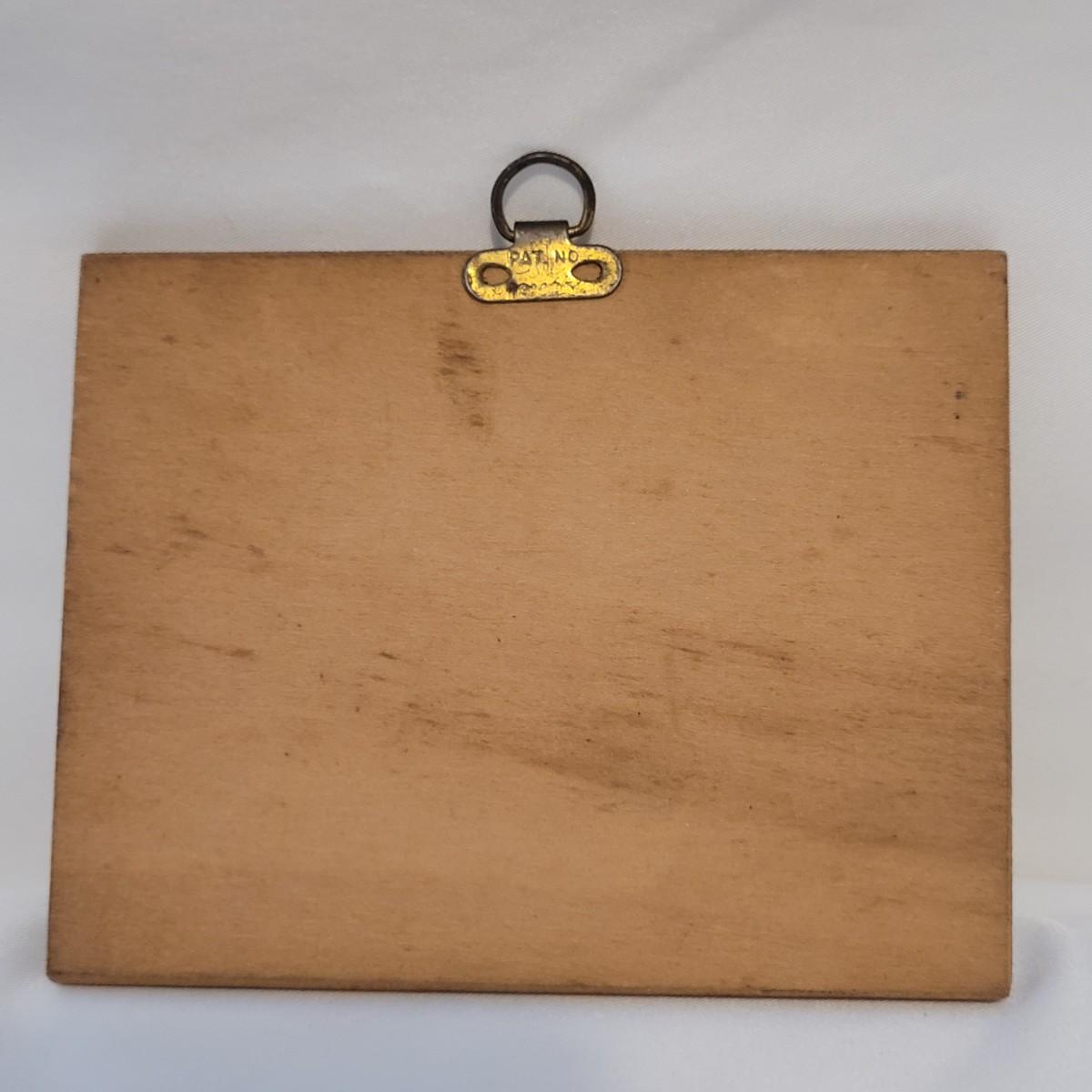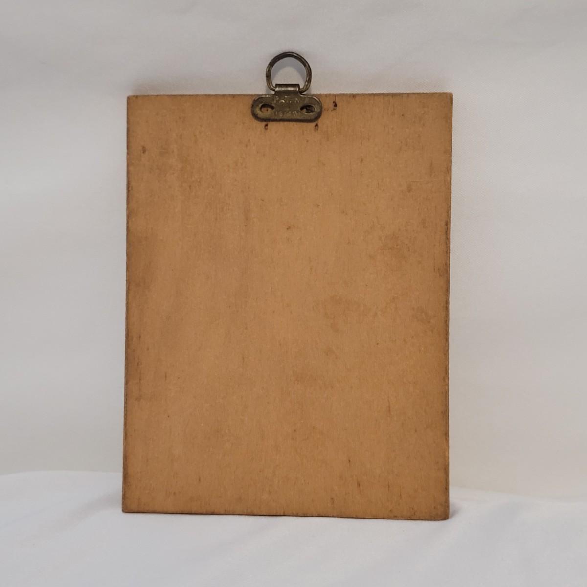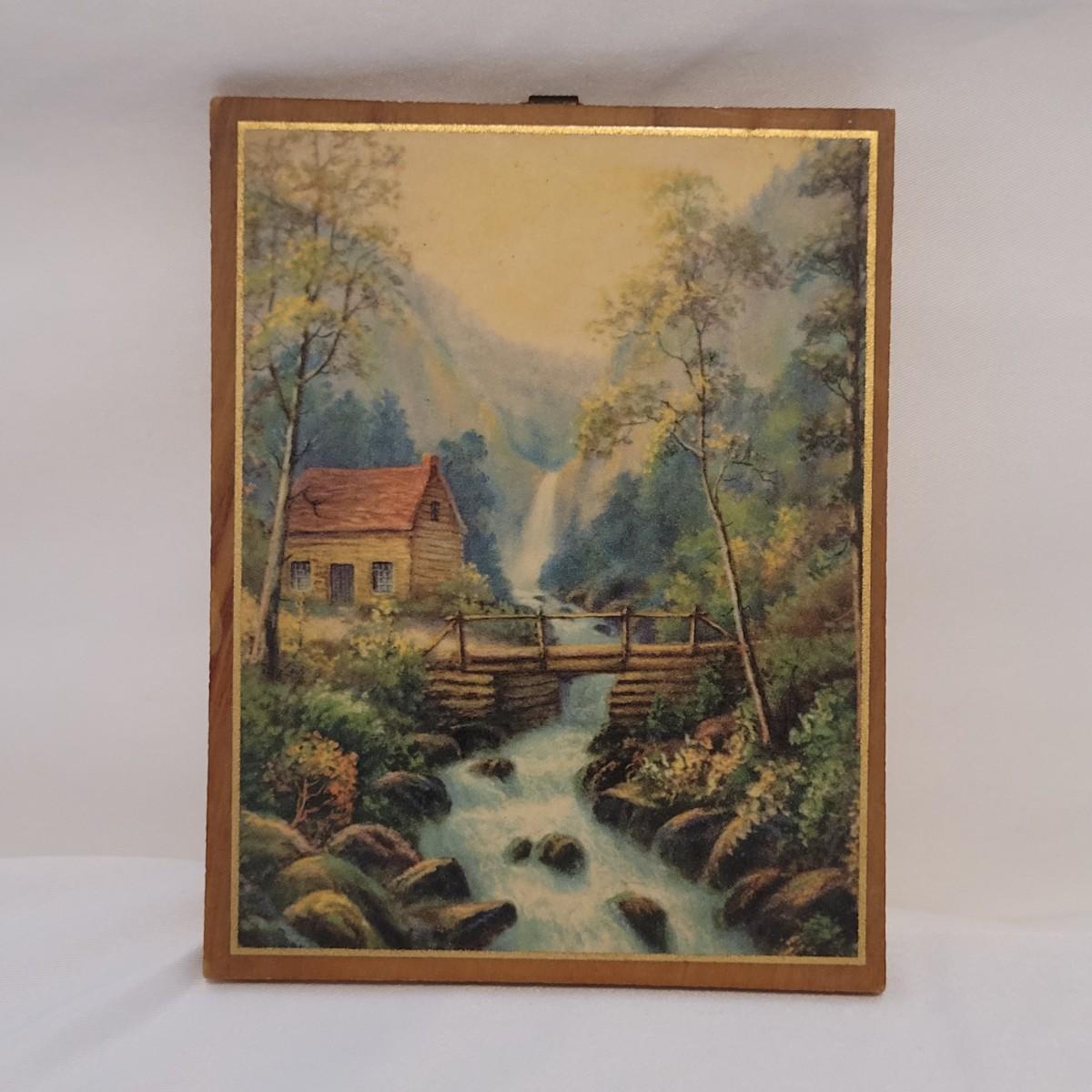 Four miniature wooden plaques featuring images of French villages and countryside. All four plaques appear to be made from layers of pressed wood and feature a metal mounting ring for hanging. One image shows a creekside cabin in a mountainous region. Another shows a lakeside villa with mountains in the background. Another shows a boat on a canal in a village. And the final plaque shows a street in the middle of a crowded village. Plaques are 4" x 4.5".