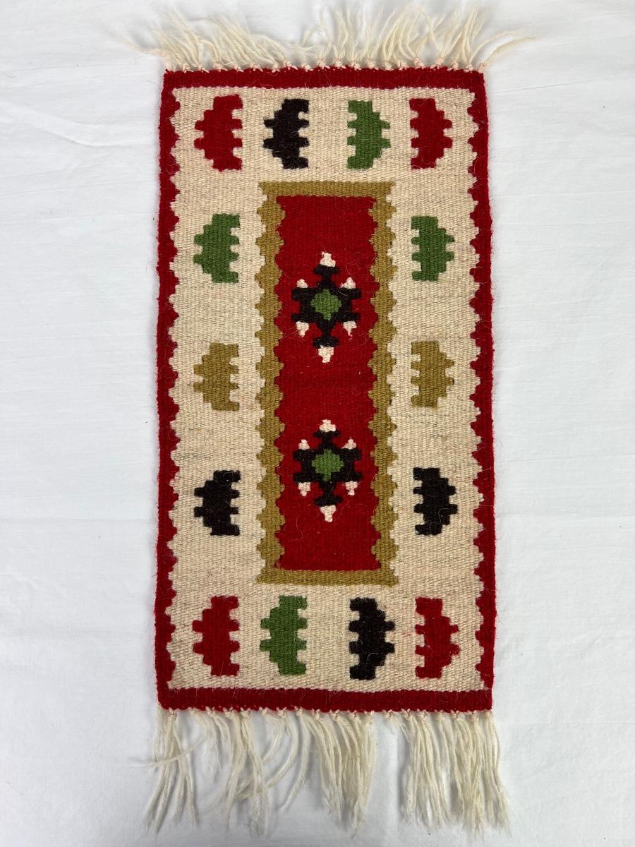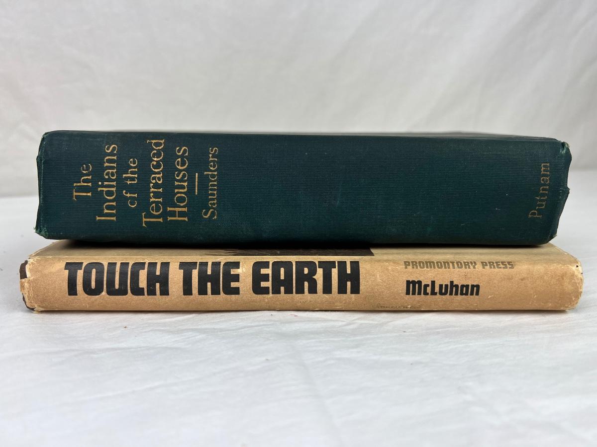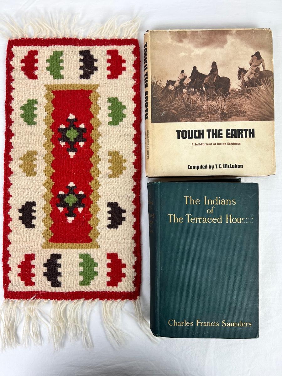 Miniature woven southwestern wool rug and pair of Indian books “The Indians of The Terraced House” by Charles Francis Saunders & “Touch the Earth” by T.C. McLuhan.