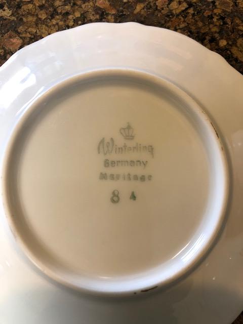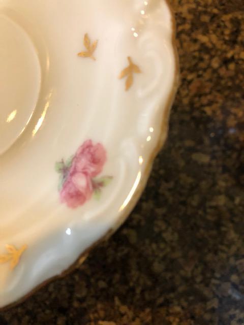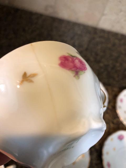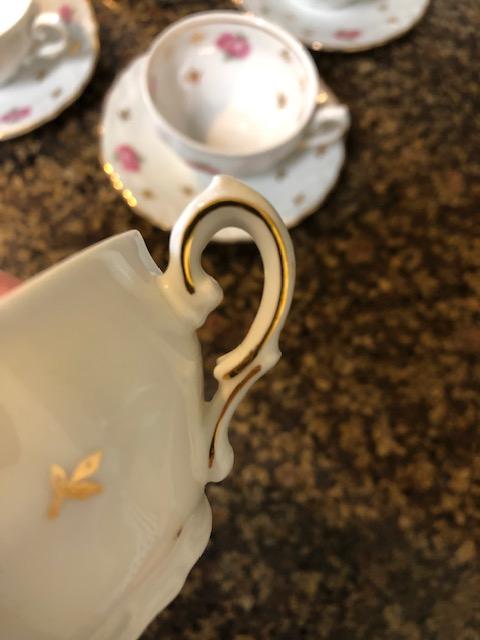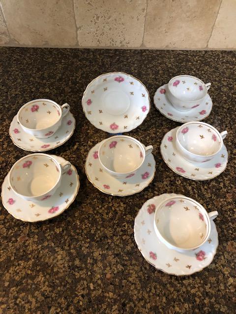 6 Tea cups measuring 1 1/2” tall and 2 5/8” in diameter. One cup has a hairline crack and one has a rough spot on the handle as shown in pic. 7 saucers. No chips. One has a bit of gold trim missing from use. $30 for all 13 pieces.