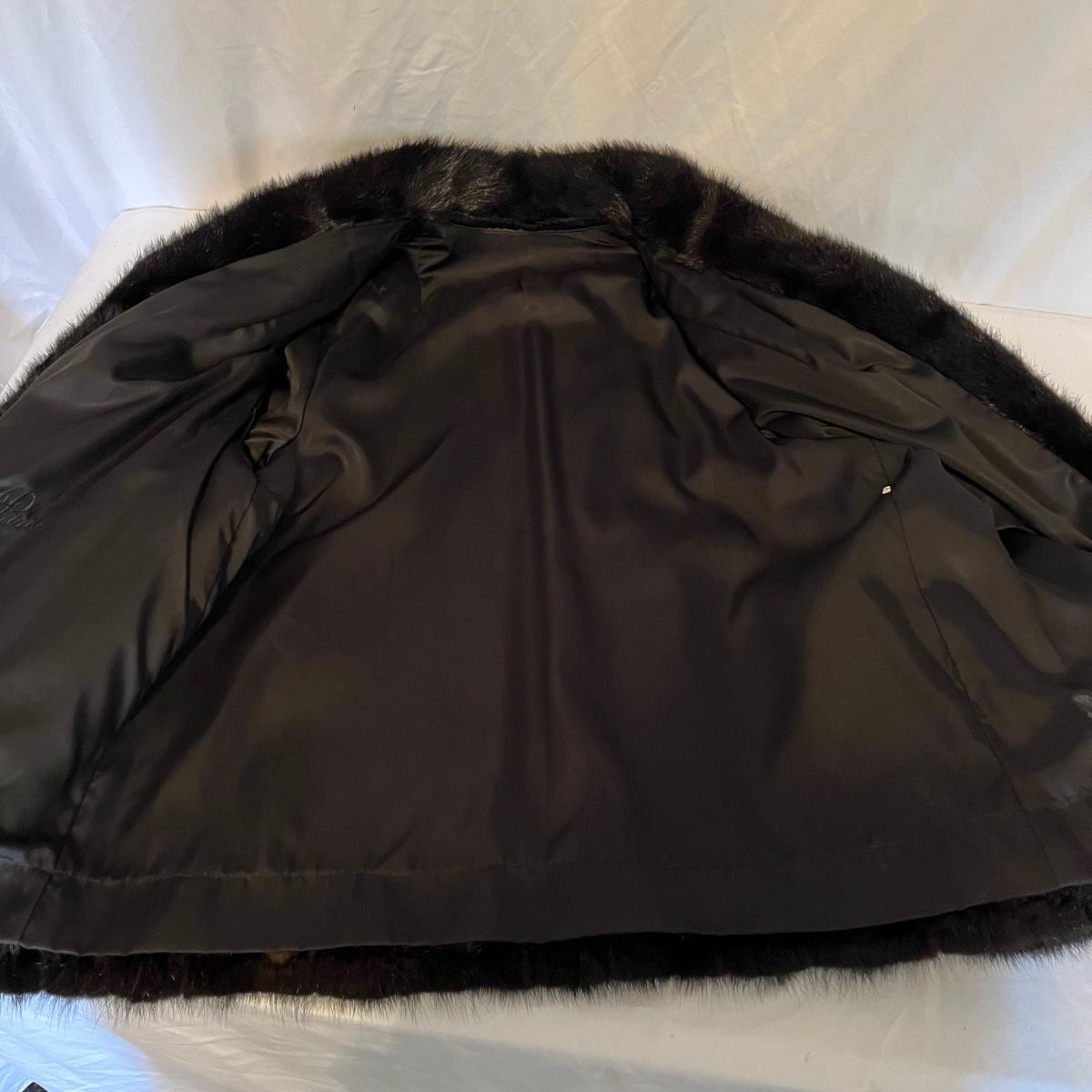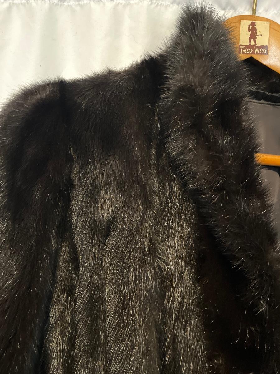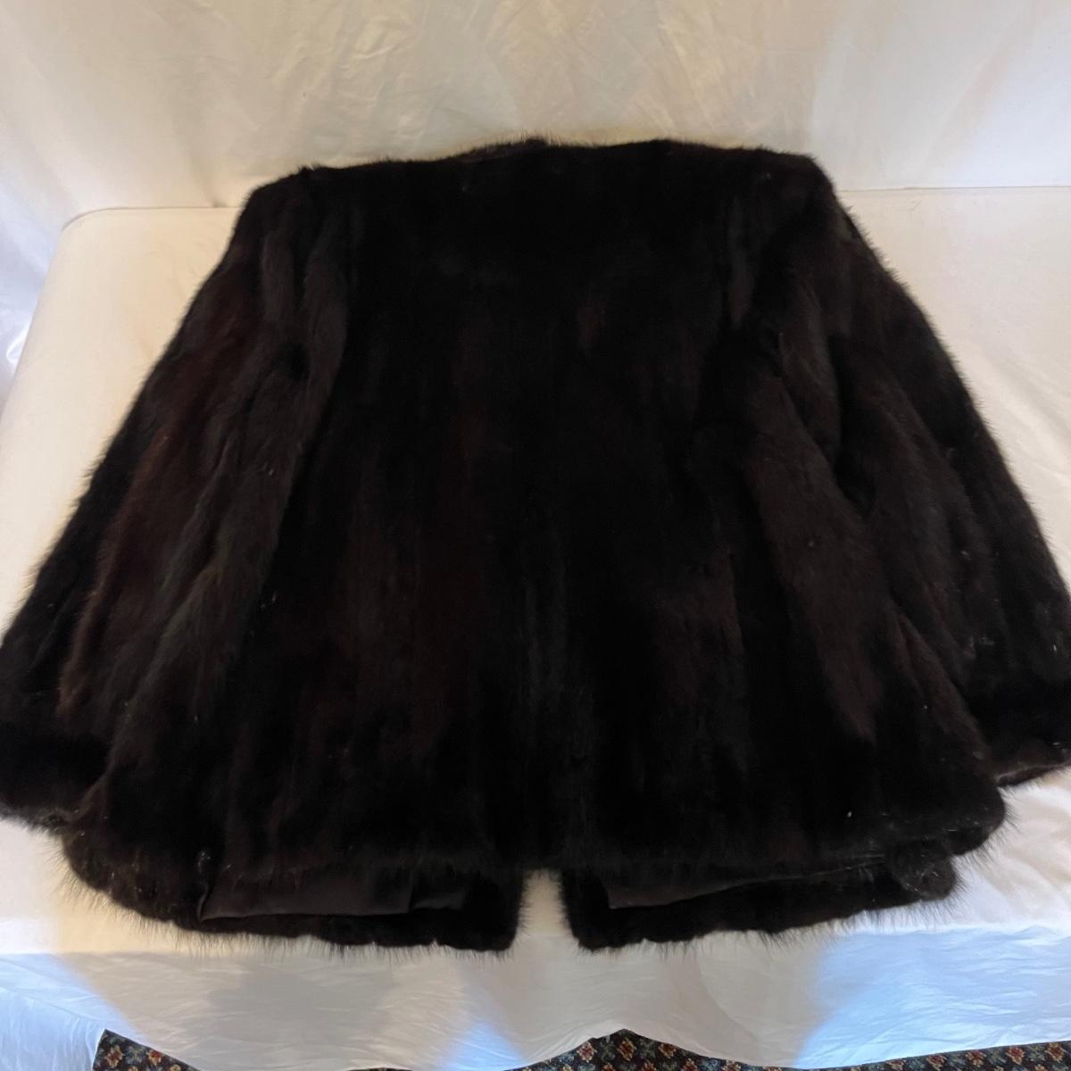 Lot includes a mink coat, size 14 with a black lining with Josephine stitched inside the lining. The coat has an inside pocket near the front and two deep pockets on the outside. There is a hook on the right side yet doesn’t appear to be an eyelet on the left. This coat is heavy and has no tears or frays-excellent condition.