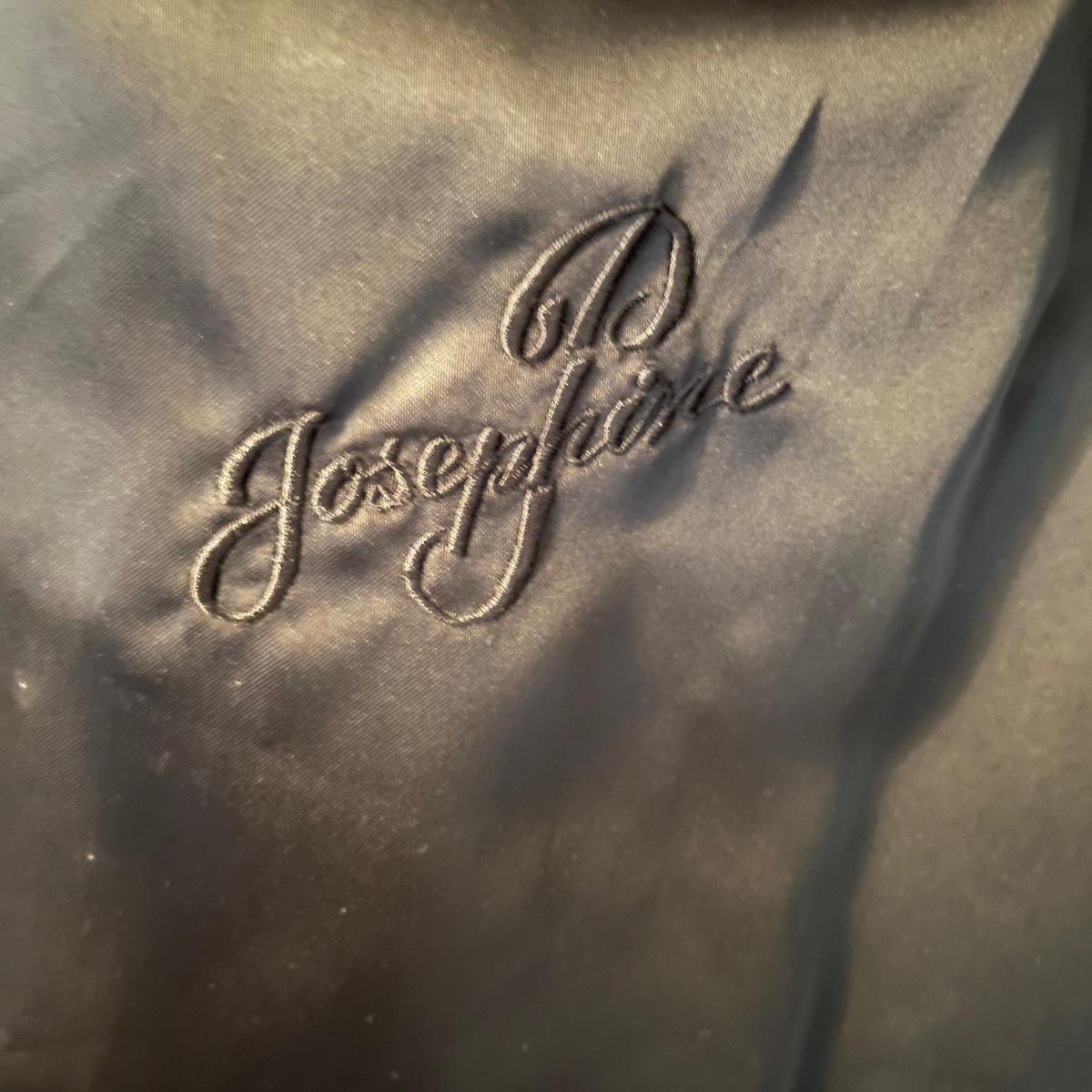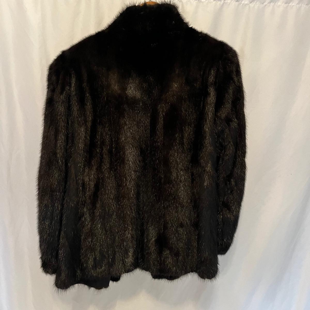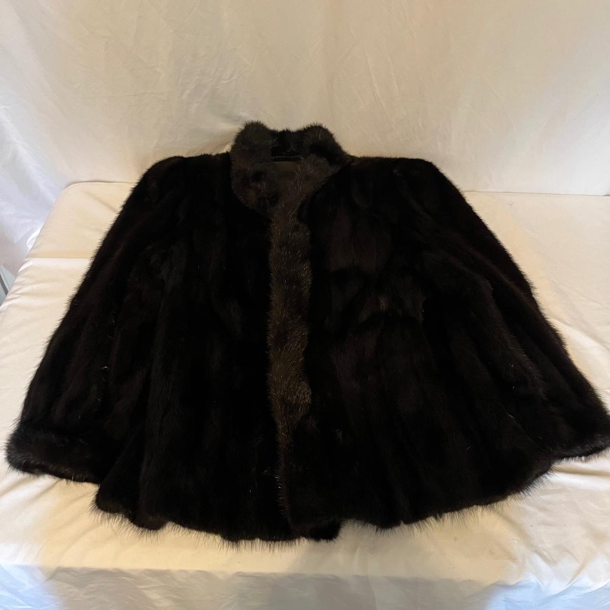 Lot includes a mink coat, size 14 with a black lining with Josephine stitched inside the lining. The coat has an inside pocket near the front and two deep pockets on the outside. There is a hook on the right side yet doesn’t appear to be an eyelet on the left. This coat is heavy and has no tears or frays-excellent condition.