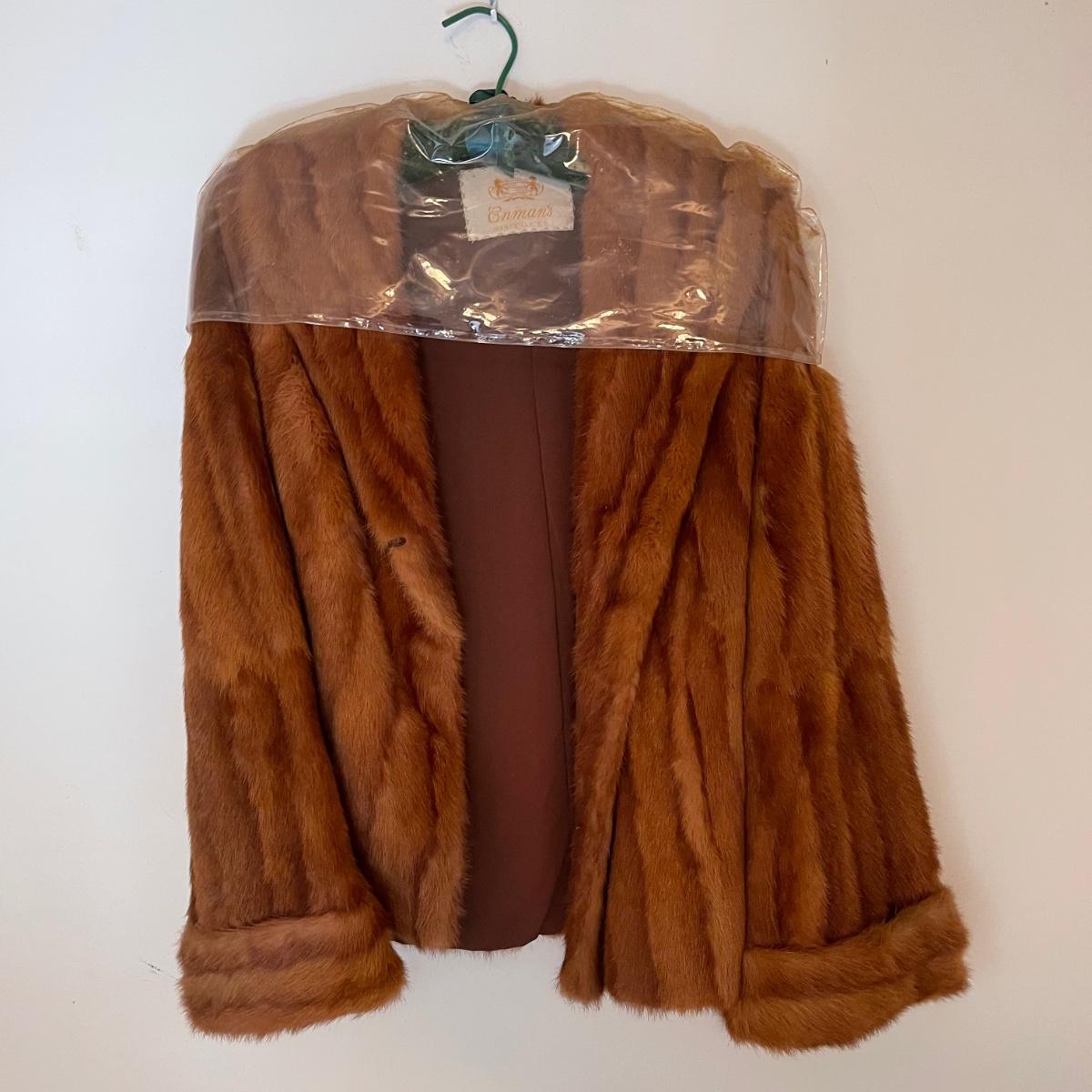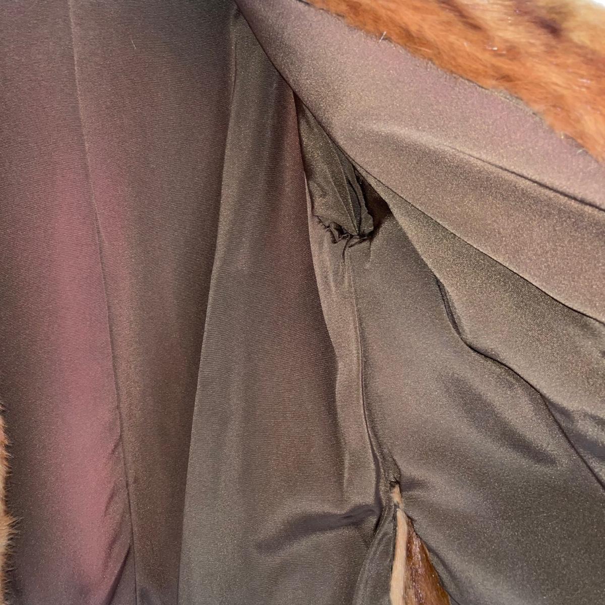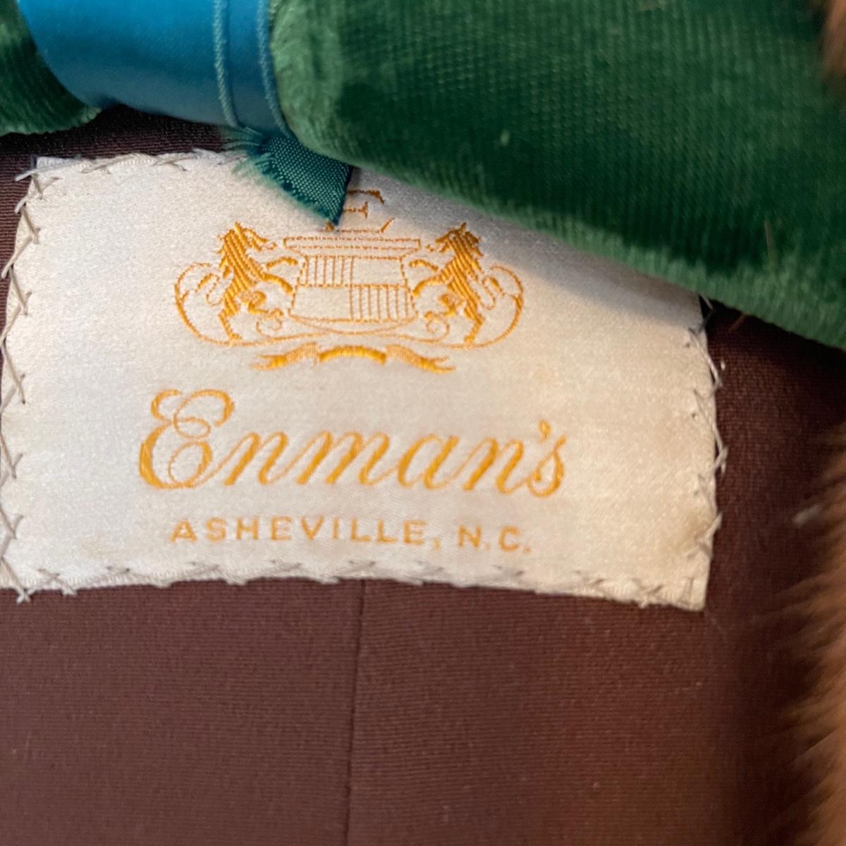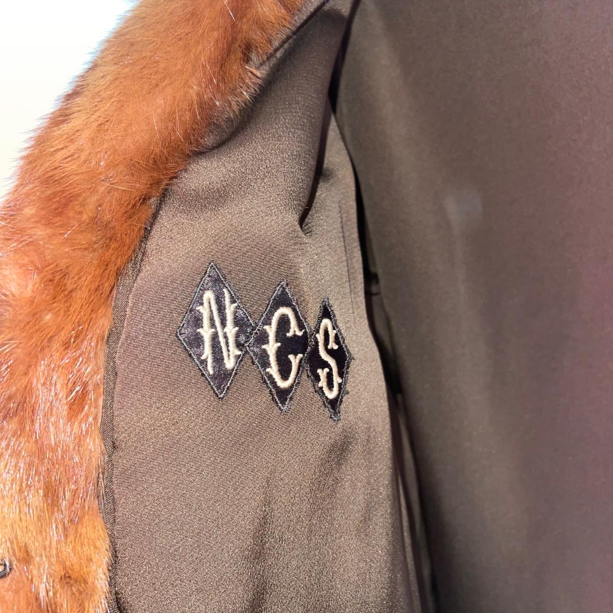 Enman’s mink coat with a personalized monogram on the interior. The fur is a medium brown with a darker brown interior. There is an extra square of fur. Although there is no size, this coat seems to be a 10-12 size.