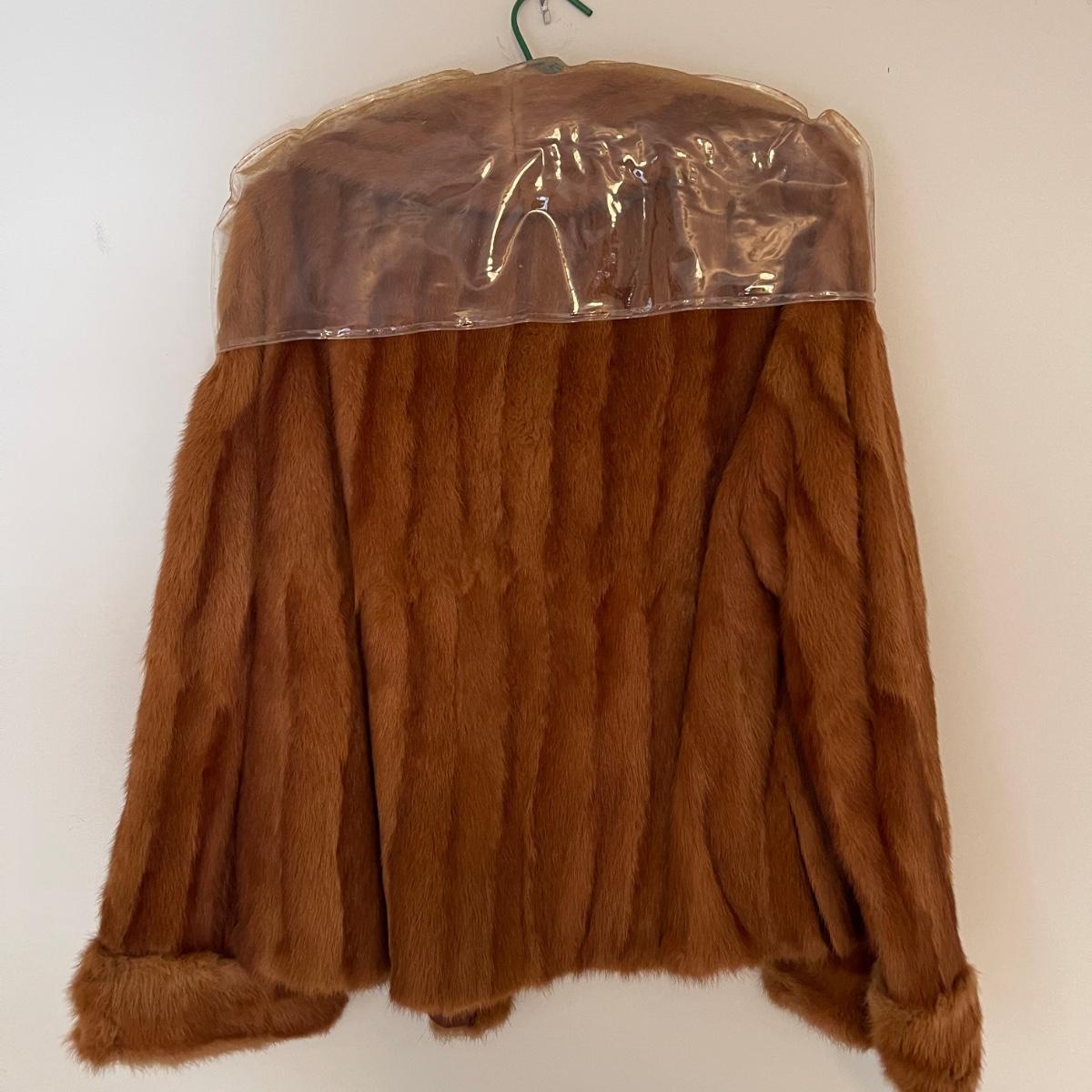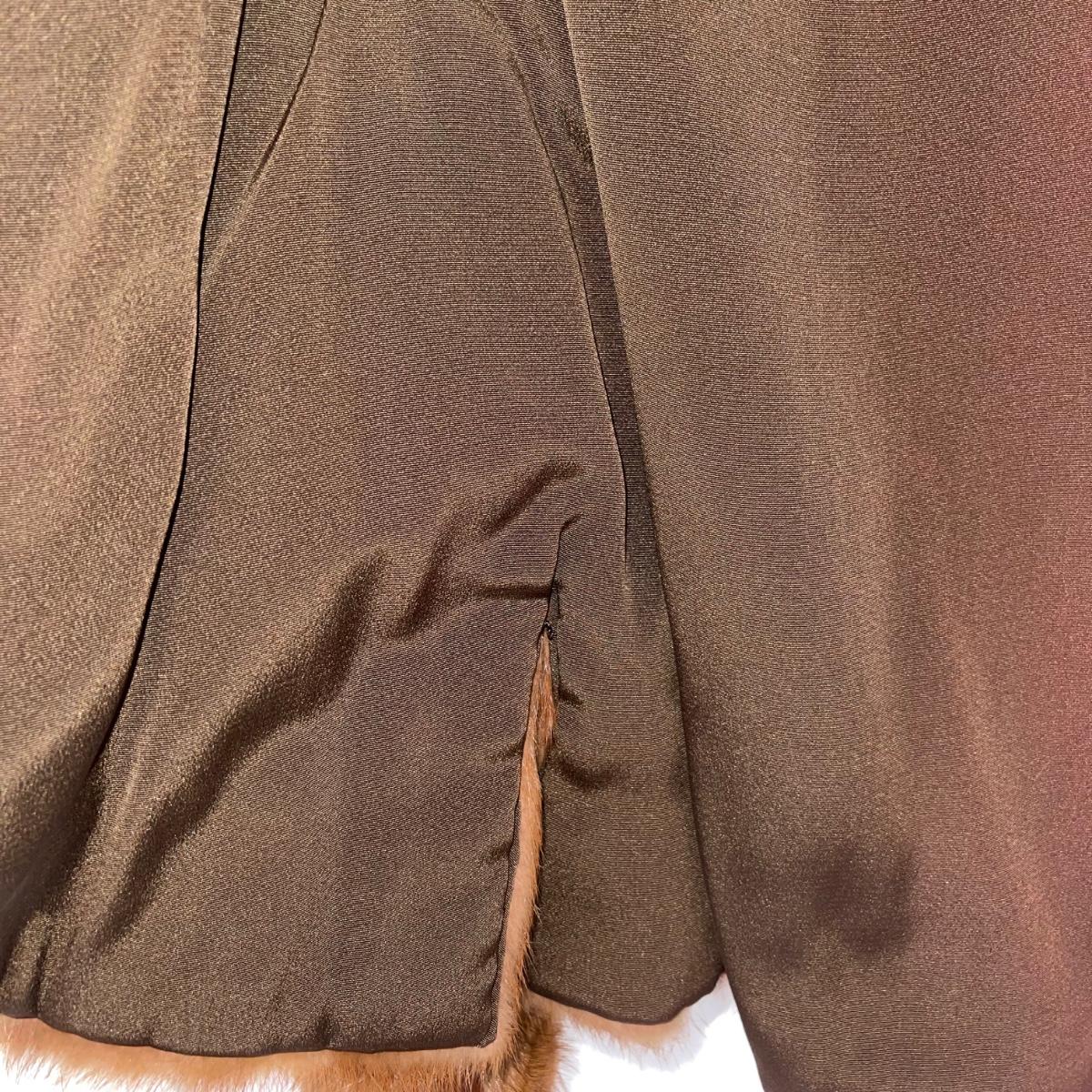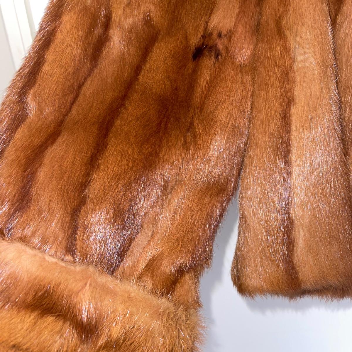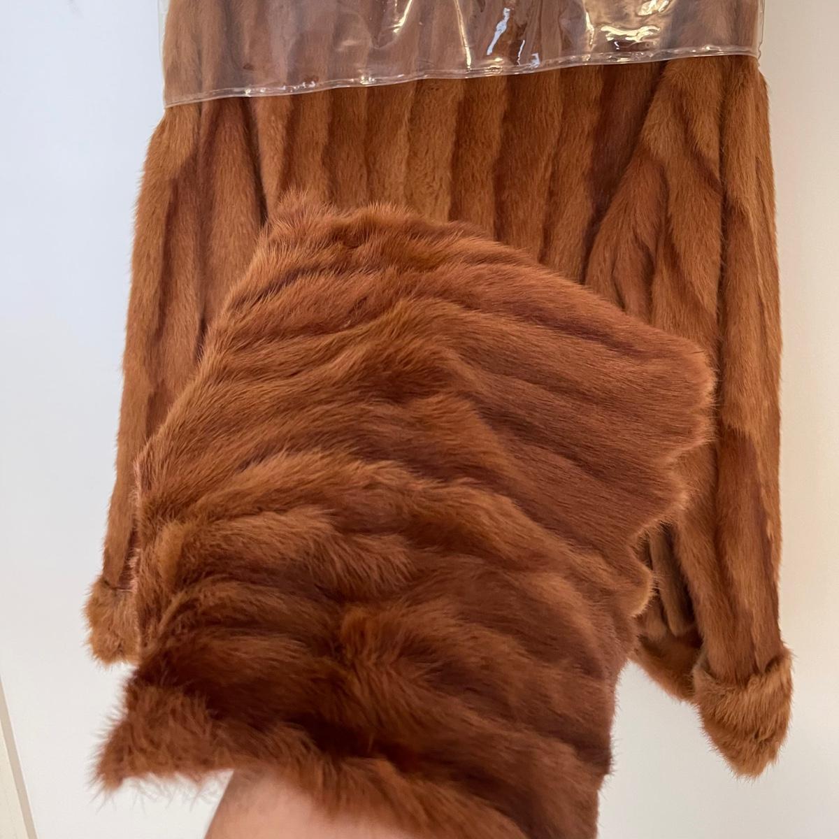 Enman’s mink coat with a personalized monogram on the interior. The fur is a medium brown with a darker brown interior. There is an extra square of fur. Although there is no size, this coat seems to be a 10-12 size.