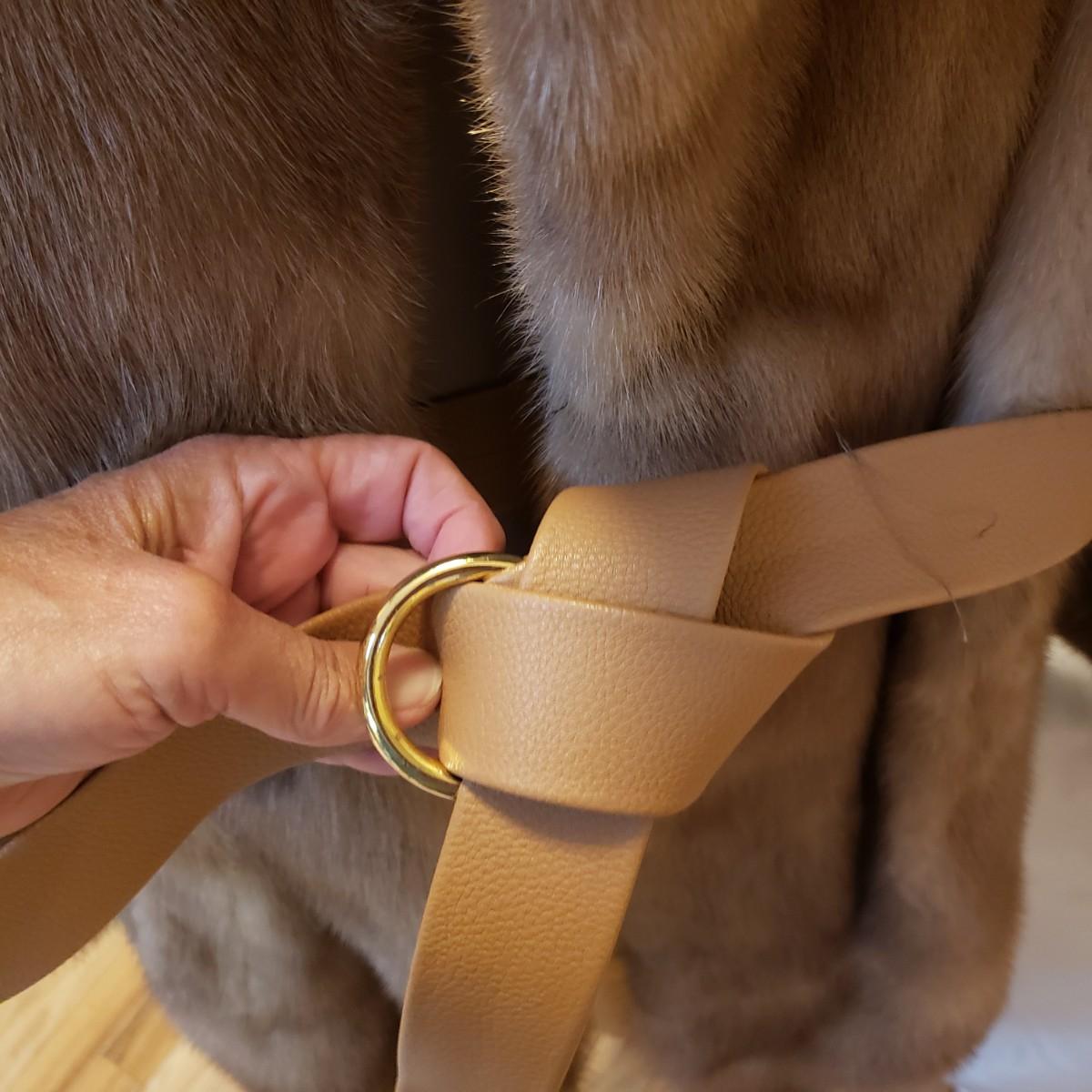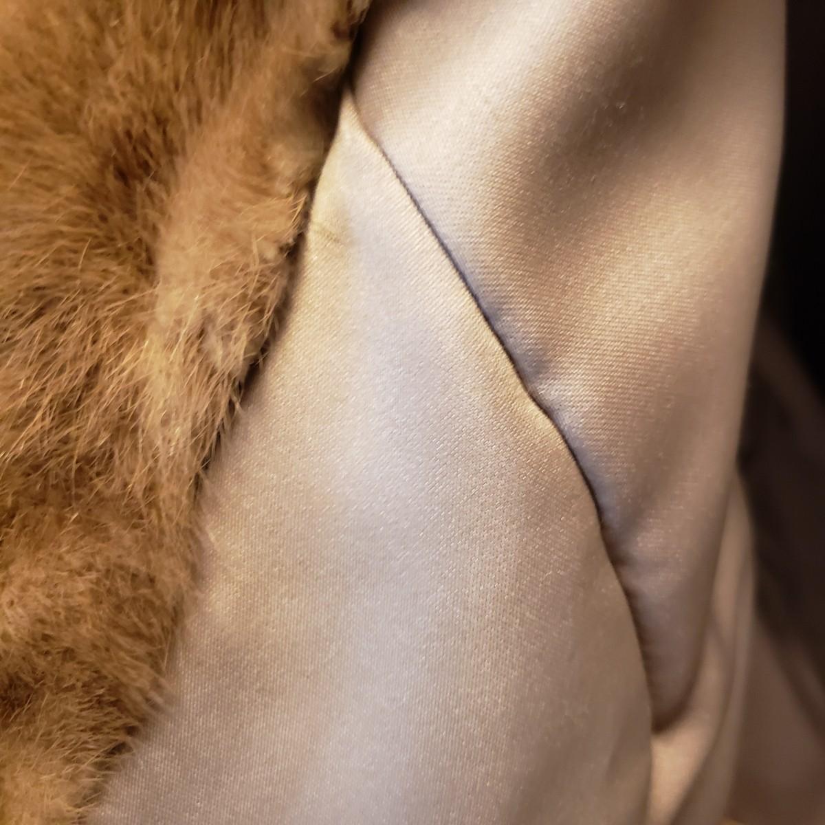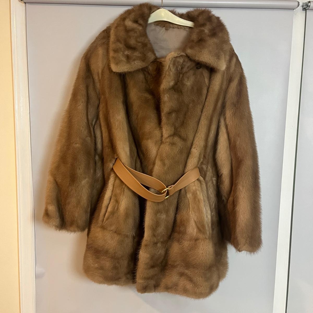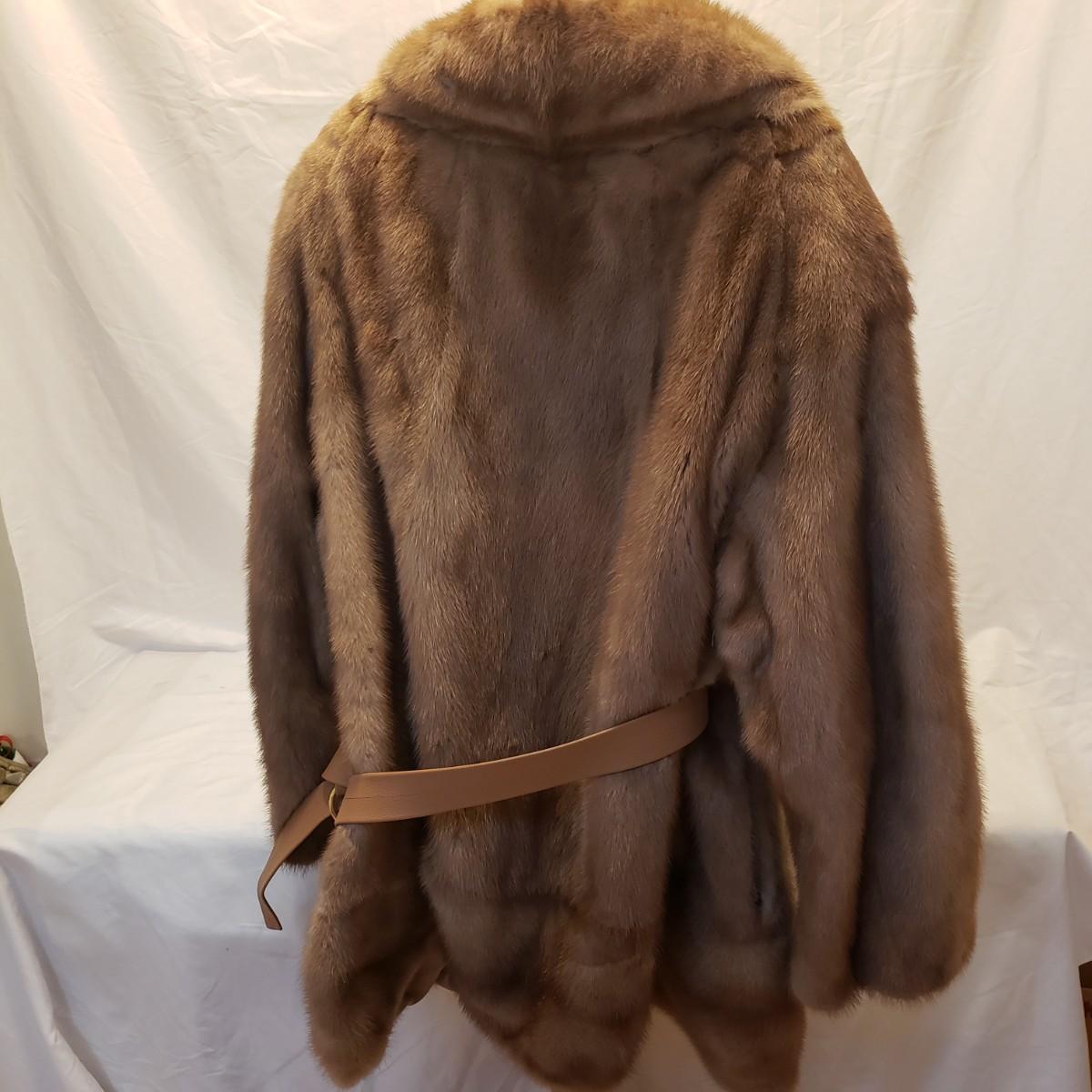 This what appears to be a Mink fur coat measures 18" from shoulder to shoulder. The length is 34". The liner is a silky material and has a faux leather belt. It also has a hook and eye to close up top.