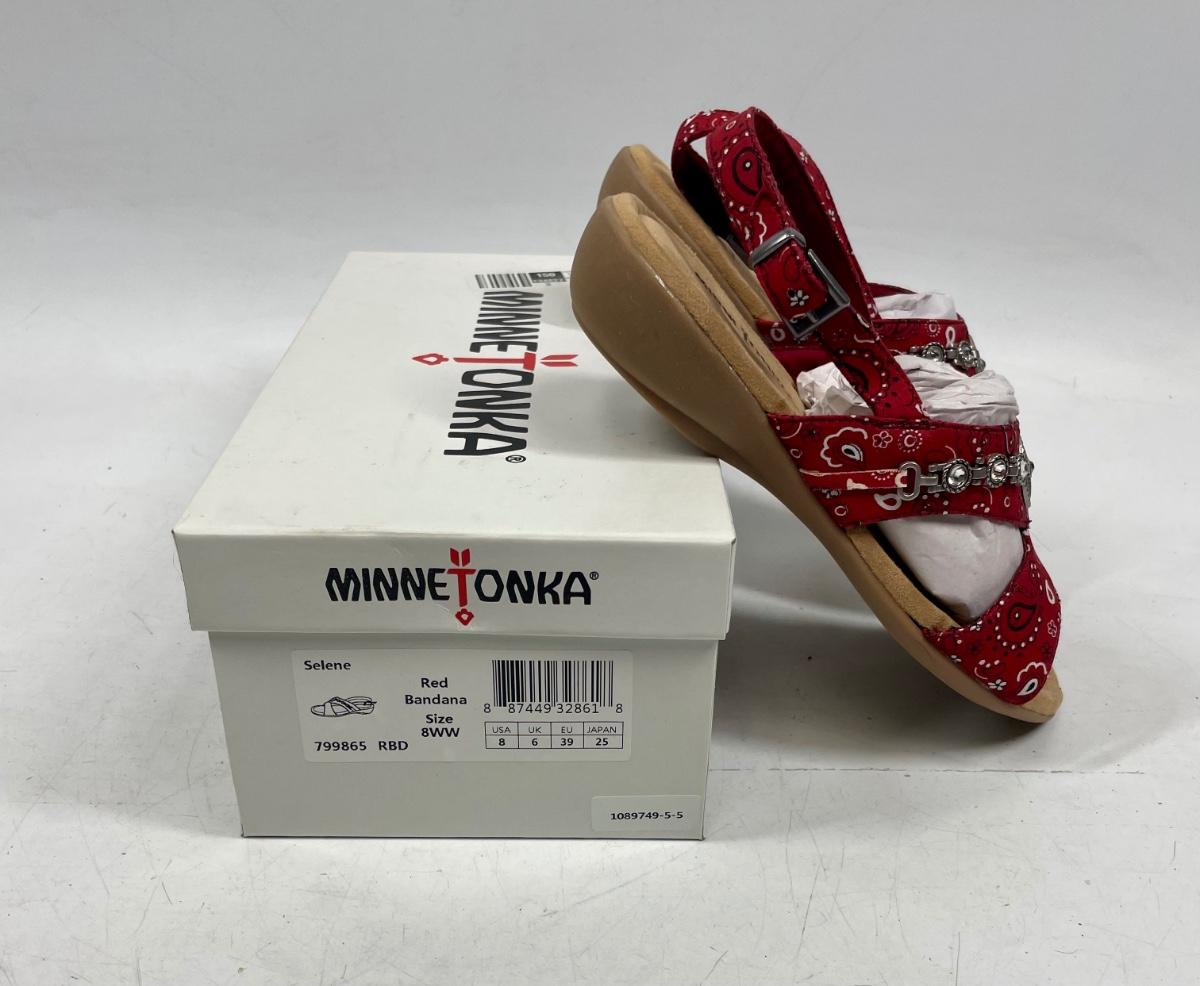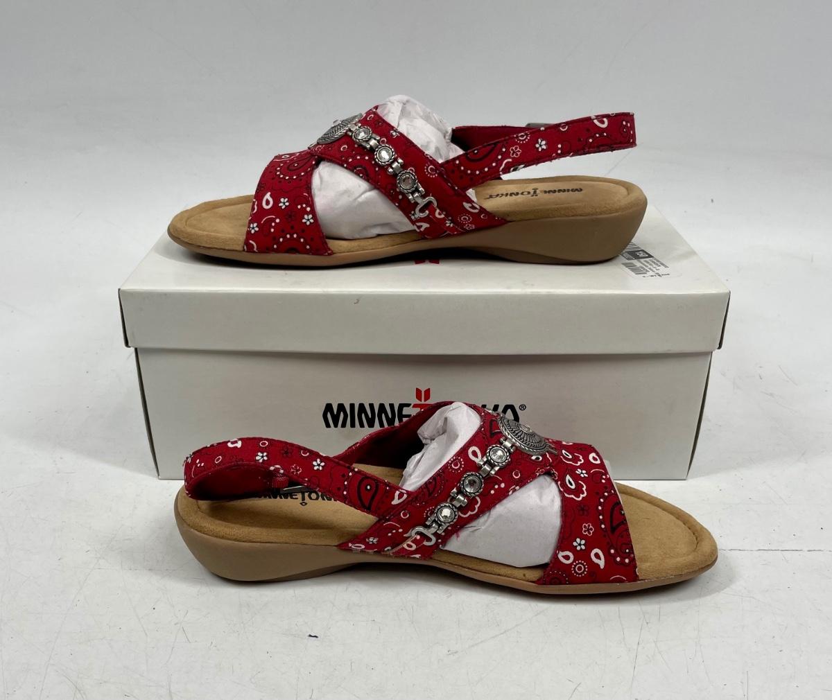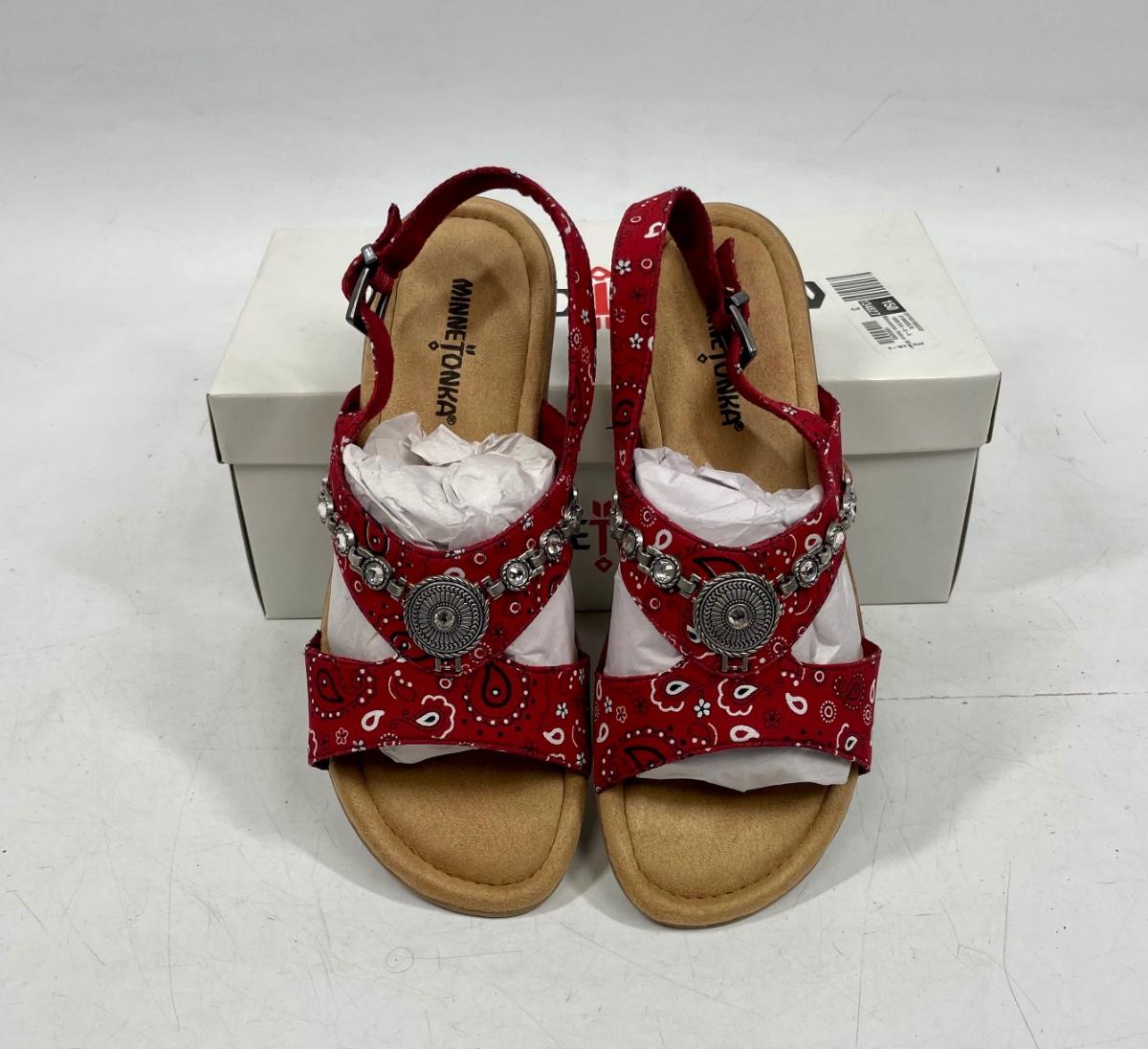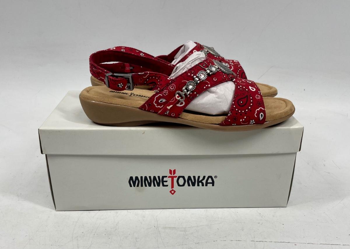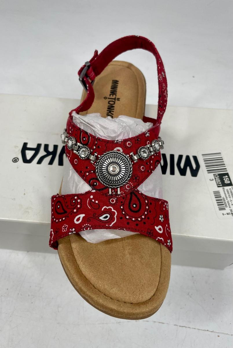 Minnetonka Women’s Red Bandana w/Silver Medallion Sandals NIB size 9 W