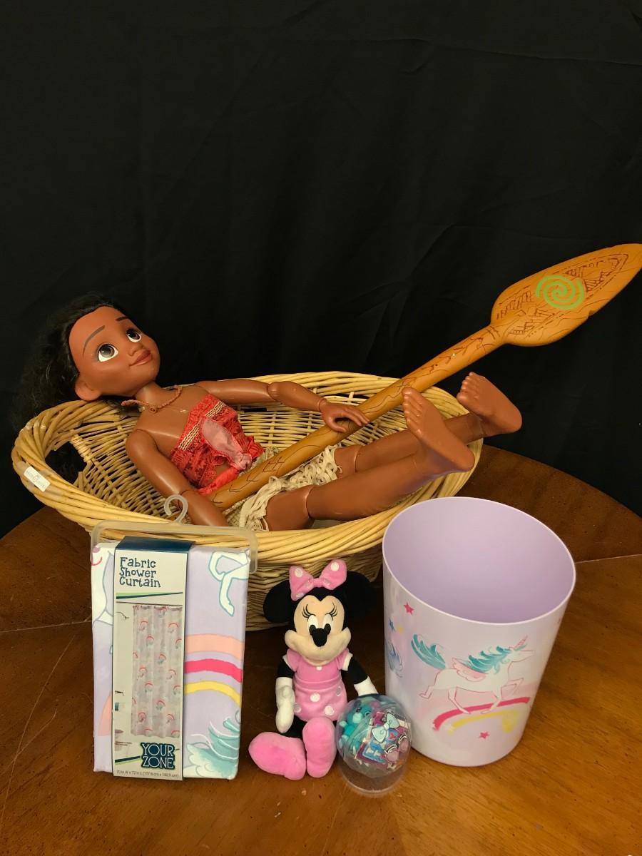 kids: minnie mouse stuffed animal, unicorn shower curtain and trash can set, moana character and basket;