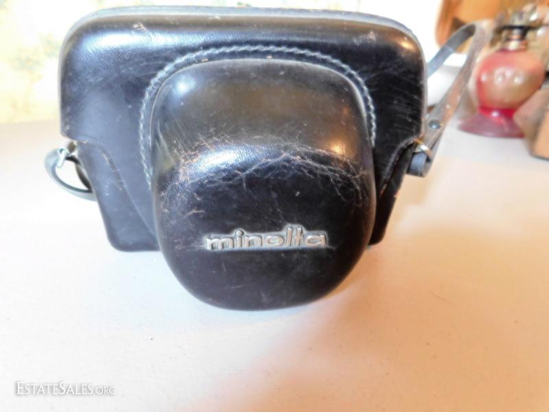 Minolta Hi-Matic 7s with leather carry case. Case has some wear and damage. Shoulder strap. Working condition unknown.